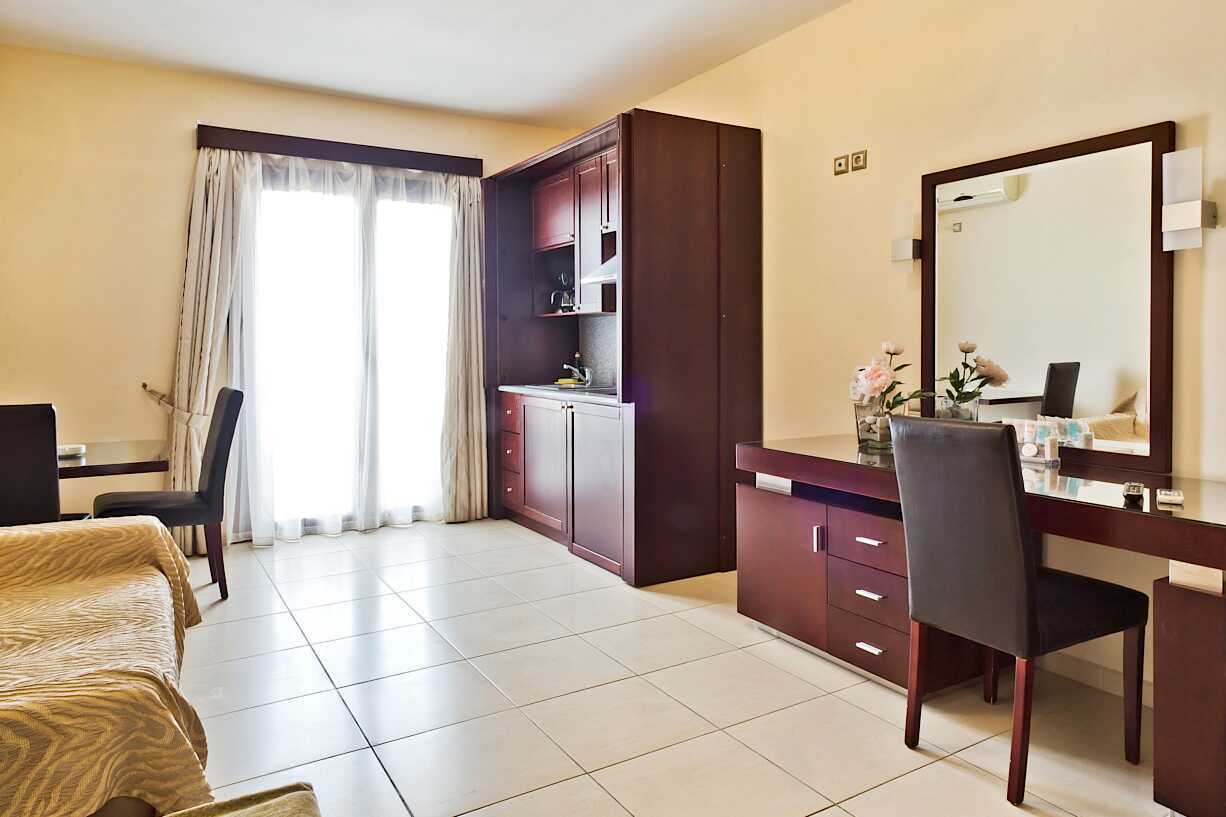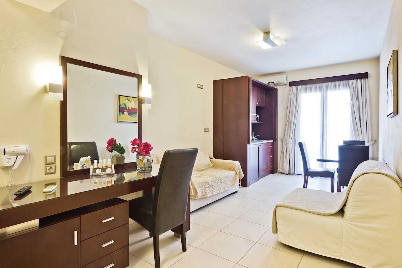 Ettromsleilighet med balkong. Soverom kombinert med minikjøkken. En dobbeltseng eller to enkeltsenger. Mulig med ekstraseng i sovesofa. Minikjøkken med kokeplater, kjøleskap, kaffetrakter, vannkoker og enkelt kjøkkenutstyr. Wifi, luftkondisjonering og safe inkludert. TV. Hårføner og tøfler. Badekar eller dusj samt wc. Rengjøring 6 ggr/uke.