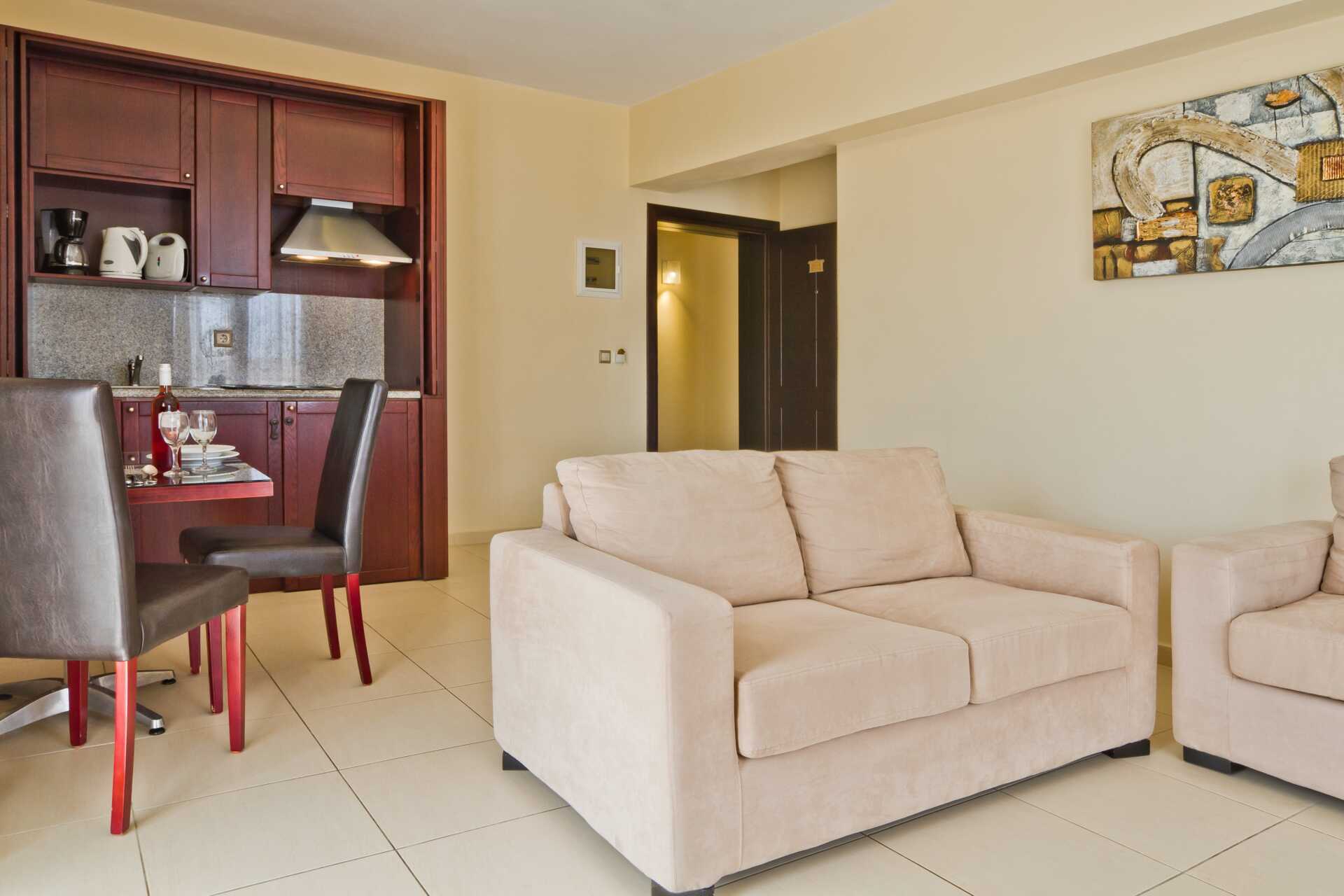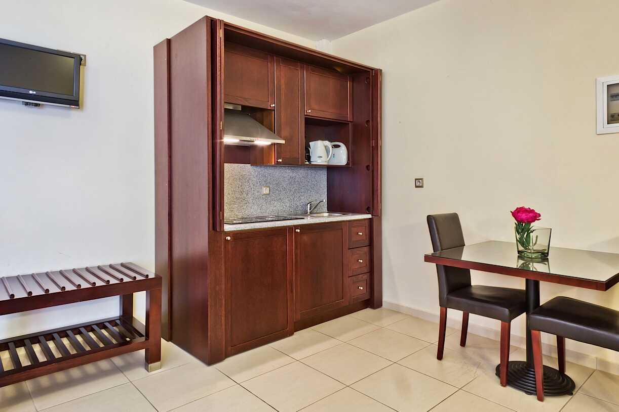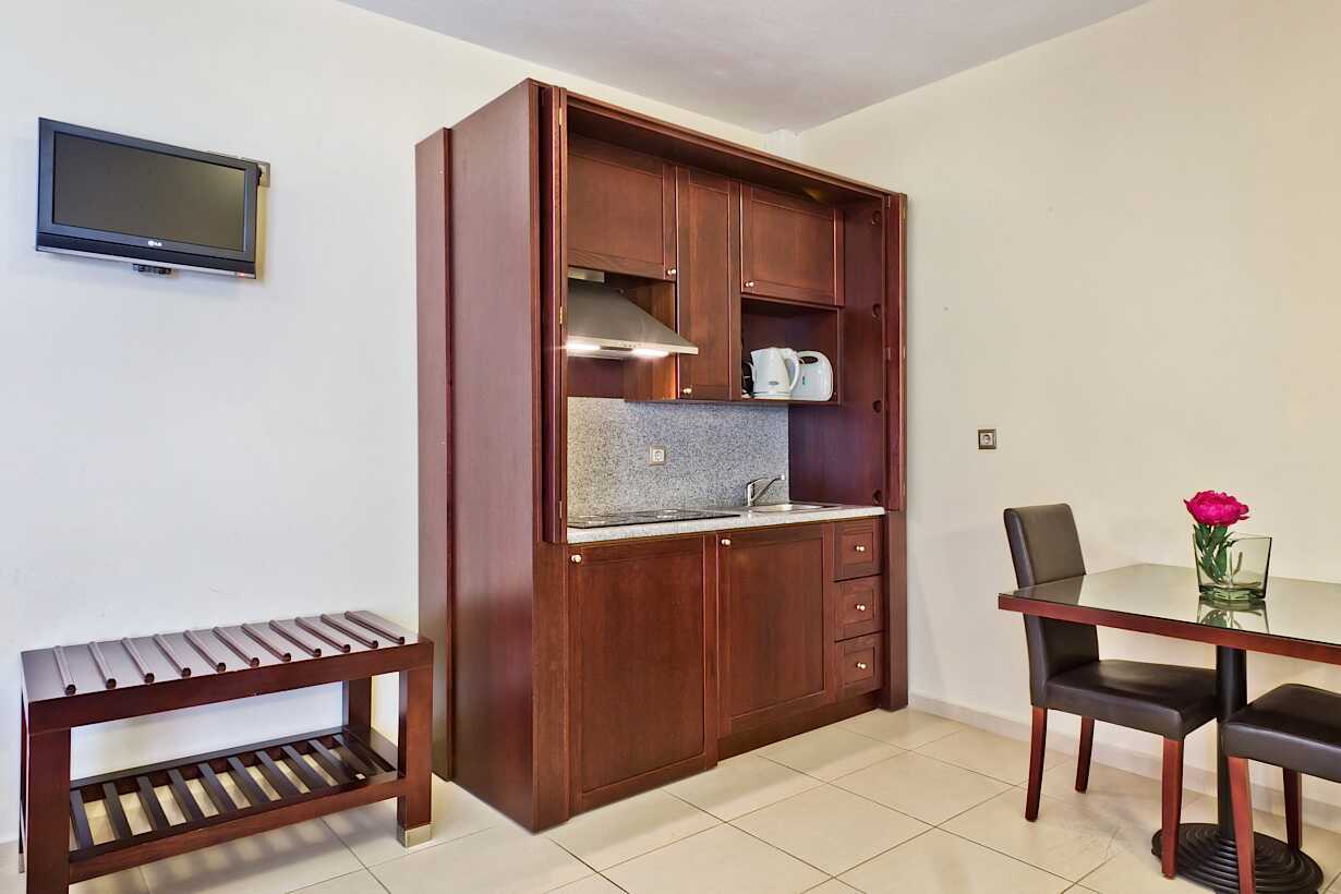 Toromsleilighet med balkong. Soverom og stue med minikjøkken. En dobbeltseng eller to enkeltsenger. Mulig med ekstraseng i sovesofa. Minikjøkken med kokeplater, kjøleskap, kaffetrakter, vannkoker og enkelt kjøkkenutstyr. Wifi, luftkondisjonering og safe inkludert. TV. Hårføner og tøfler. Badekar eller dusj samt wc. Rengjøring 6 ggr/uke.