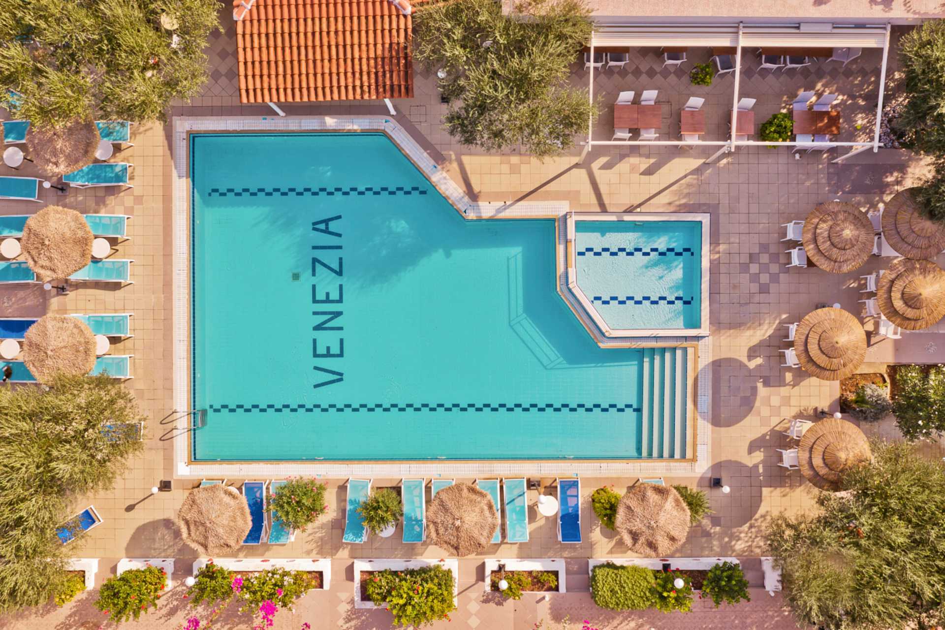 Venezia har et bassengområde med et basseng og et separat barnebasseng. Solsenger, parasoller og bassenghåndklær. Poolbar.