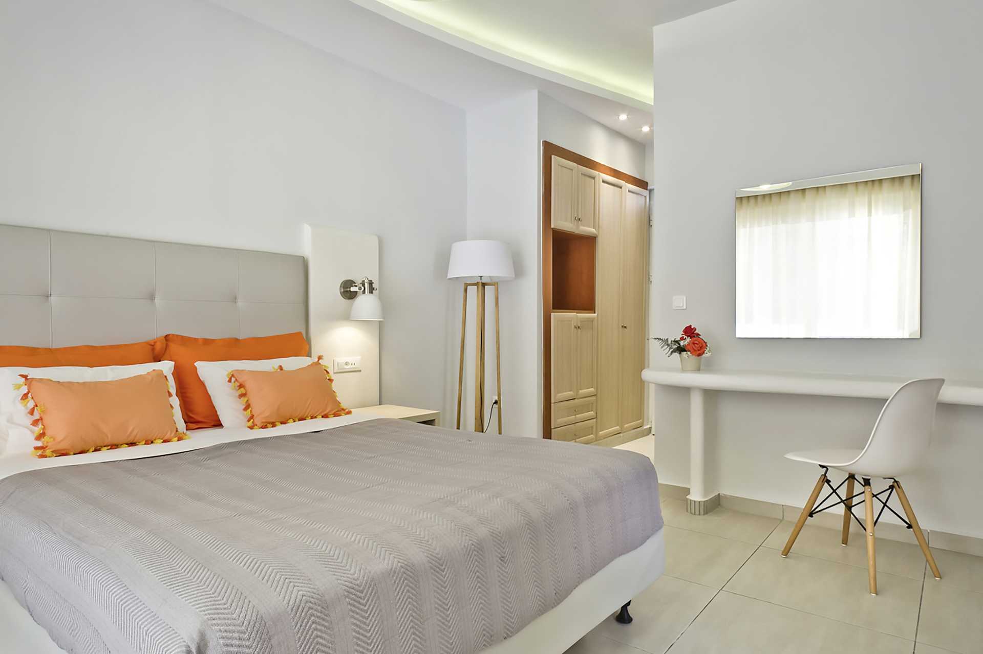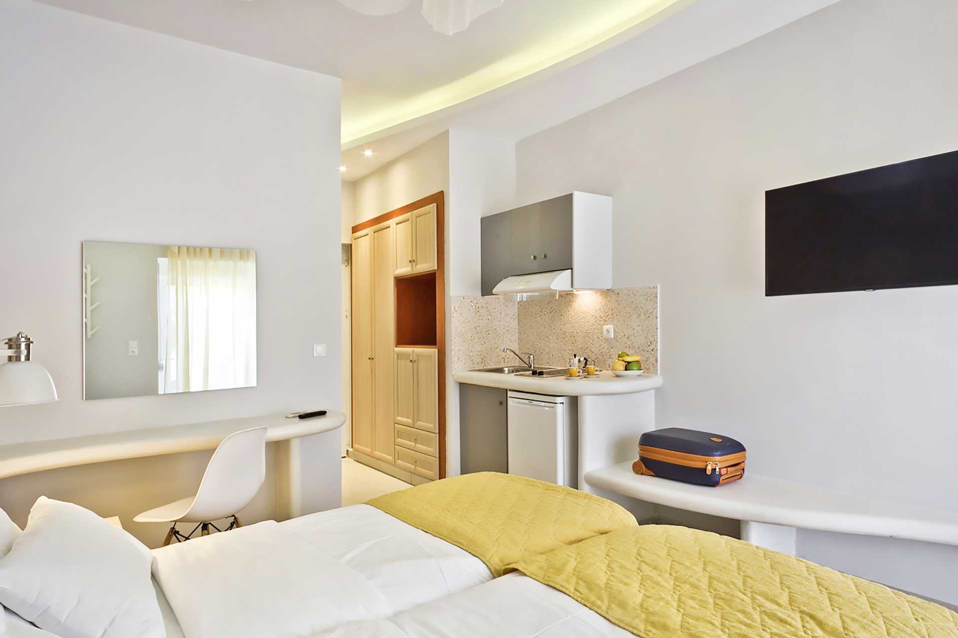 Ettromsleilighet med balkong eller markterrasse. Minikjøkken. En dobbeltseng eller to enkeltsenger. Mulig med ekstraseng i sovesofa. Minikjøkken med kokeplater, kjøleskap, brødrister og enkelt kjøkkenutstyr. Wifi og safe inkludert. Luftkondisjonering mot avgift. TV. Hårføner. Dusj og wc. Rengjøring 6 ggr/uke. Barn under 2 år regnes inn i maksantallet i rommet.