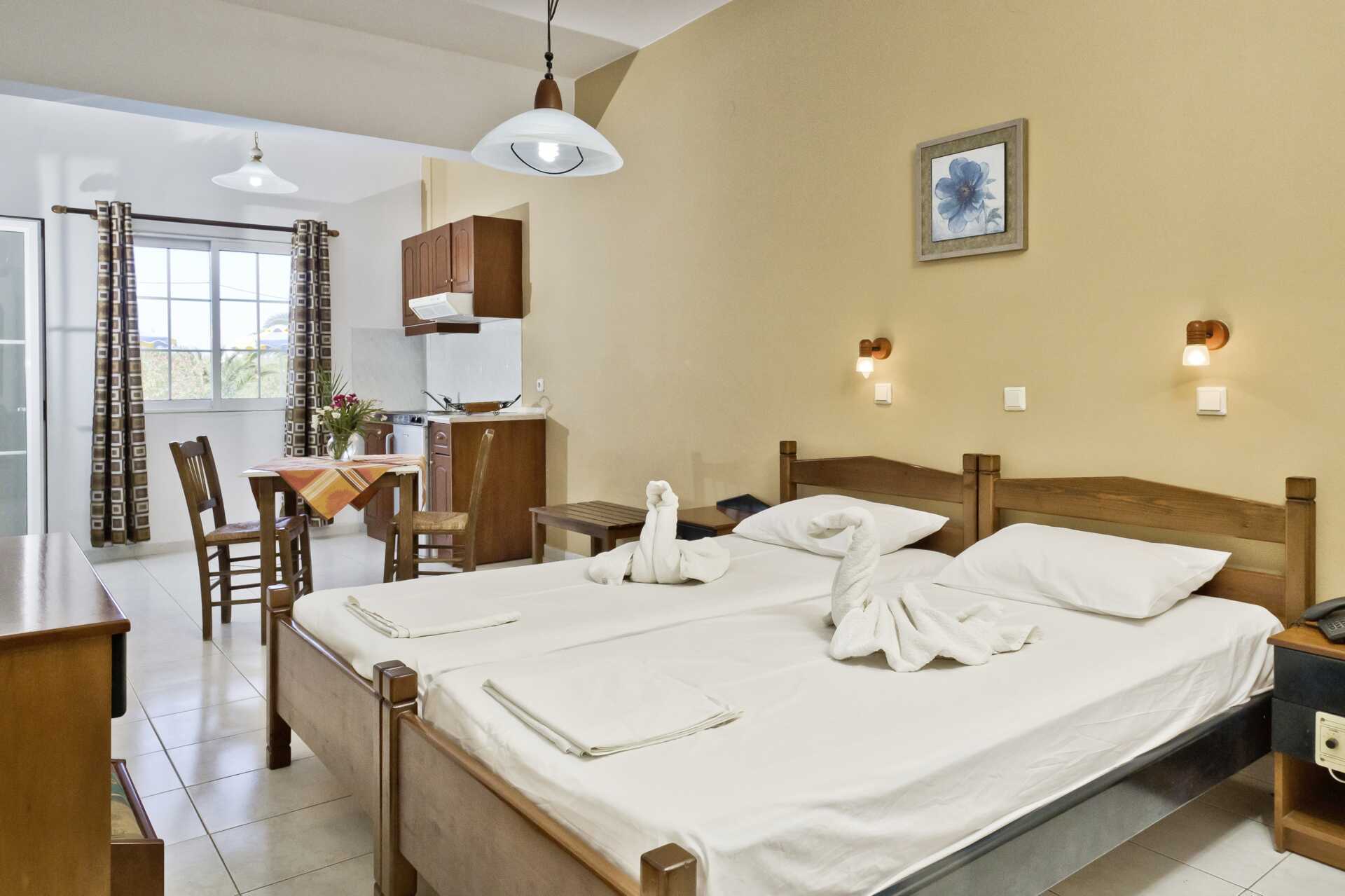 Ettromsleiligheter med balkong eller markbalkong og bassengutsikt eller uten uteplass. To enkeltsenger. Mulig med ekstraseng i sovesofa eller feltseng. Minikjøkken med kokeplater, kjøleskap, vannkoker, smørbrødgrill og enkelt kjøkkenutstyr. Wifi inkludert. Luftkondisjonering mot avgift. TV. Dusj og wc. Rengjøring 6 ggr/uke.