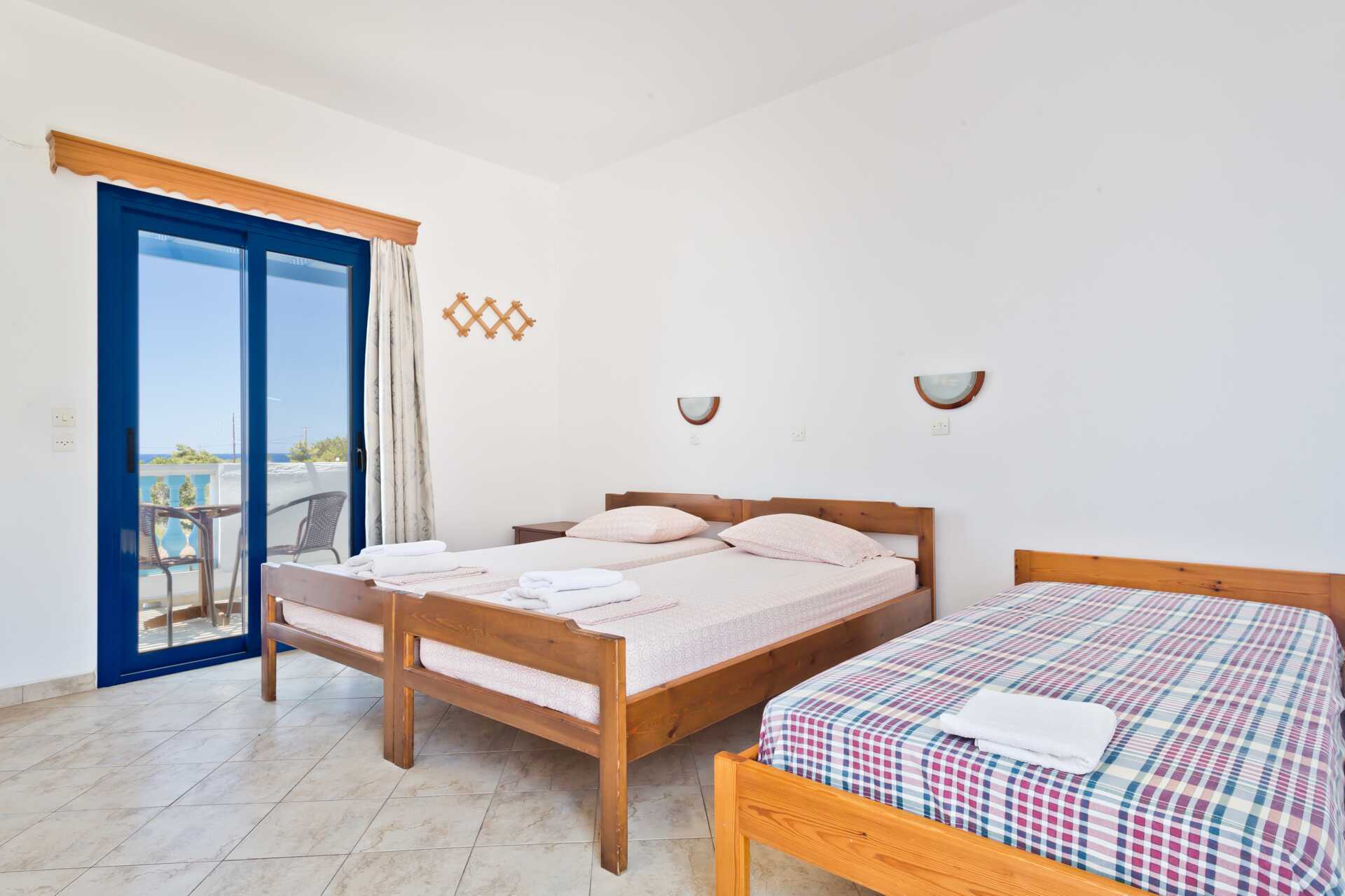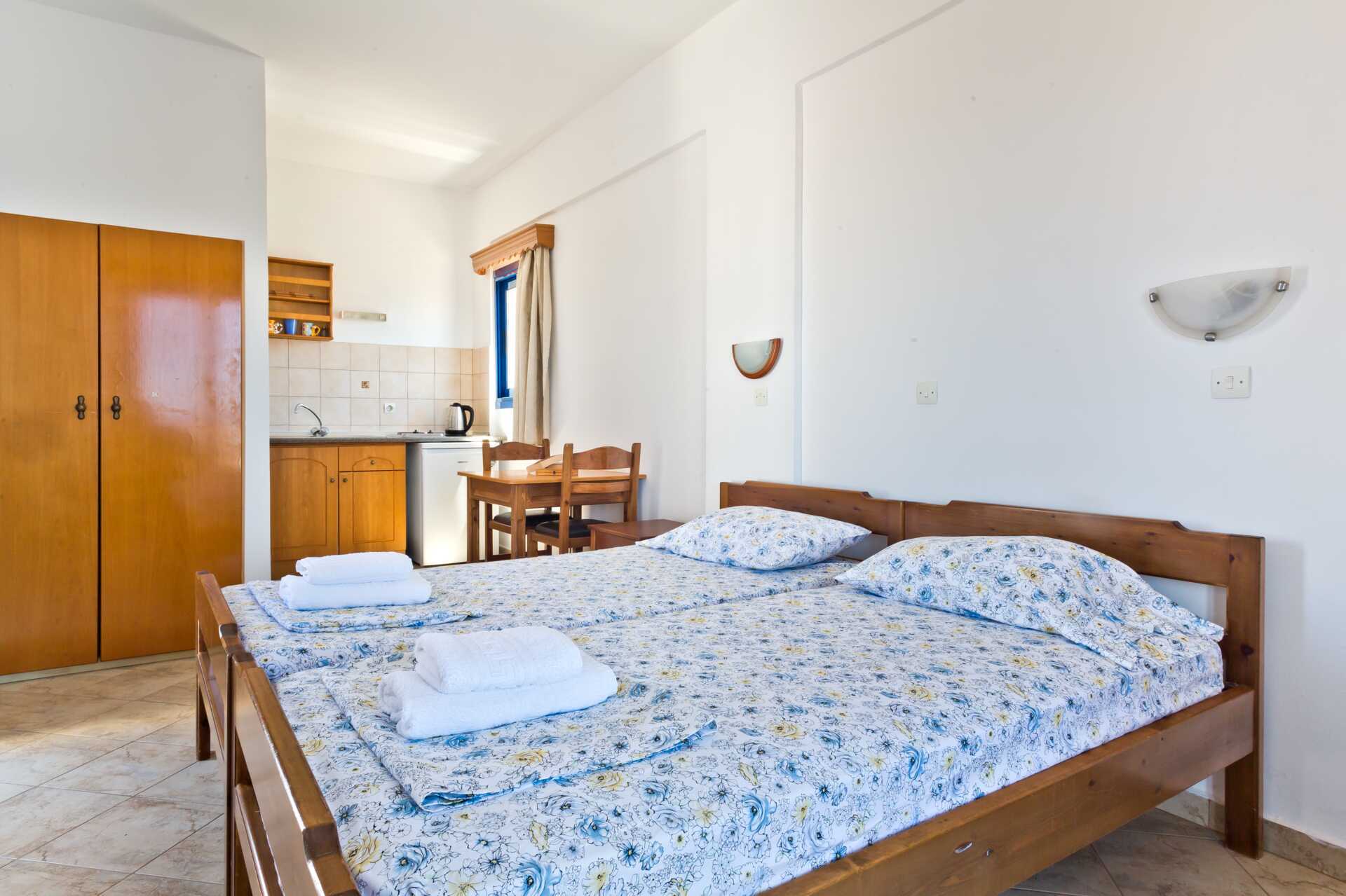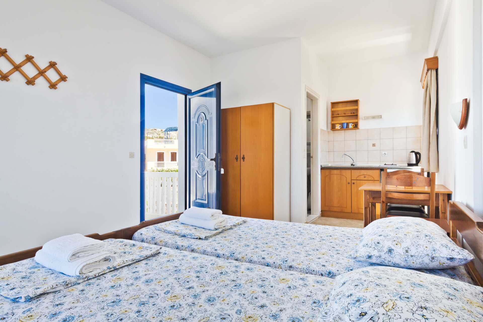 Ettromsleilighet med balkong og havutsikt. Minikjøkken. To enkeltsenger. Mulig med ekstraseng i enkeltseng i noen leiligheter. Minikjøkken med kjøleskap, kokeplater, kaffetrakter, vannkoker og enkelt kjøkkenutstyr. Wifi inkludert. Luftkondisjonering og safe mot avgift. Dusj og wc. Rengjøring 6 ggr/uke.