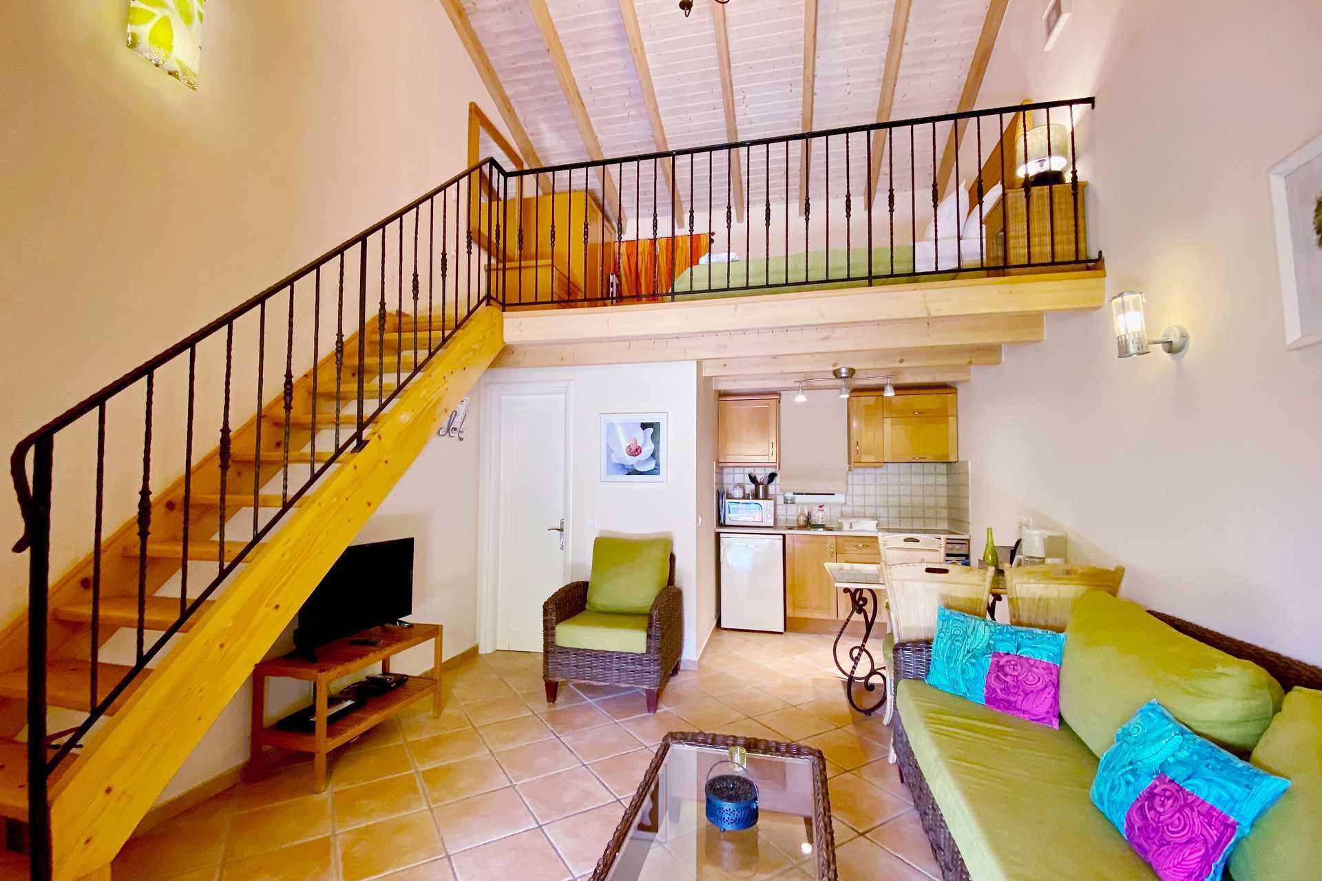 Ettromsleilighet i etasje og markterrasse. I entréetasjen er det kombinert stue med minikjøkken og bad. En trapp opp er det sovehems med dobbeltseng. Mulighet for ekstrasenger i sovesofa i stuen. Minikjøkken med kjøleskap, kokeplater, kaffetrakter, vannkoker, brødrister og enkelt kjøkkenutstyr. Wifi, luftkondisjonering og safe inkludert. TV. Hårføner. Dusj og wc. Rengjøring 2 ggr/uke.