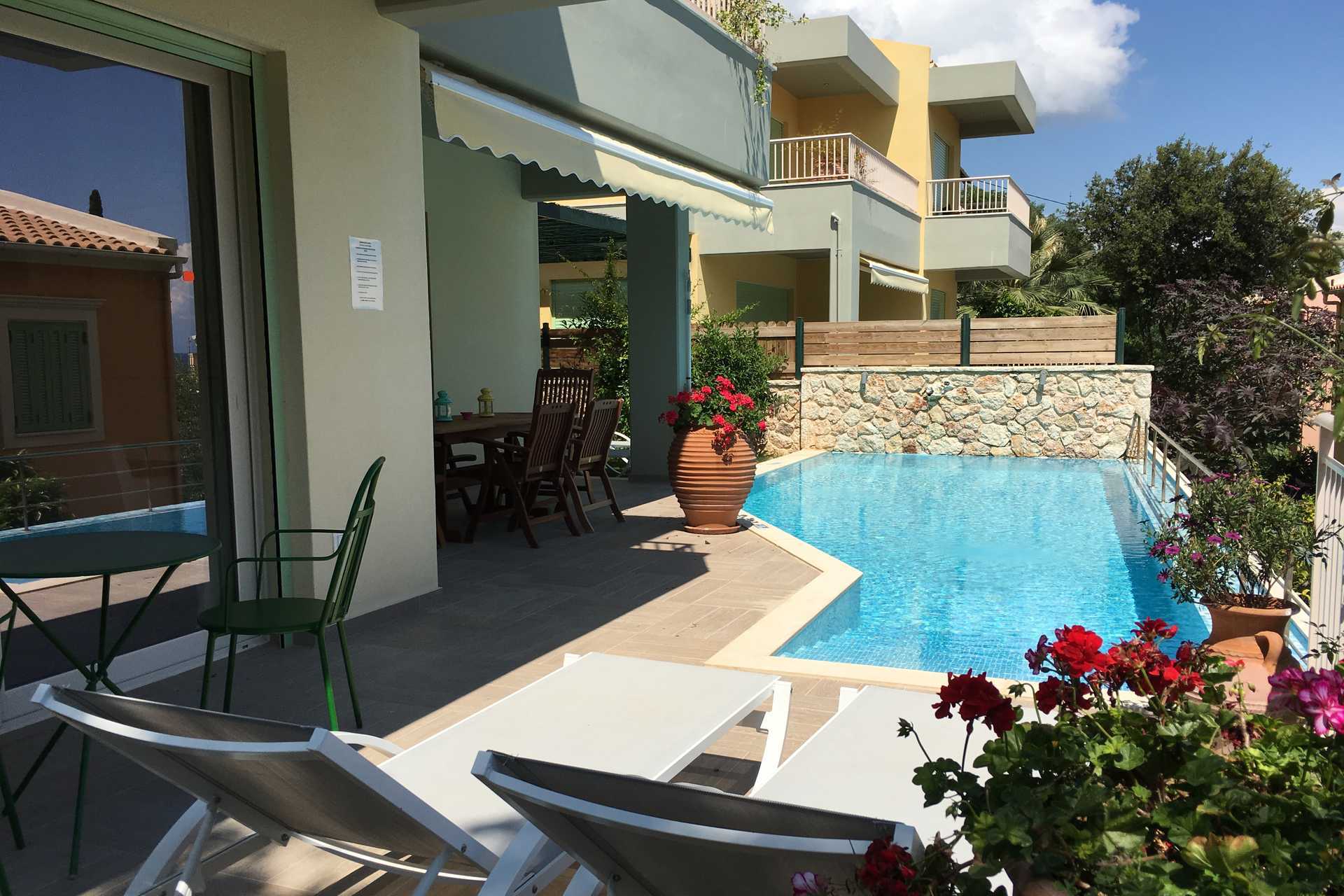 Fireromsleilighet i etasje med uteplass og eget basseng. Leilighetene ligger nært stranden. Solsenger samt stoler og bord på uteplassen. Tre soverom, et med dobbeltseng og to med to enkeltsenger i hvert. Alle soverommene har eget bad med dusj og wc. Minikjøkken med kokeplater og stekeovn, mikrobølgeovn, kjøleskap, kaffetrakter, vannkoker, brødrister, enkelt kjøkkenutstyr og oppvaskmaskin. Wifi, luftkondisjonering og safe er inkludert. Vaskemaskin. TV med lokale kanaler. Hårføner. Rengjøring 2 ggr/uke.