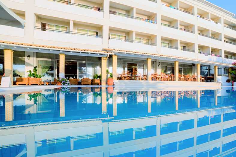 Elea Beach har en utmerket beliggenhet rett ved stranden i Dassia. Ved bassengområdet er det to basseng for voksne, ett er et ferskvannsbasseng og ett er saltvannsbasseng med jacuzzi. Det er også et separat barnebasseng ved et av bassengene. Solsenger og parasoller. Basseng- og strandhåndklær mot depositum.