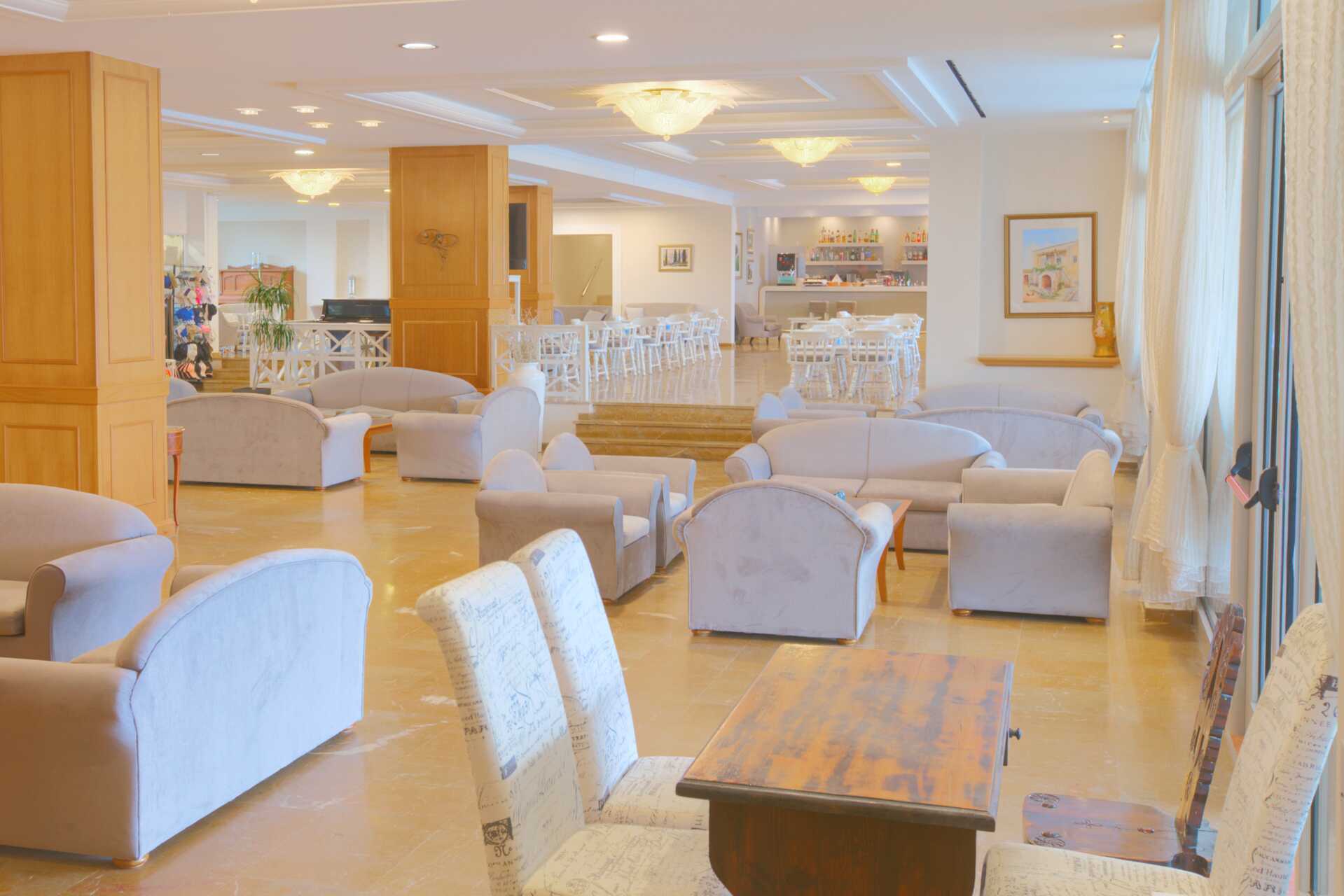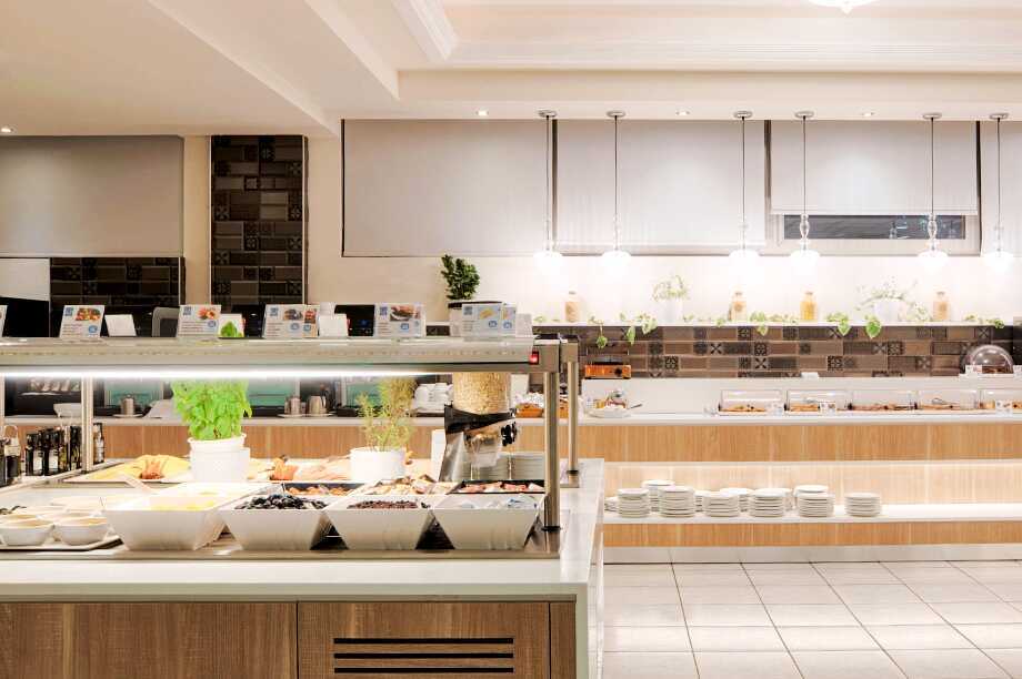 Bufférestauranten serverer frokost, lunsj og middag. Hvis du vil ha en drink, finnes det en bar både innendørs og utendørs. Snackbaren tilbyr enkle retter som pizza, smørbrød, kaker og iskrem. Noen kvelder har hotellet greske kvelder med underholdning og diverse aktiviteter.