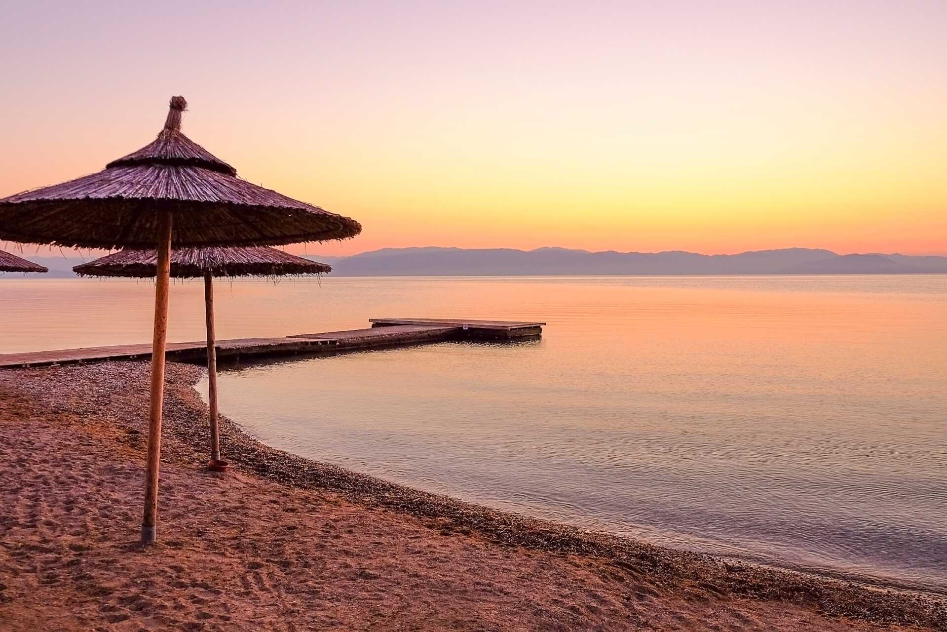 Stranden, som ligger et par hundre meter fra sentrum, er langgrunn og barnevennlig med krystallklart vann.