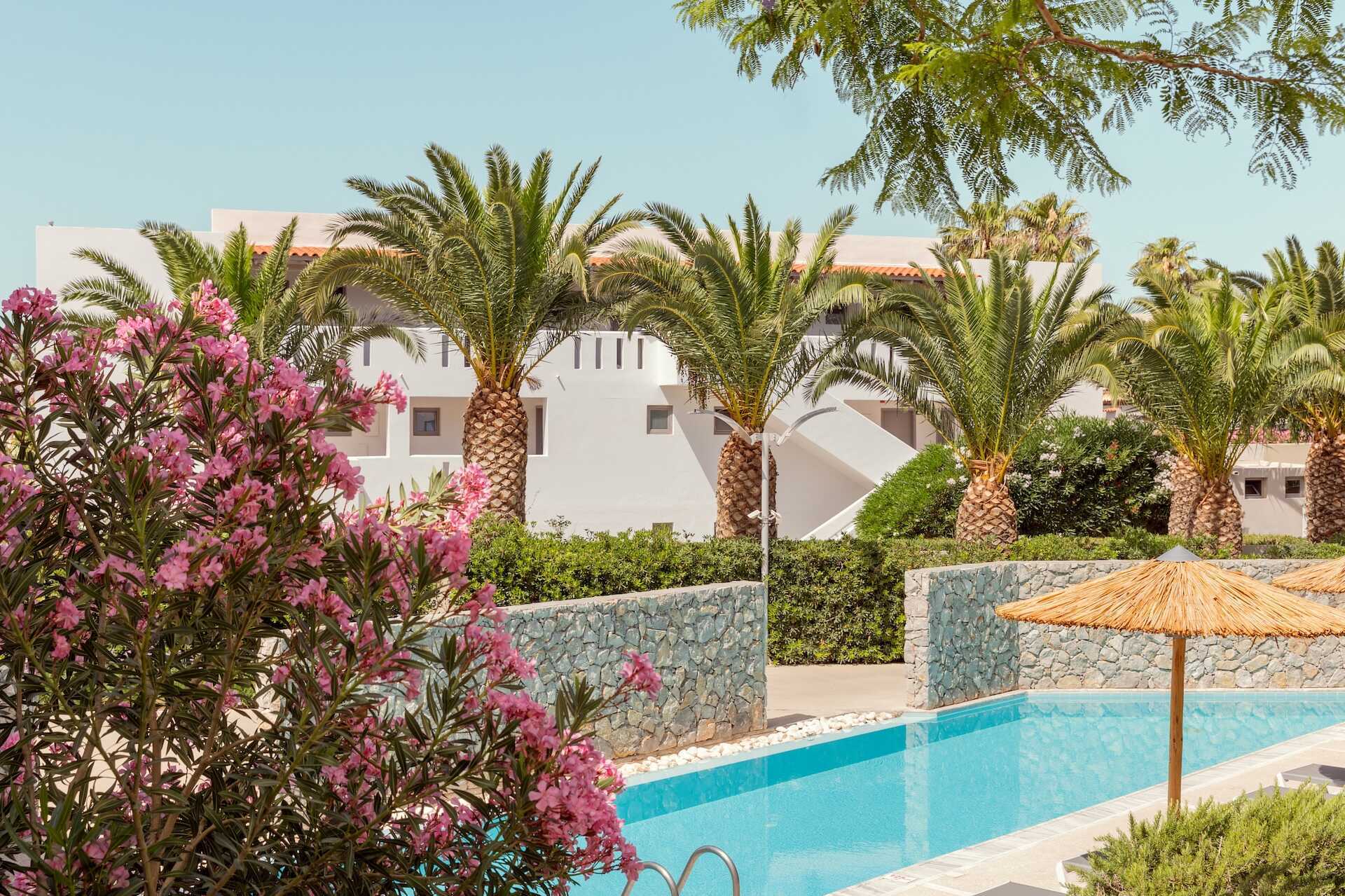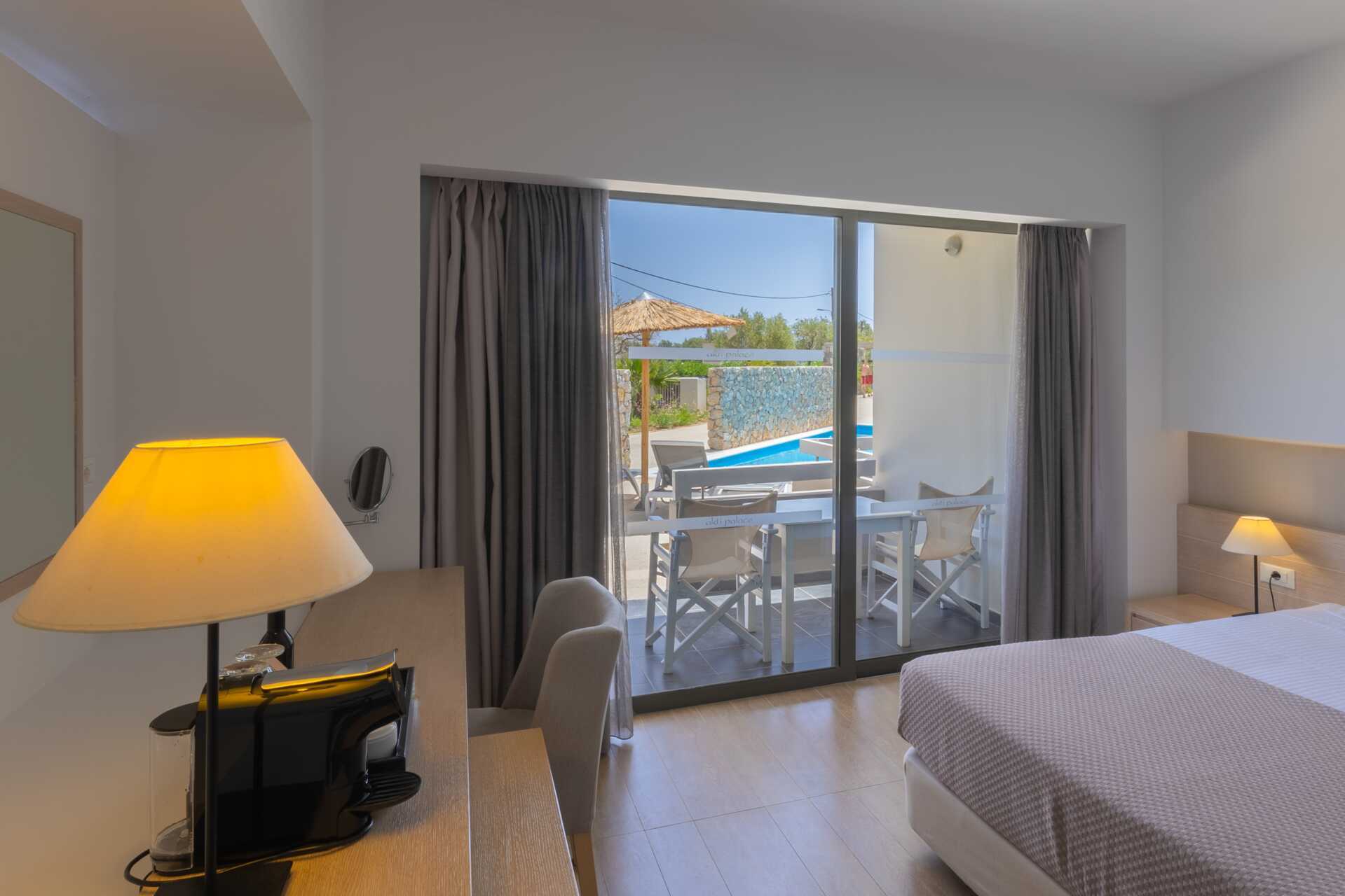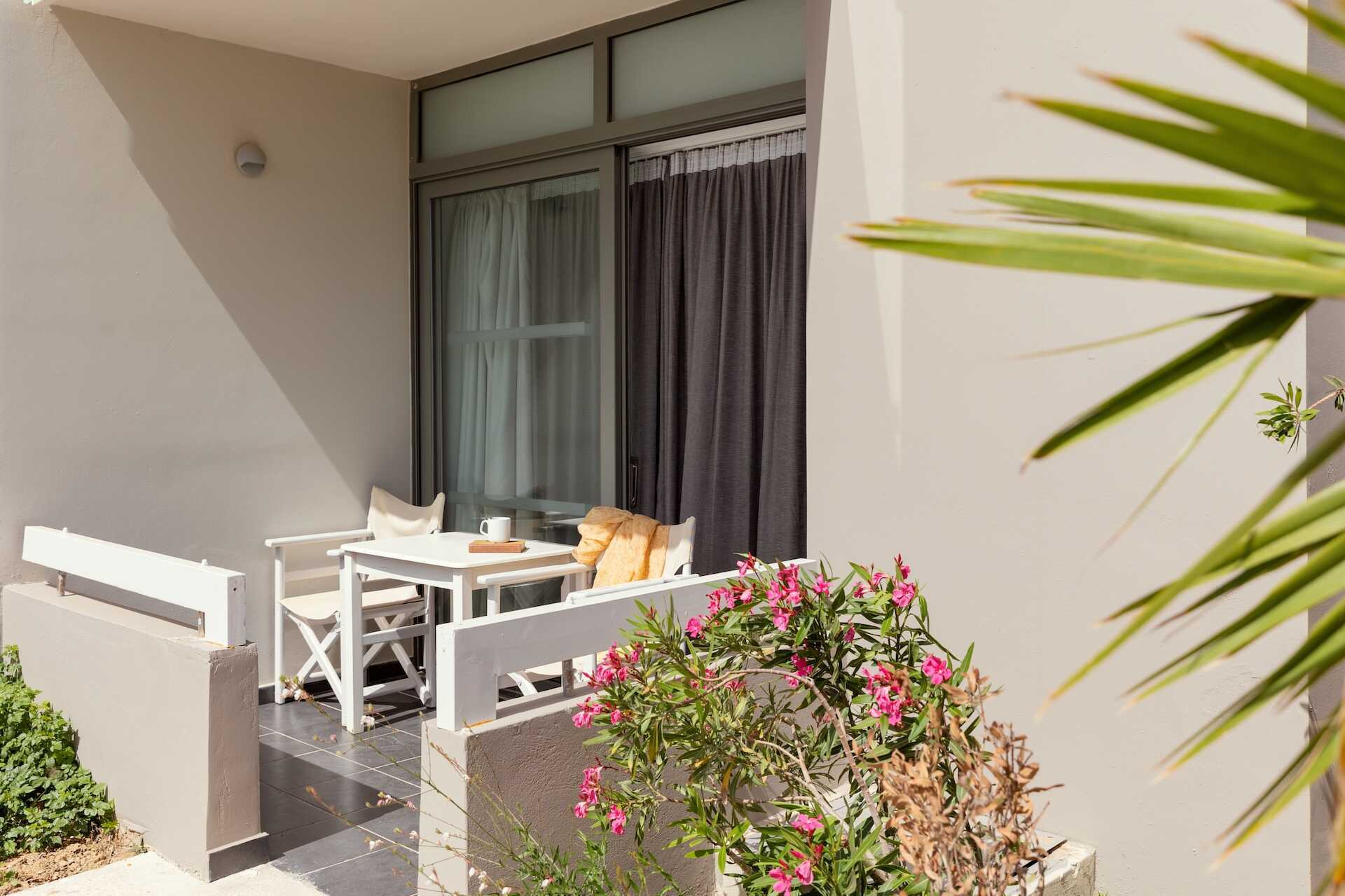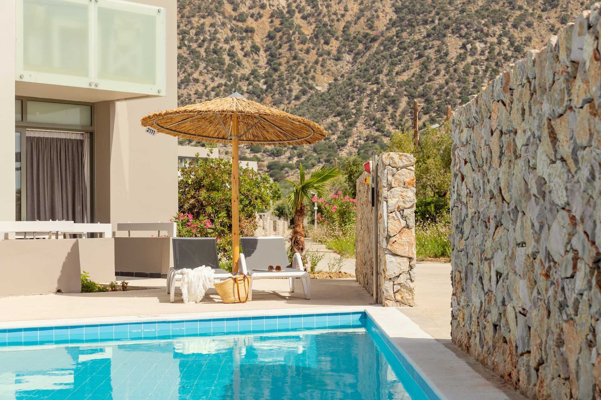 Dobbeltrom med markterrasse og utgang til delt basseng. Bassenget deles av fire dobbeltrom. En dobbeltseng eller to enkeltsenger. Mulig med ekstrasenger i sovesofa. Wifi, luftkondisjonering og safe inkludert. Vannkoker samt kaffe og te. Minibar inkludert, etterfylles hver dag med vann, vin, juice, øl og brus. TV. Hårføner. Badekar eller dusj samt wc. Rengjøring 7 ggr/uke. Barn under 2 år regnes inn i maksantallet i rommet.