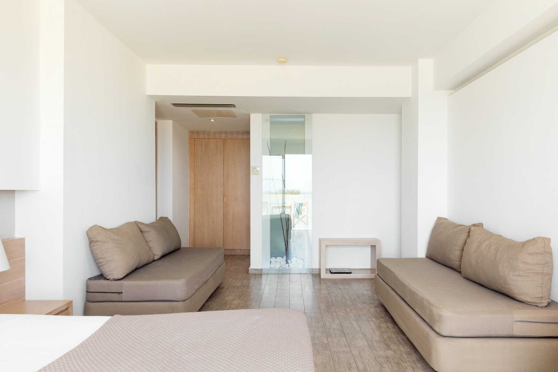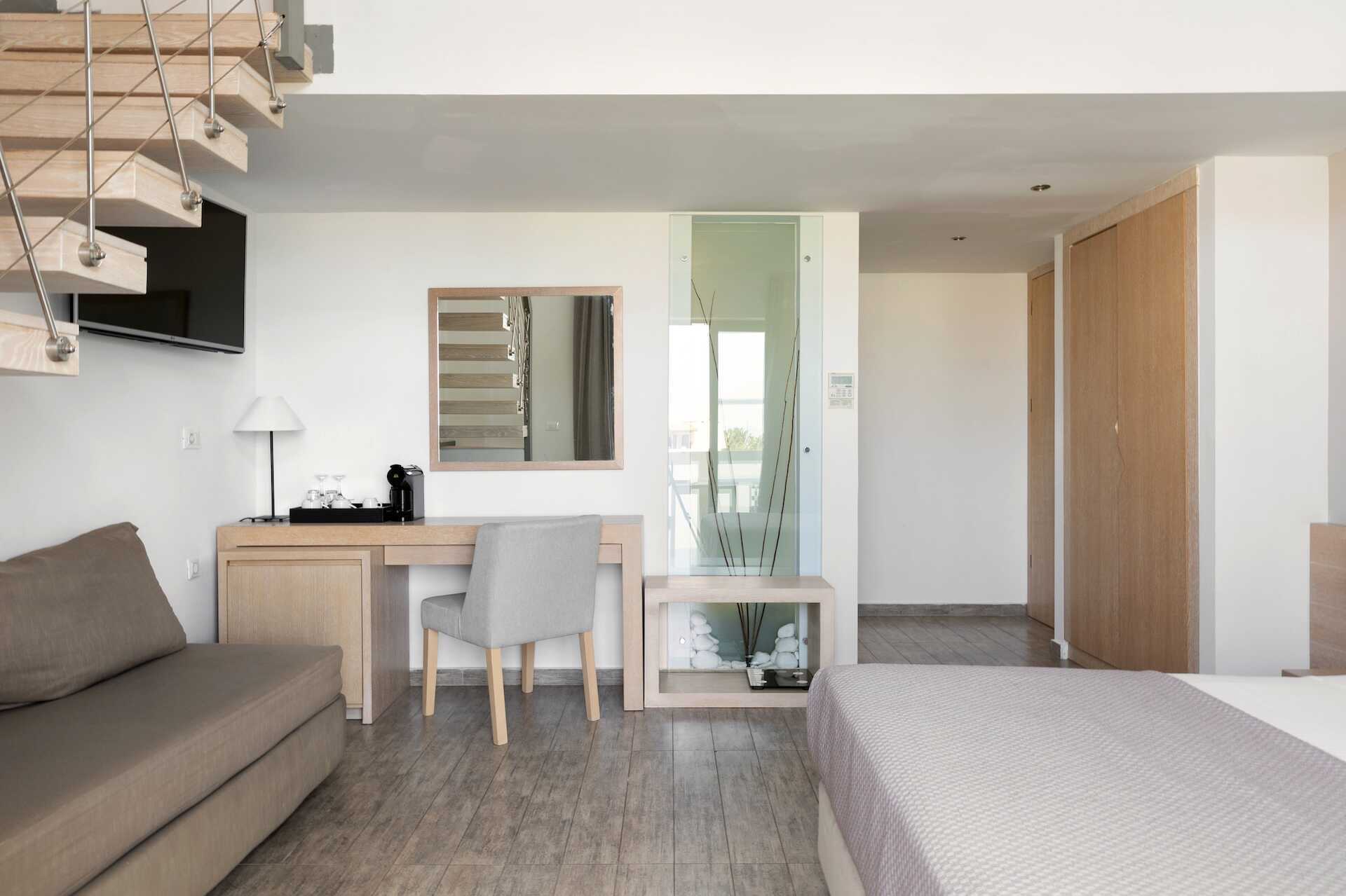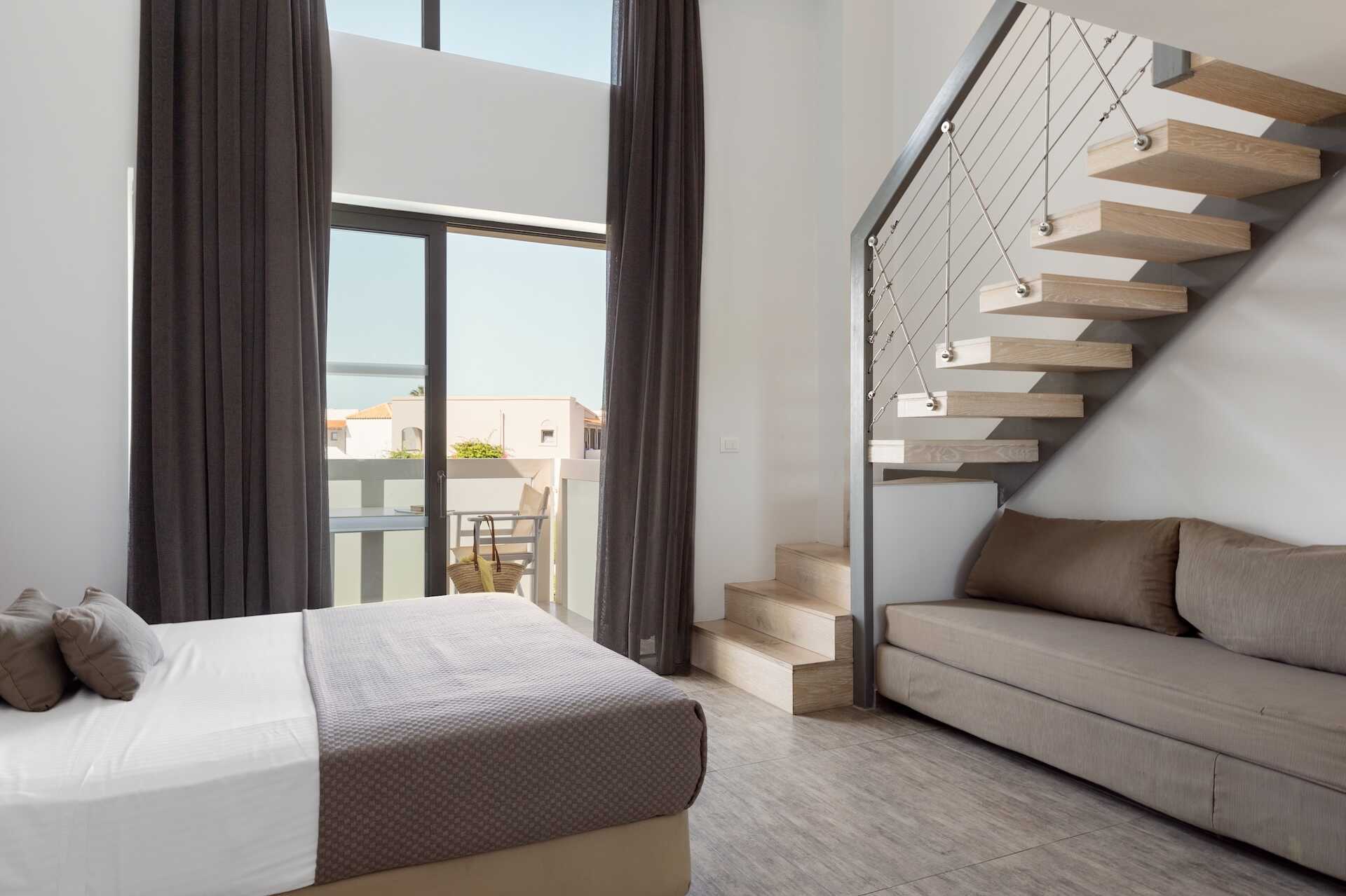 Familierom i etasje med balkong eller terrasse, noen med havutsikt. I inngangsetasjen er det en dobbeltseng og mulig med ekstraseng i sovesofa, samt bad med hårføner, badekar eller dusj og wc. En trapp opp er det en sovehems med to enkeltsenger og bad med dusj, wc og hårføner. Det er en dør mellom etasjene. Wifi, luftkondisjonering og safe inkludert. Minibar inkludert, etterfylles hver dag med vann, vin, juice, øl og brus. Vannkoker samt kaffe og te. TV. Rengjøring 7 ggr/uke. Barn under 2 år regnes inn i maksantallet i rommet.