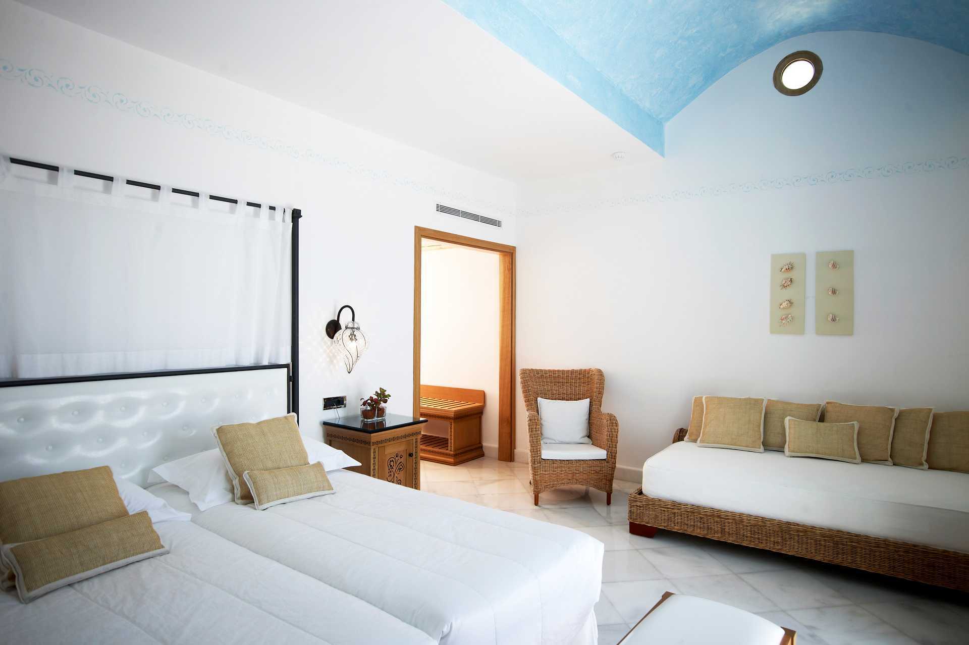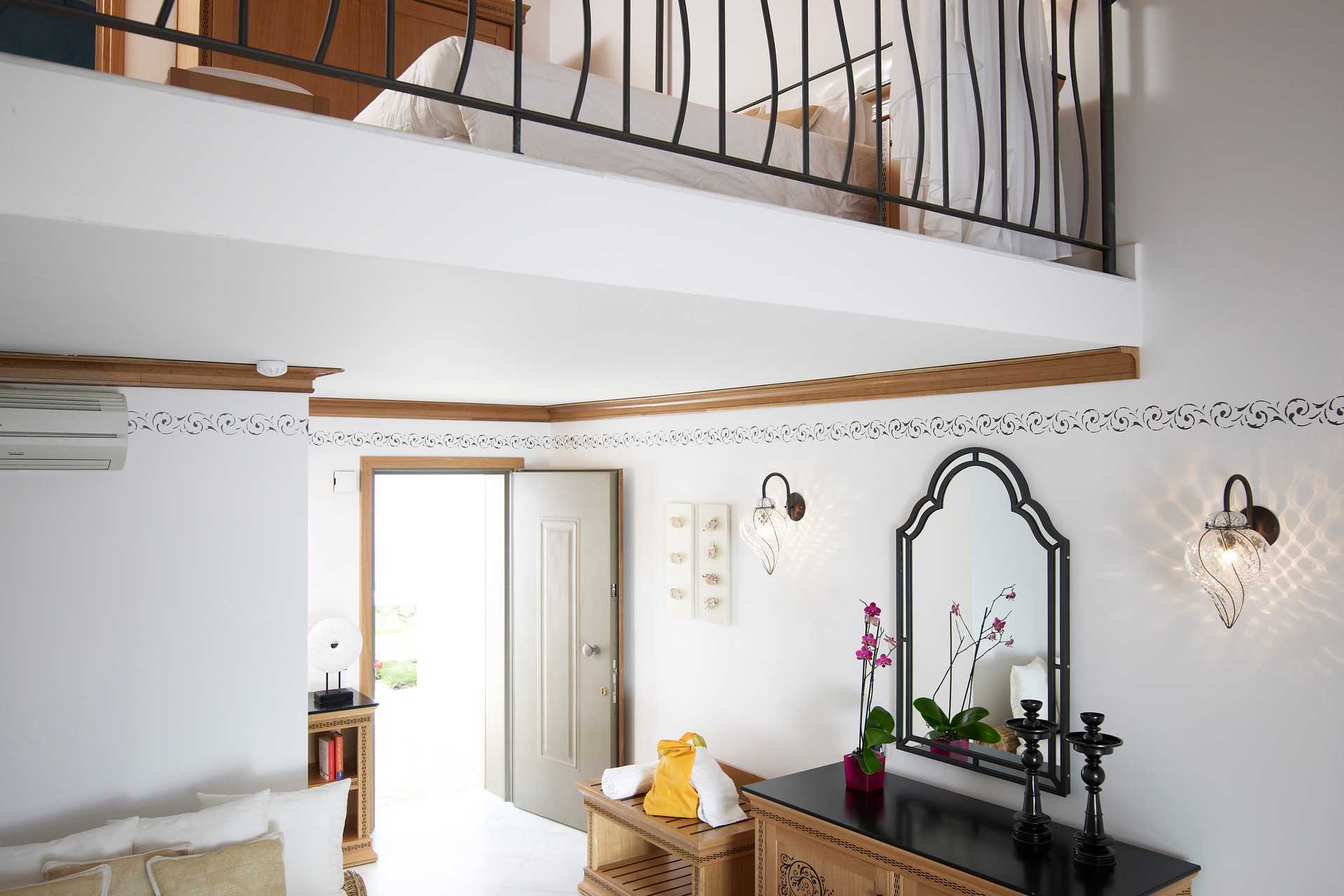Familierom i etasje med terrasse. I inngangsetasjen er det stue med mulighet for ekstrasenger i sovesofa og bad med badekar, separat dusj og wc. En trapp opp er det en sovehems med to enkeltsenger og bad med dusj og wc. Nede er det åpen planløsning. Wifi, luftkondisjonering og safe inkludert. Minibar med vann, brus og øl inkludert, etterfylles hver dag. Nespresso kaffemaskin Vannkoker samt kaffe og te. TV. Badekåper og tøfler Hårføner. Rengjøring 7 ggr/uke. Barn under 2 år regnes inn i maksantallet i rommet.