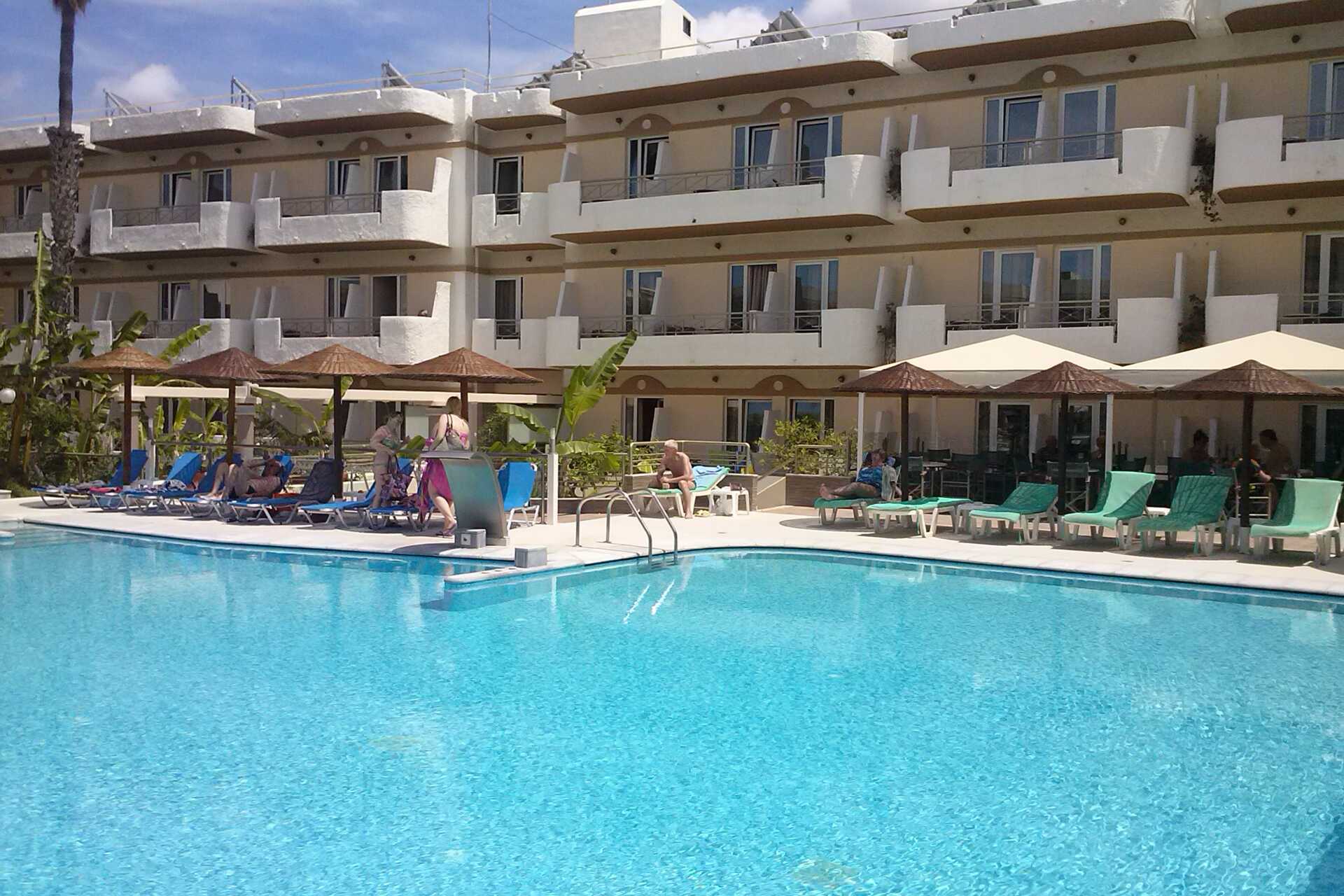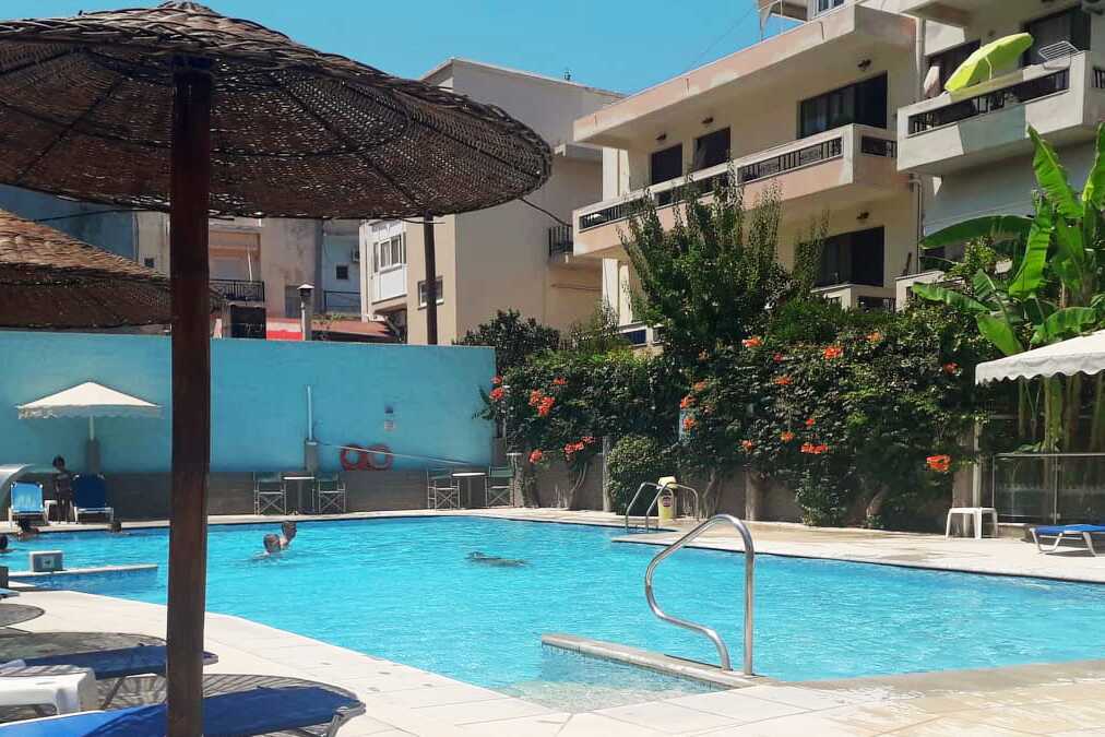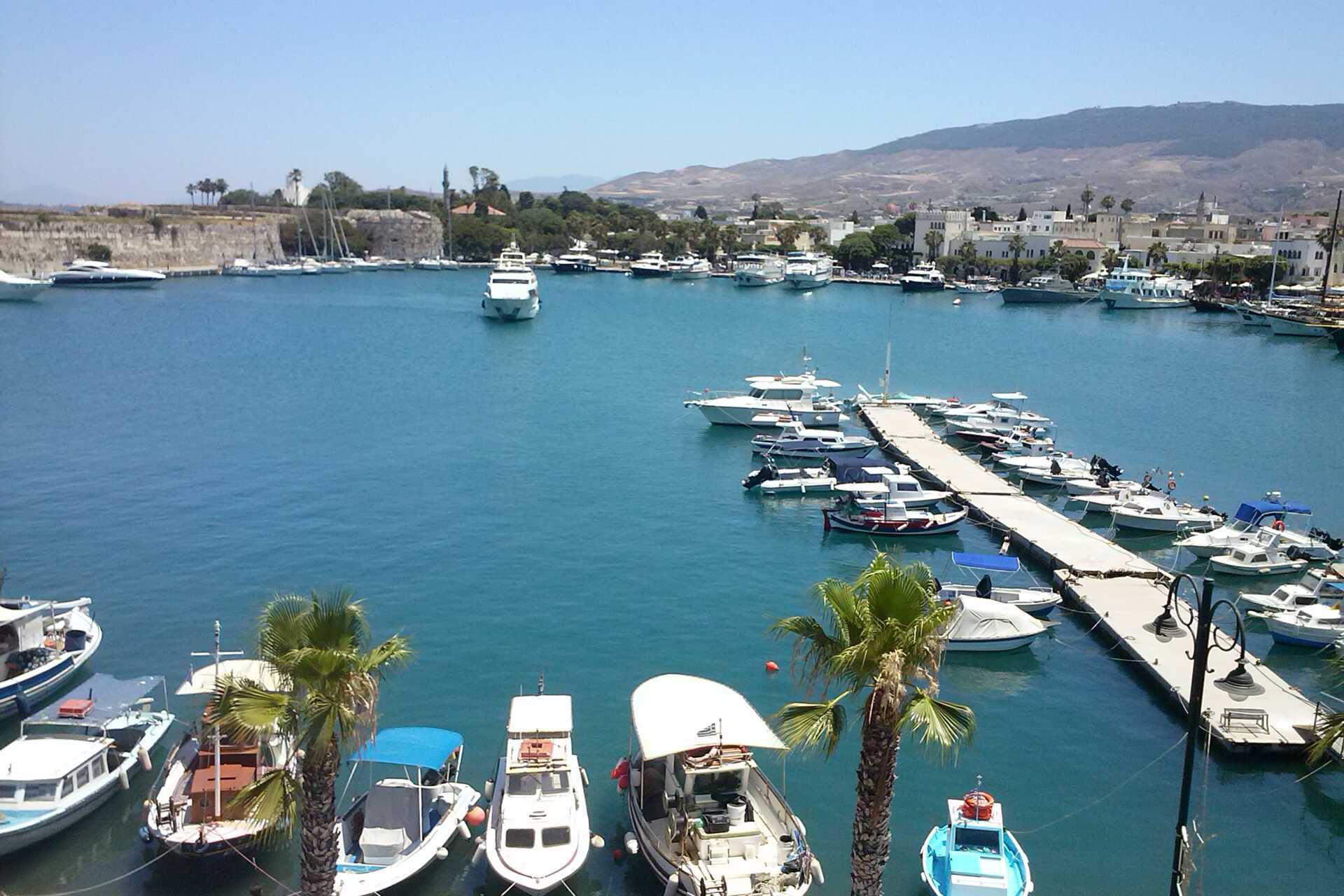 Den flotte utsikten fra frokostterrassen mot havneområdet og den sentrale beliggenheten i Kos by.