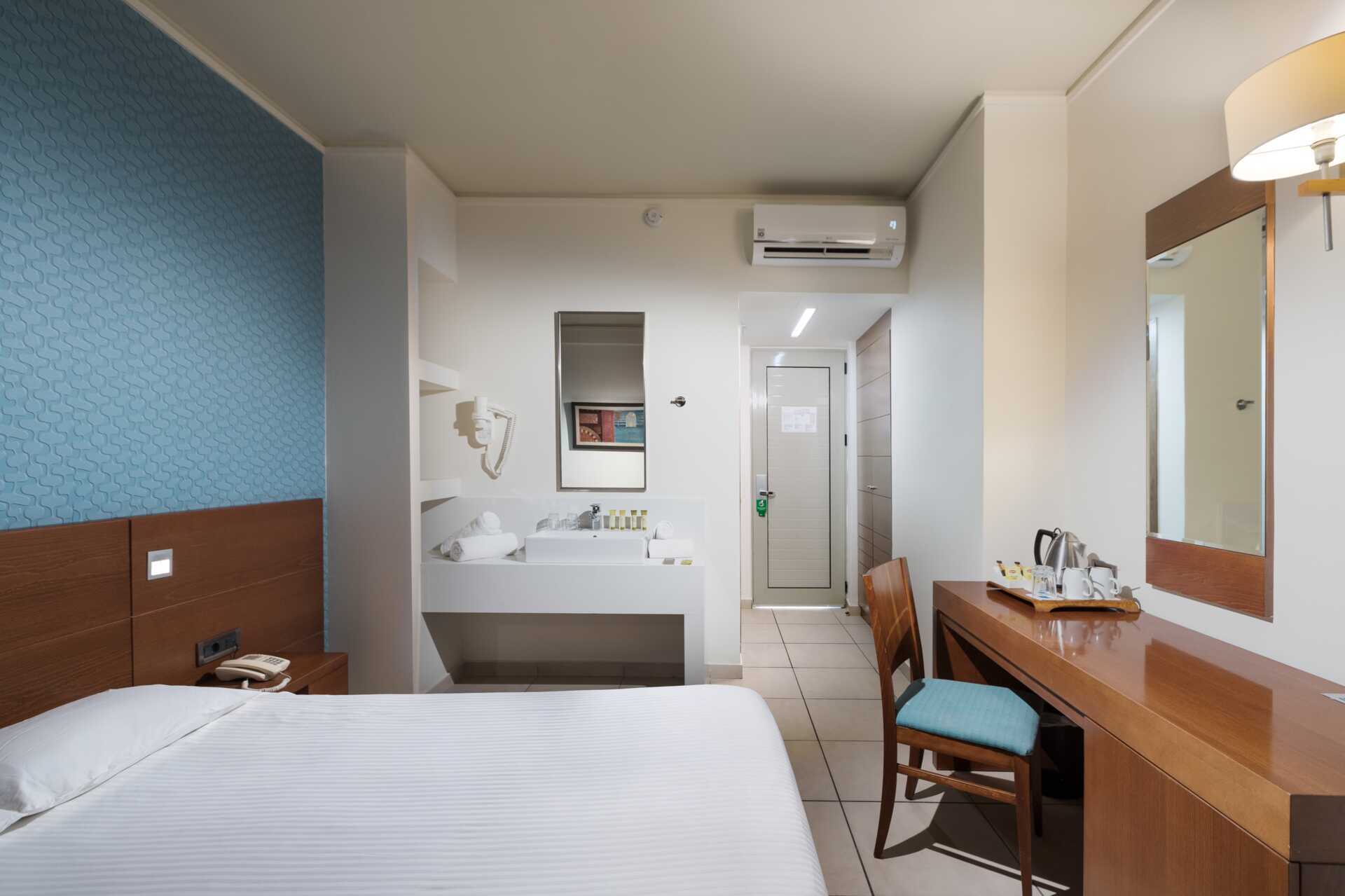 Dobbeltrom med terrasse eller balkong, noen med begrenset havutsikt eller bassengutsikt. En dobbeltseng eller to enkeltsenger. I noen rom er det mulig med ekstraseng i sovesofa. Wifi og luftkondisjonering inkludert. Safe mot avgift. Kjøleskap. Vannkoker samt kaffe og te. TV. Badekåper og tøfler på forespørsel. Hårføner. Baderom med dusj og wc. Rengjøring 7 ggr/uke.