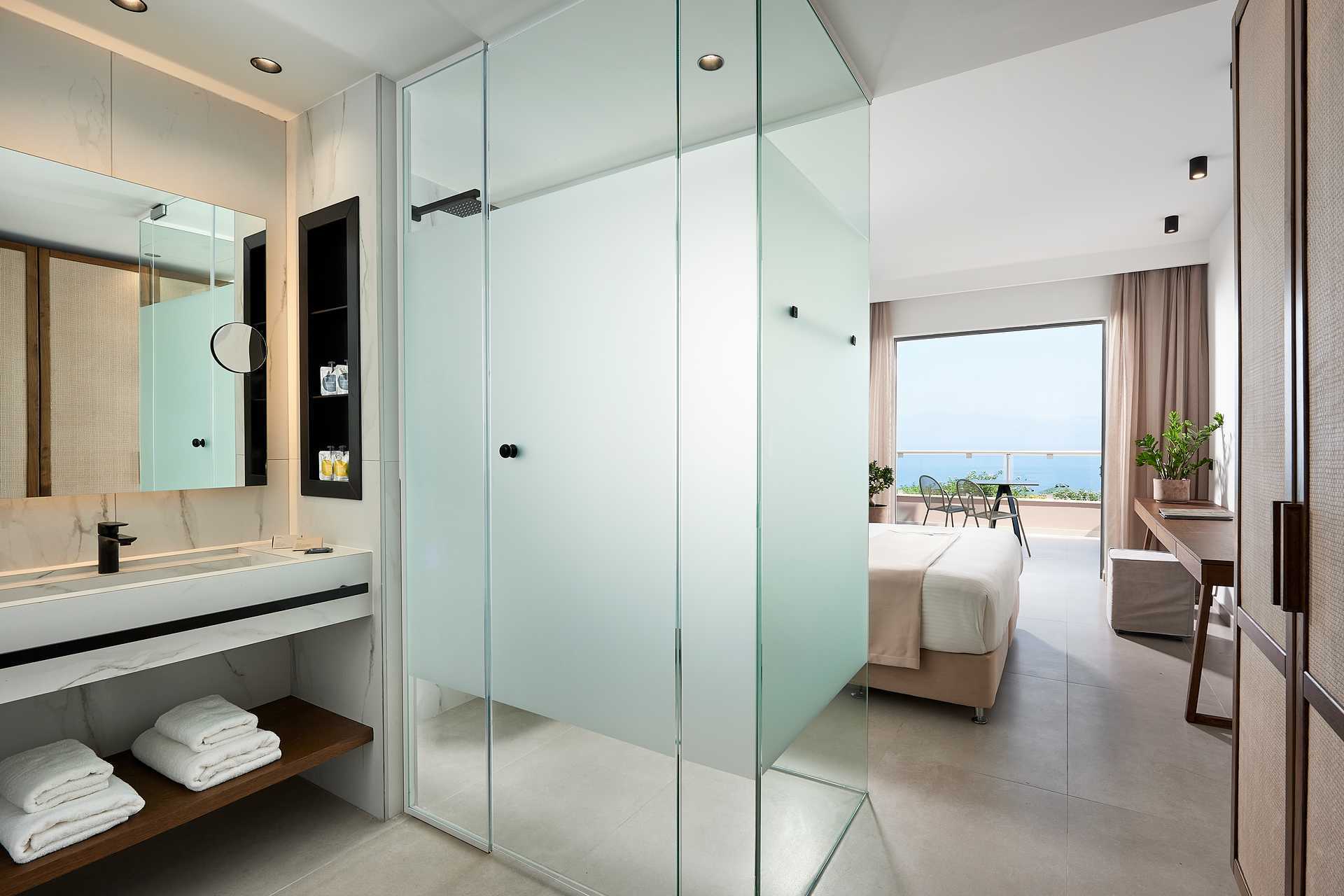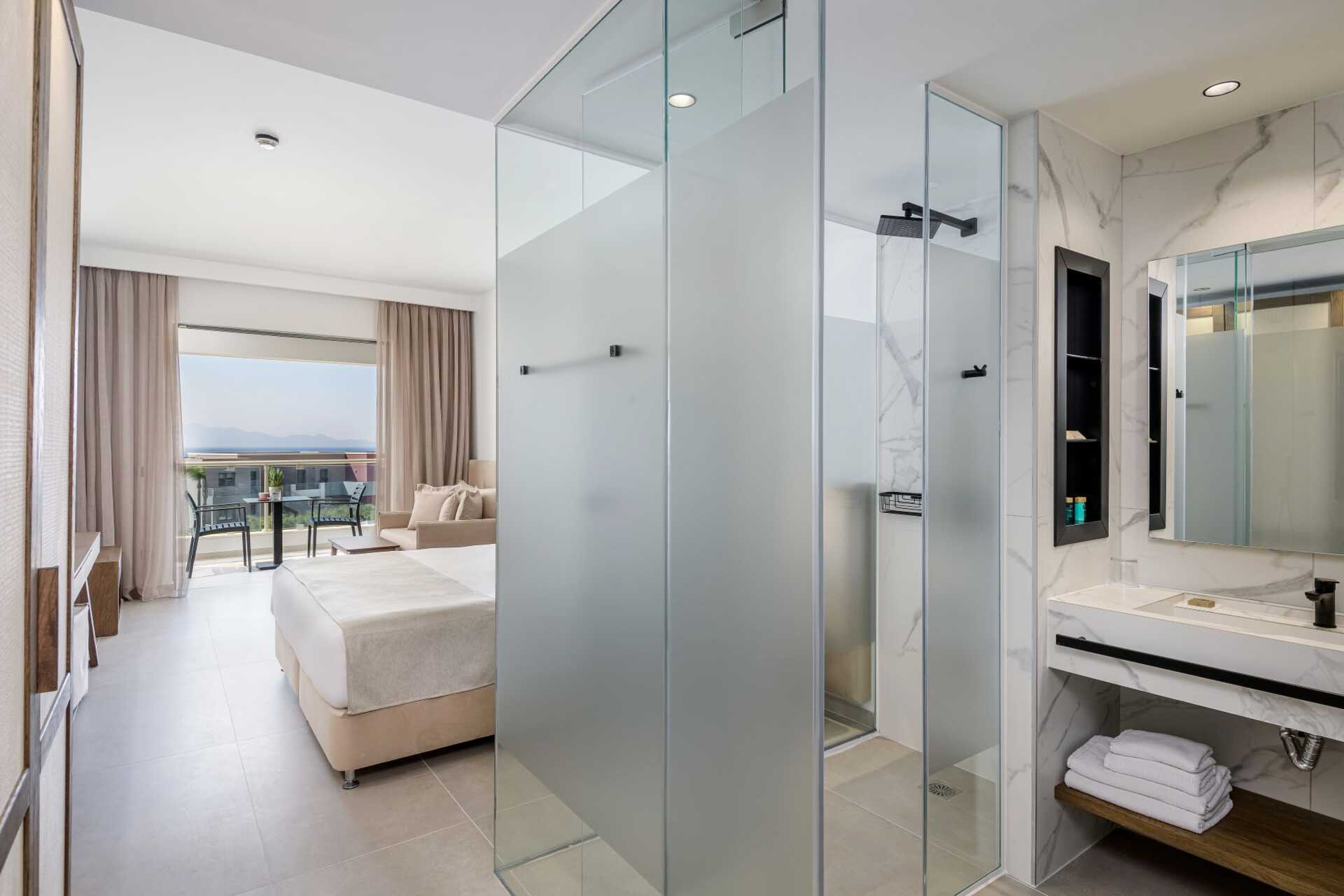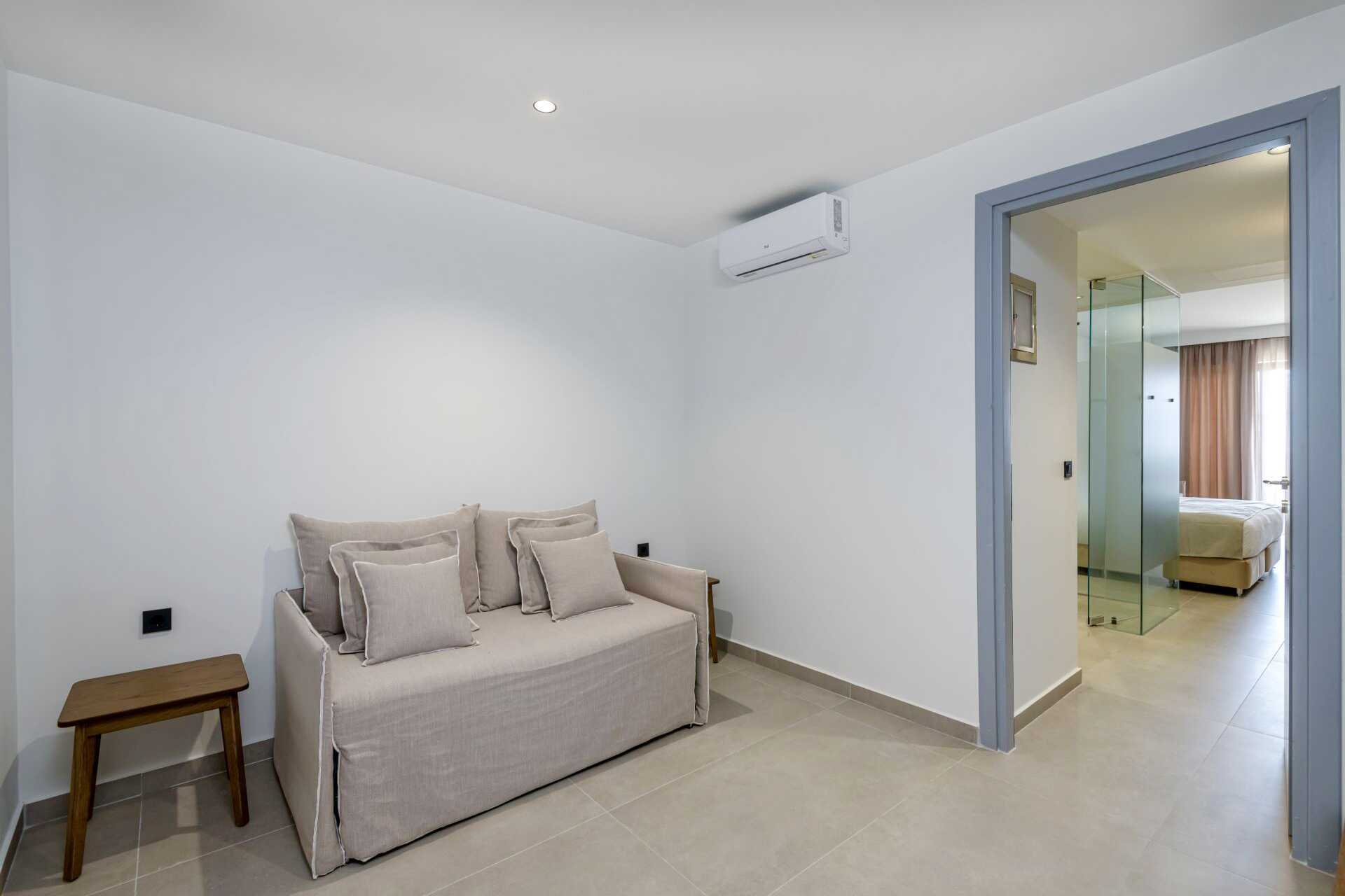 Juniorsuiter med terrasse eller balkong, noen med havutsikt og noen med havutsikt. Juniorsuitene med utsikt ligger på førest parkett mot havet og over evighetsbassenget. En dobbeltseng eller to enkeltsenger. Mulig med ekstrasenger i sovesofa. Wifi, luftkondisjonering og safe inkludert. Kjøleskap. Vannkoker samt kaffe og te. Espresso kaffemaskin. TV. Badekåper og tøfler Hårføner. Baderom med dusj og wc. Rengjøring 7 ggr/uke. Barn under 2 år regnes inn i maksantallet i rommet.