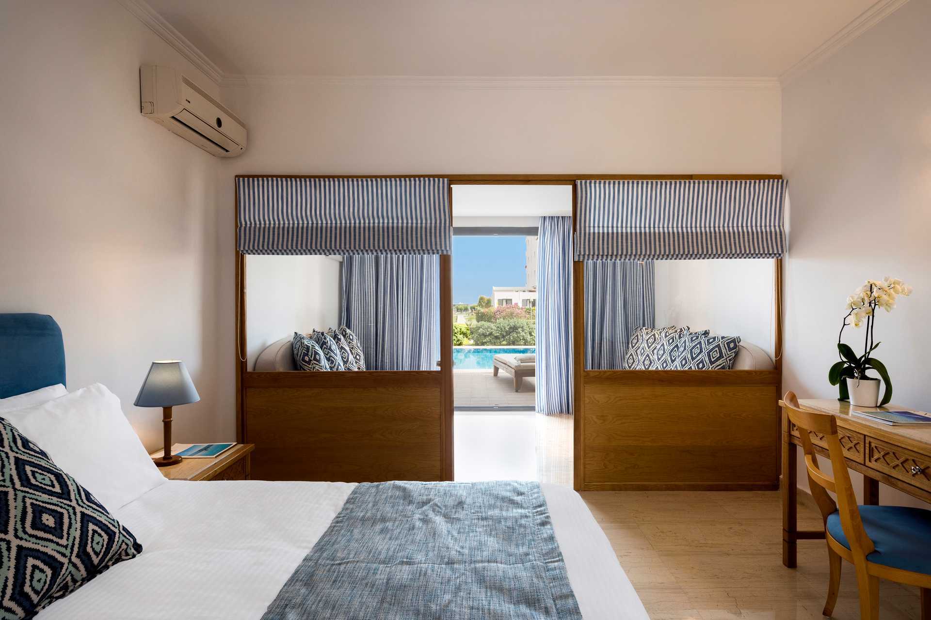 Familierom med balkong eller terrasse og havutsikt. Familierommet består av et soverom og en stue adskilt av en glassvegg med glassdør. En dobbeltseng eller to enkeltsenger. Mulig med ekstrasenger i to sovesofaer. Wifi, safe og luftkondisjonering. Minibar med vann, brus og øl inkludert, etterfylles annenhver dag. Vannkoker samt kaffe og te. TV i hvert rom. Badekåper og tøfler Hårføner. Badekar og wc. Rengjøring 7 ggr/uke. Barn under 2 år regnes inn i maksantallet i rommet.
