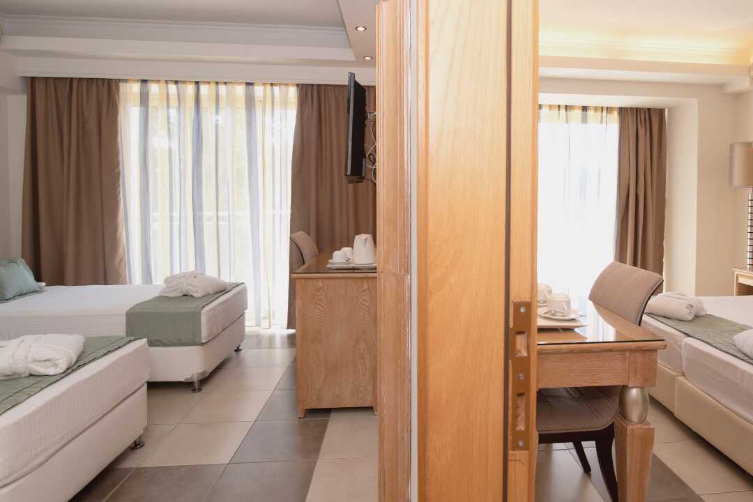 Familierom superior med balkong eller terrasse. To soverom med to enkeltsenger i hvert rom. Familierommene ligger omtrent 200 meter fra resepsjonen. Luftkondisjonering og safe inkludert. Kjøleskap. Vannkoker samt kaffe og te. Nespresso kaffemaskin, kapsler inkludert og etterfylles hver dag. En flaske vann er tilgjengelig ved ankomst og kan etterfylles i baren uten avgift. TV. Hårføner. Dusj og wc. Rengjøring 6 ggr/uke. Barn under 2 år regnes inn i maksantallet i rommet.