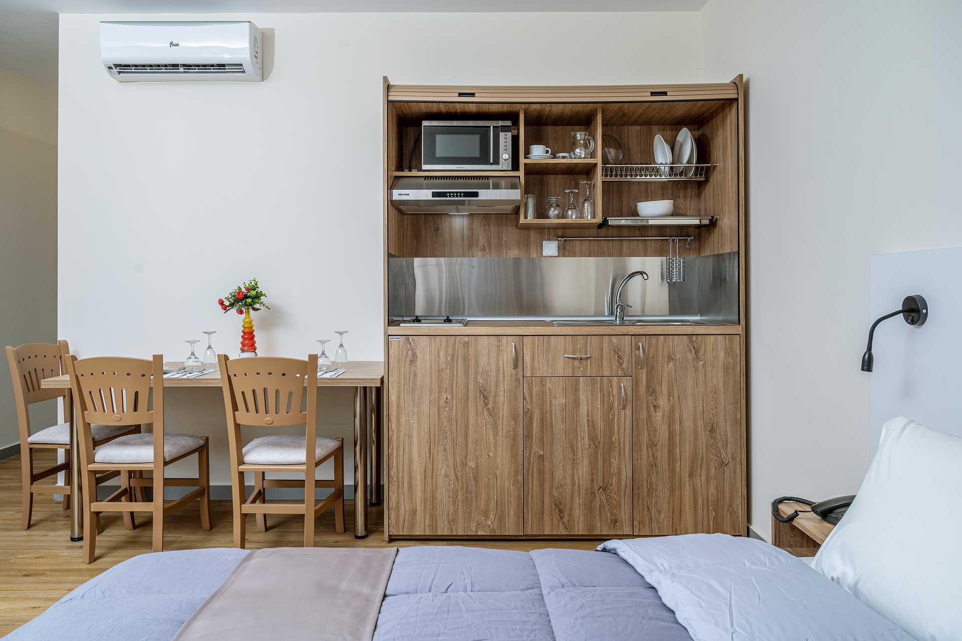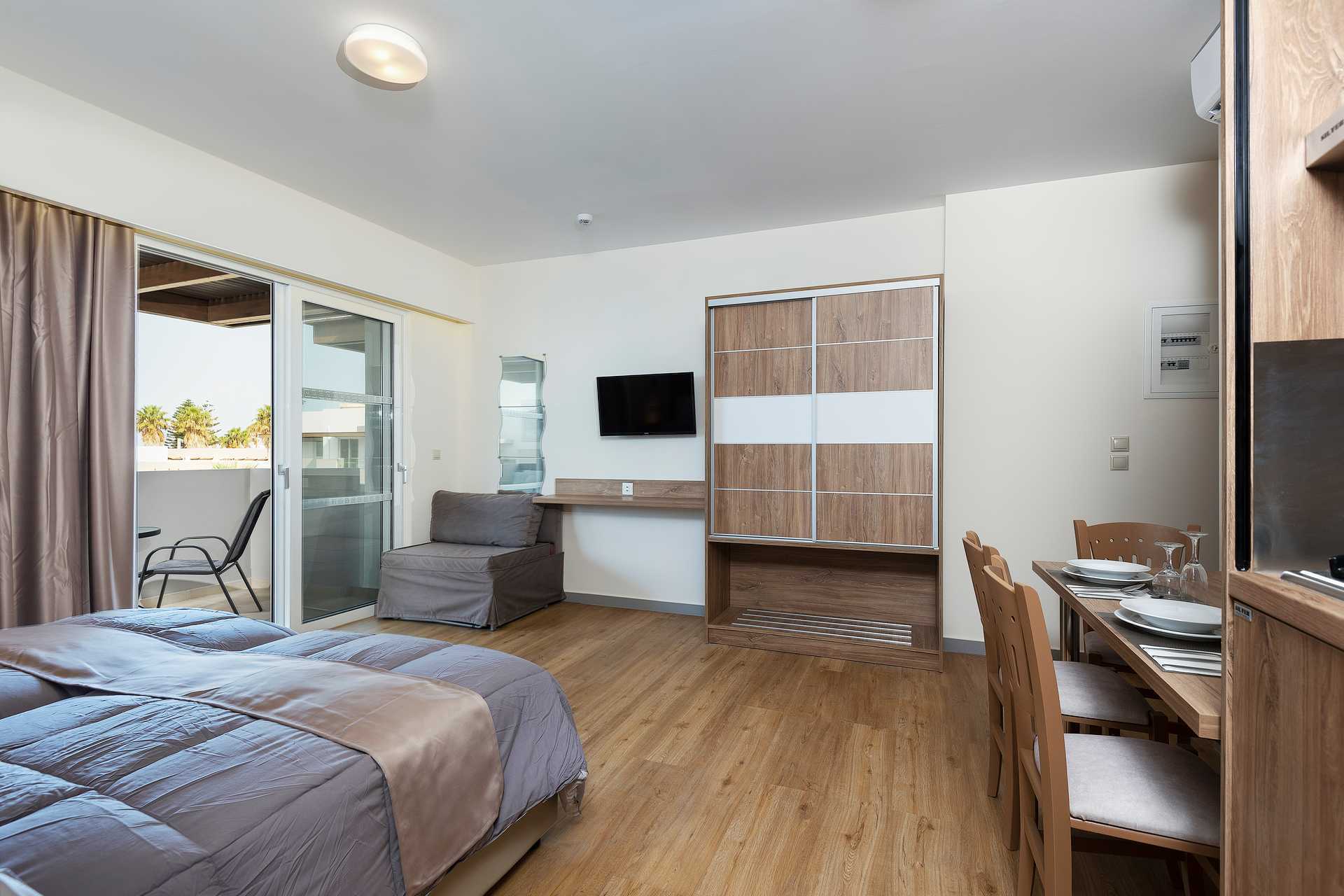 Ettromsleilighet med balkong, noen med bassengutsikt. Kombinert soverom og minikjøkken. En dobbeltseng eller to enkeltsenger. Mulig med ekstraseng i oppredbar lenestol. Minikjøkken med kjøleskap, kokeplater, mikrobølgeovn, kaffetrakter og enkelt kjøkkenutstyr. Wifi, luftkondisjonering og safe inkludert. Hårføner. Baderom med dusj og wc. Rengjøring 6 ggr/uke.