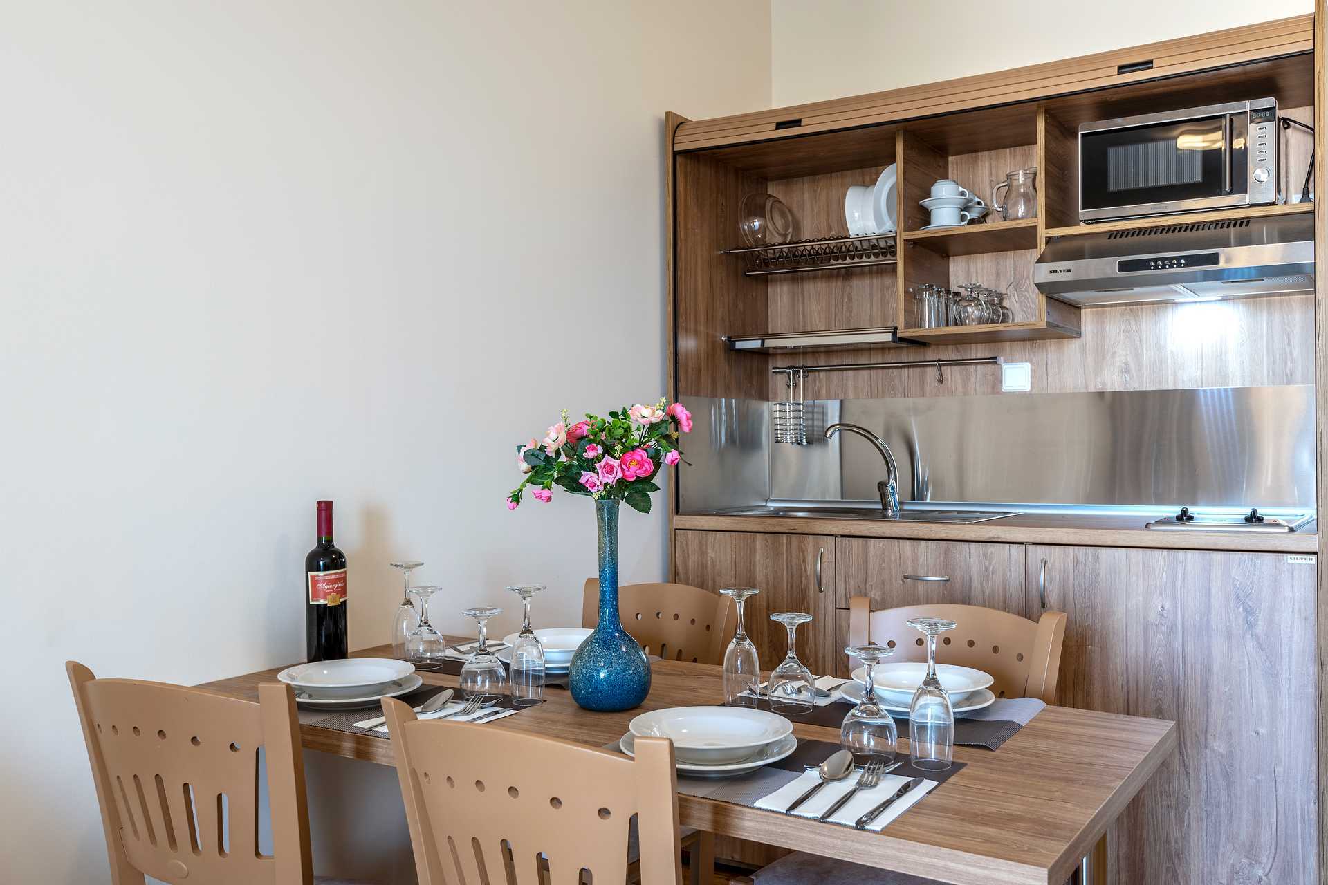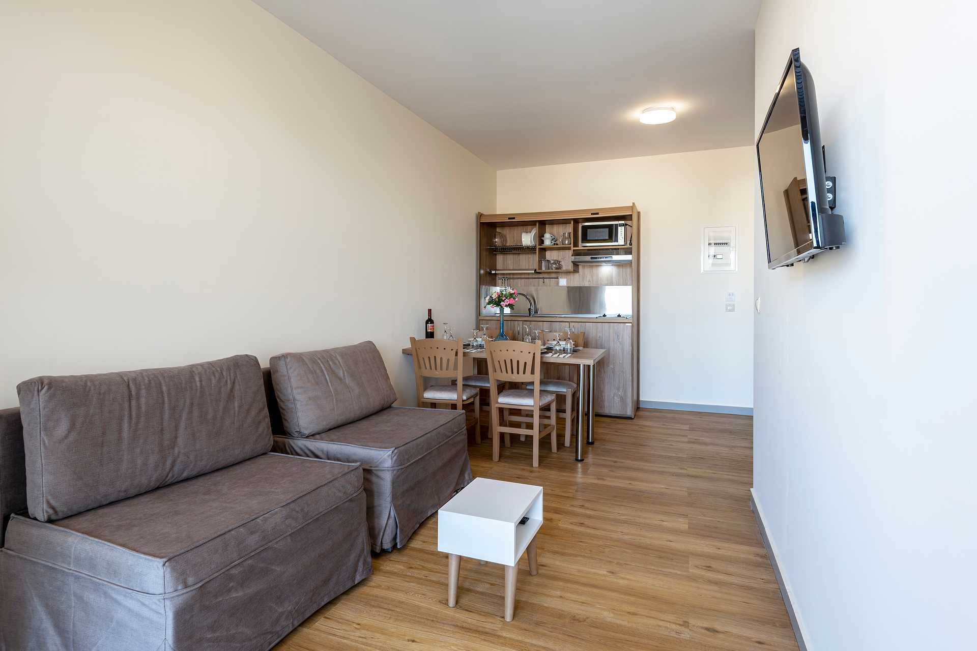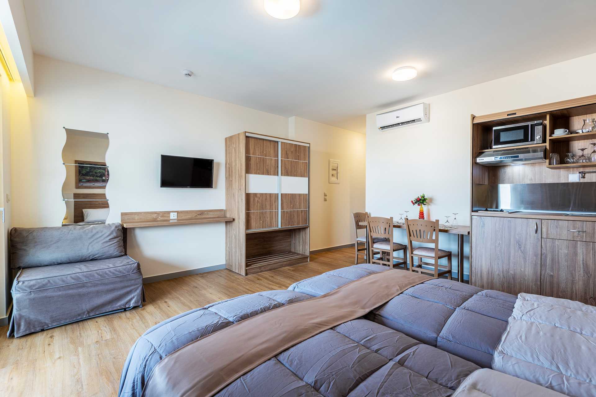 Toromsleilighet med balkong, noen med bassengutsikt. Et soverom og kombinert stue med minikjøkken. En dobbeltseng eller to enkeltsenger. Mulig med ekstrasenger i to sovesofaer. Minikjøkken med kjøleskap, kokeplater, kaffetrakter, mikrobølgeovn og enkelt kjøkkenutstyr. Wifi, luftkondisjonering og safe inkludert. Hårføner. Baderom med dusj og wc. Rengjøring 6 ggr/uke.