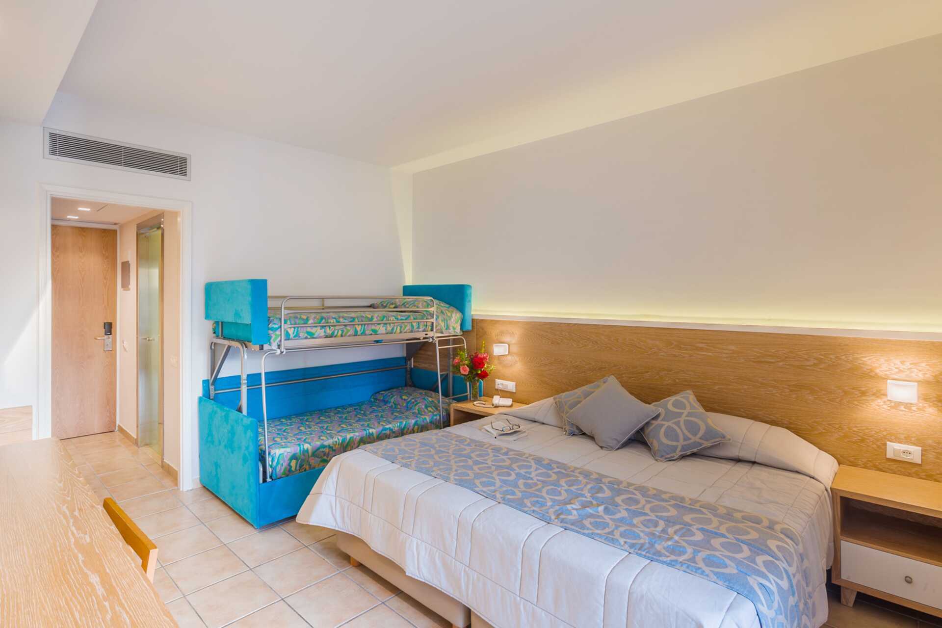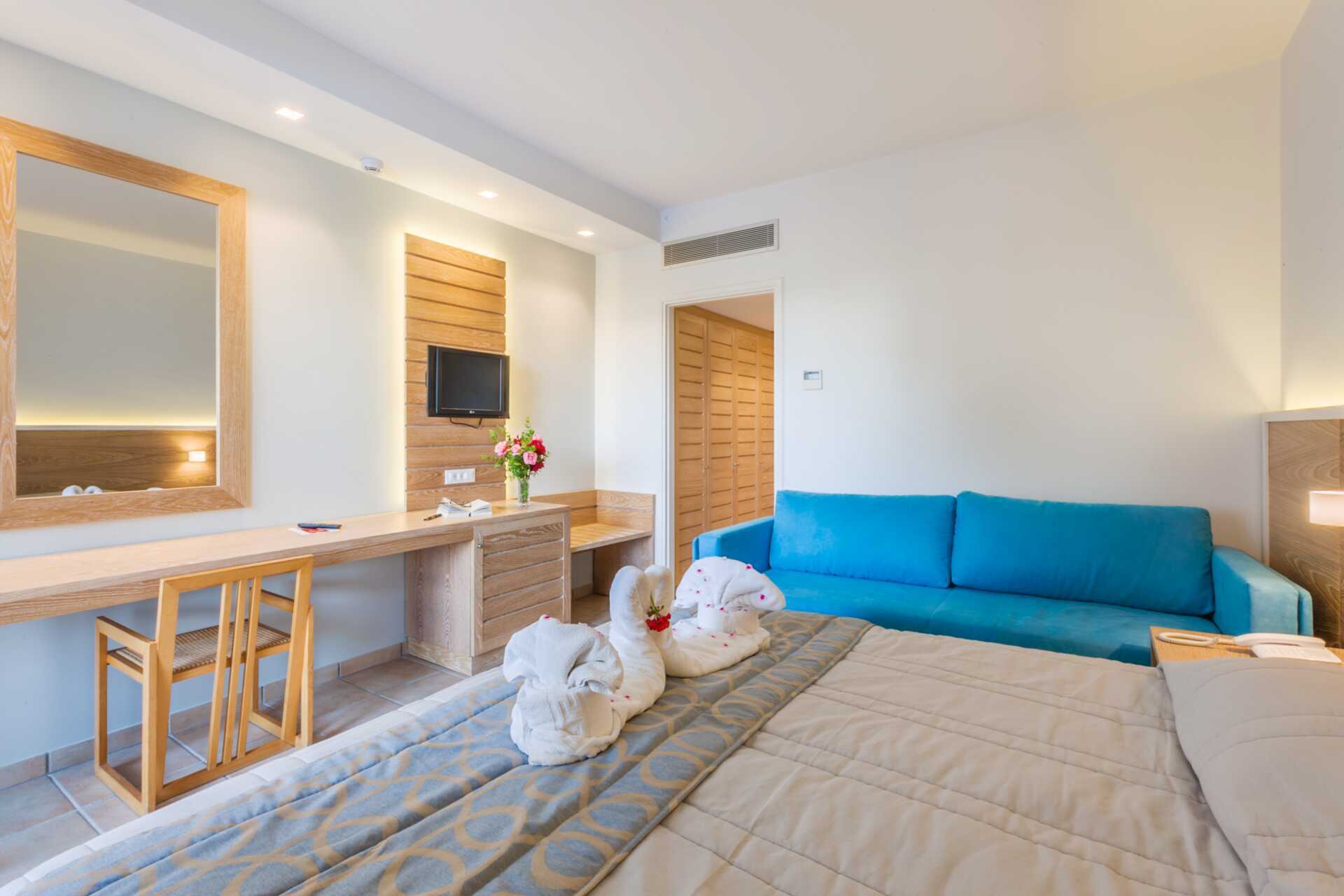 Dobbeltrom med balkong eller terrasse, noen med havutsikt. Rommene ligger i hovedbygningen. En dobbeltseng eller to enkeltsenger. Mulig med ekstraseng i oppredbar lenestol eller enkeltseng. På rom for inntil fire personer er ekstrasengene i en køyeseng. Wifi og luftkondisjonering inkludert. Safe mot avgift. Kjøleskap. TV. Hårføner. Dusj og wc. Rengjøring 6 ggr/uke.