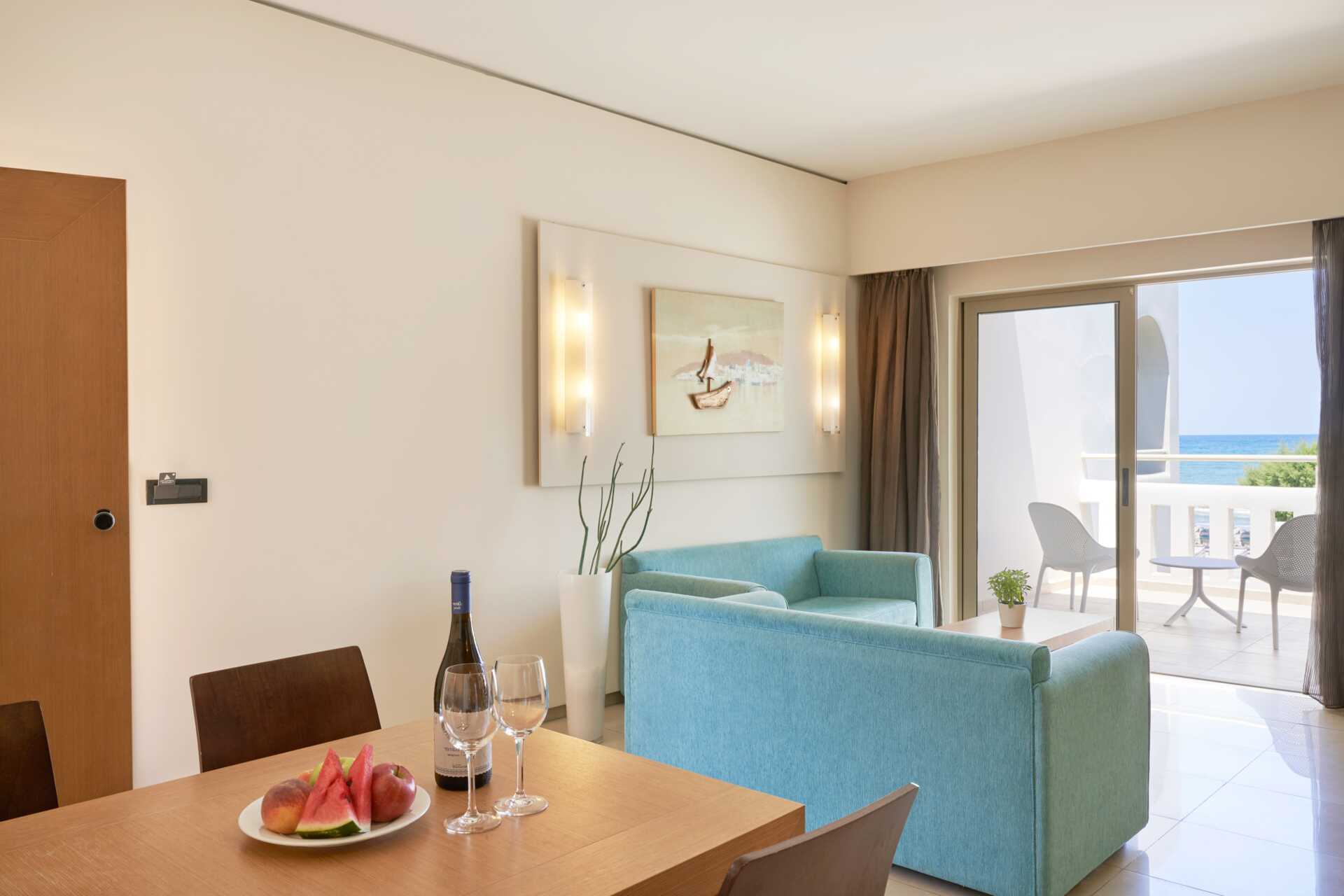 Juniorsuite med balkong eller terrasse. Juniorsuiten består av et soverom og en stue. En dobbeltseng eller to enkeltsenger. Mulig med ekstrasenger i to sovesofaer. Wifi, luftkondisjonering og safe inkludert. Kjøleskap. Vannkoker samt kaffe og te. TV i hvert rom. Badekåper og tøfler Hårføner. Badekar, dusj og wc. Rengjøring 7 ggr/uke.