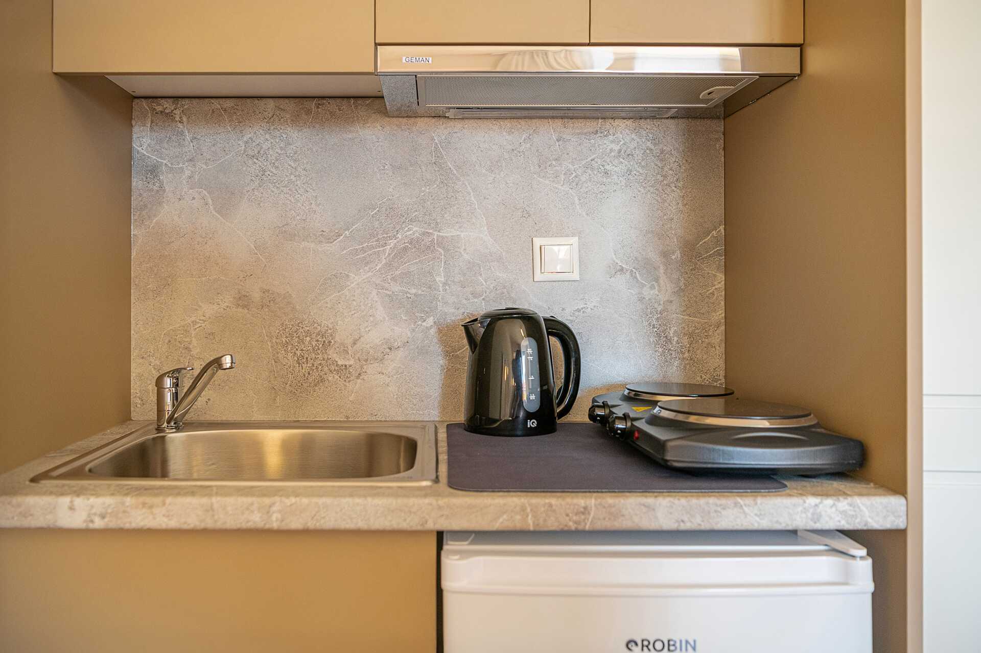 Ettromsleilighet med balkong, markbalkong eller delt uteplass. Delt uteplass kan være enten på bakkeplan med delt markbalkong eller i en høyere etasje med delt balkong. Noen balkonger og delte uteplasser har utsikt over bassenget. Minikjøkken. To enkeltsenger. Mulig med en ekstraoppredning i sovesofa. Minikjøkken med kokeplater, kjøleskap, vannkoker og enkelt kjøkkenutstyr. Wifi (oppkobling og hastighet varierer), safe og luftkondisjonering inkludert. TV. Hårføner. Badekar og wc. Rengjøring 6 ggr/uke.