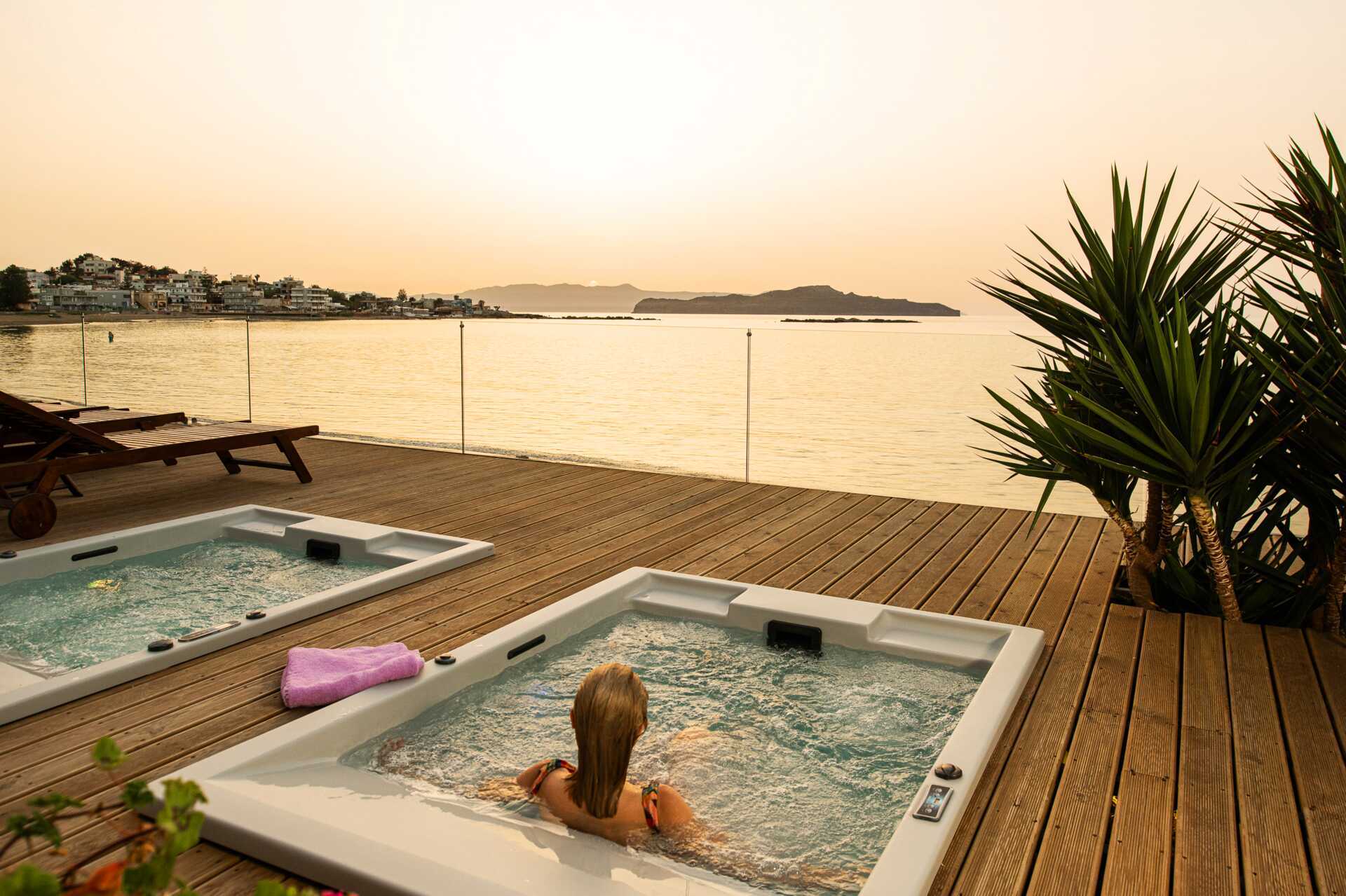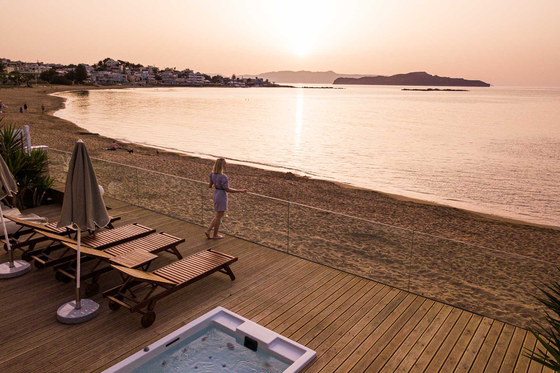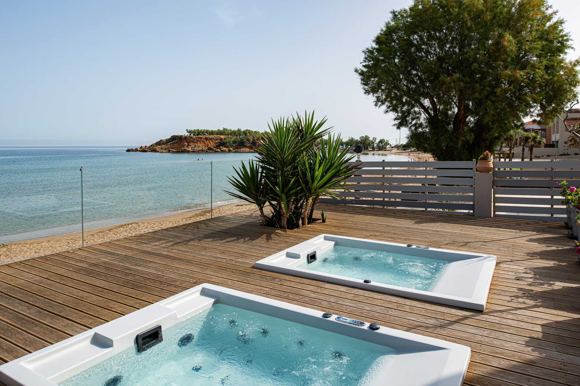 Like ved på sandstranden i Agii Apostolis finner du Domus Aqua Villa – et perfekt sted for et større reisefølge! På den romslige terrassen med et par jacuzzier og en vakker havutsikt kan dere nyte middagen dere lagde sammen og se solen synke ned i havet.