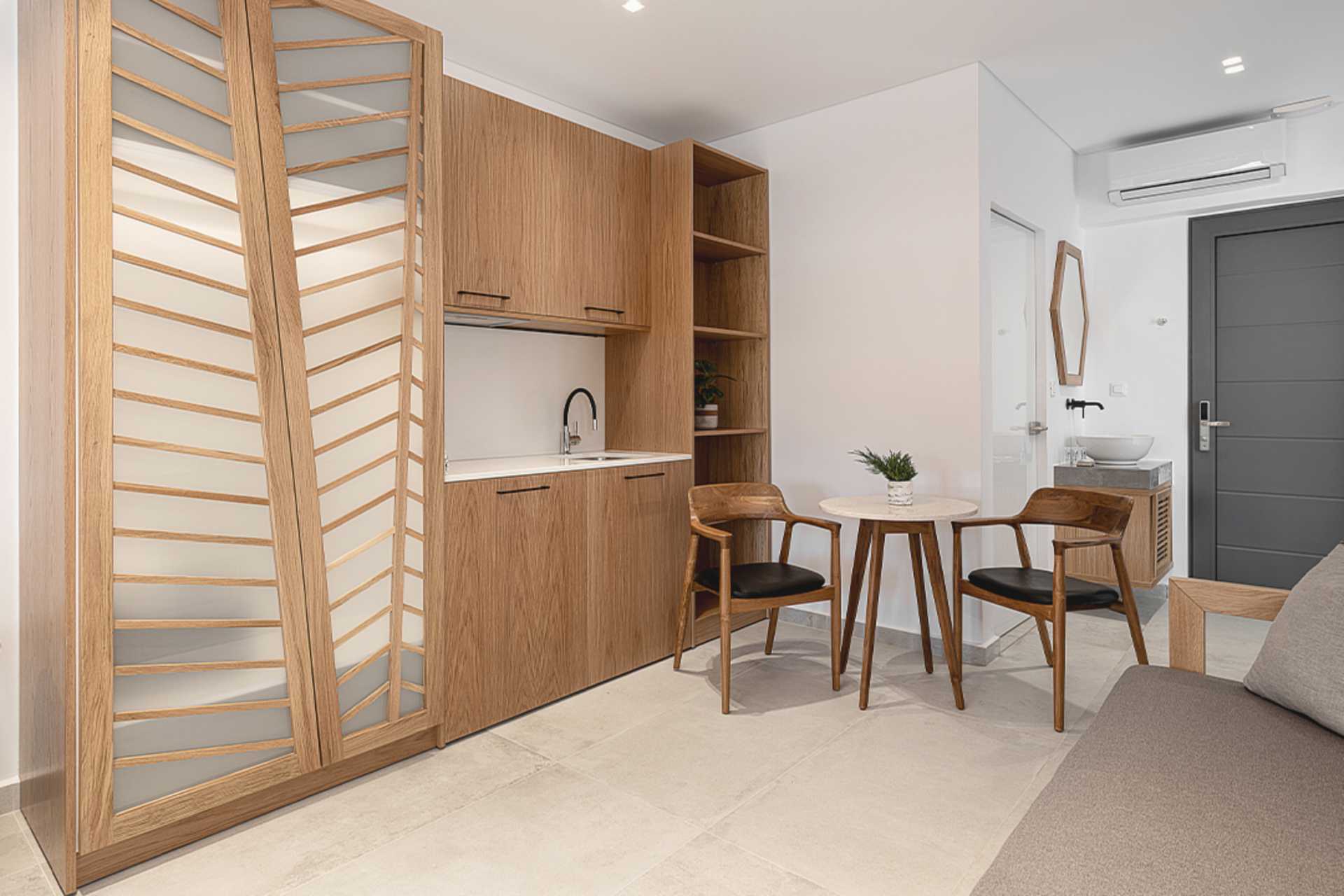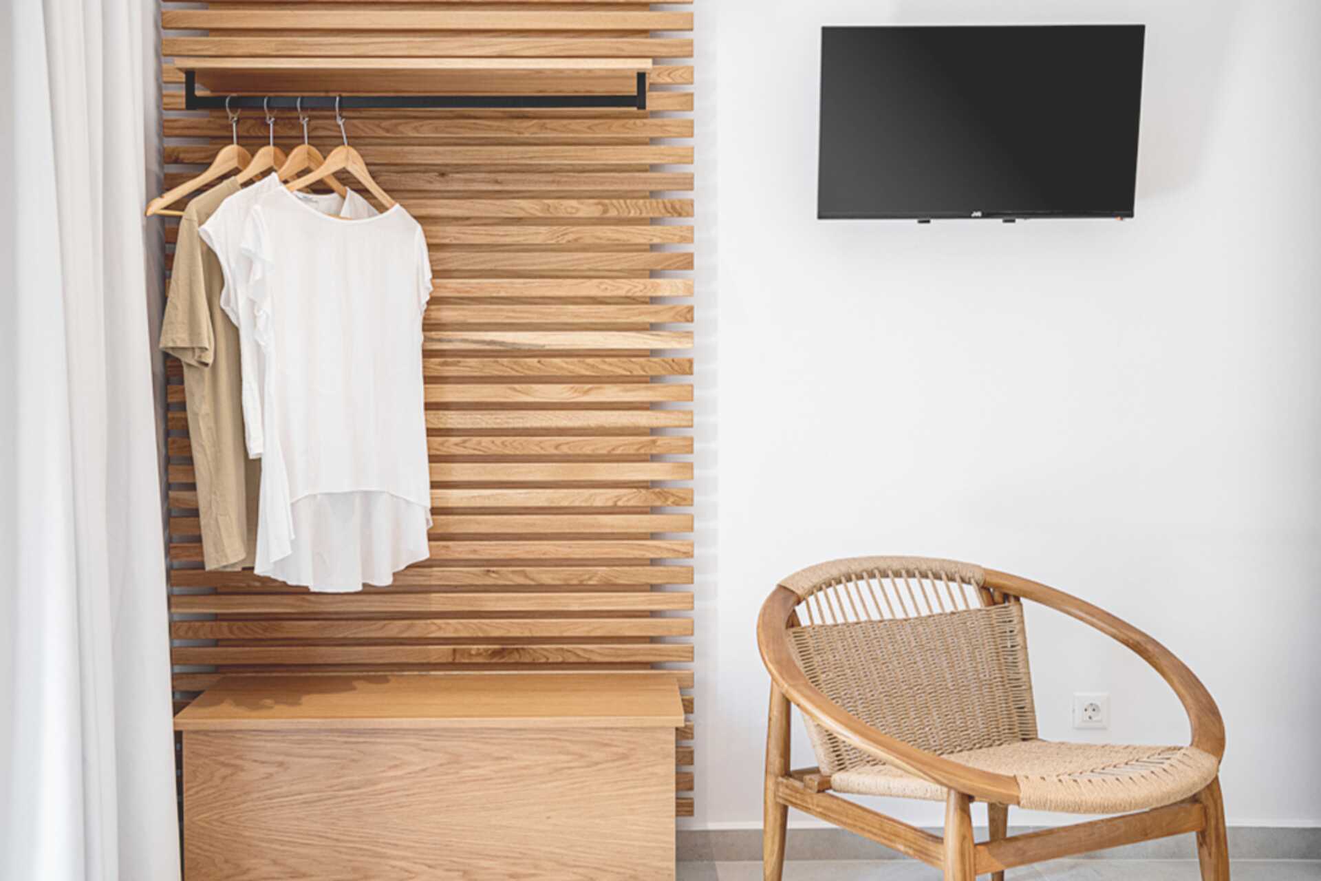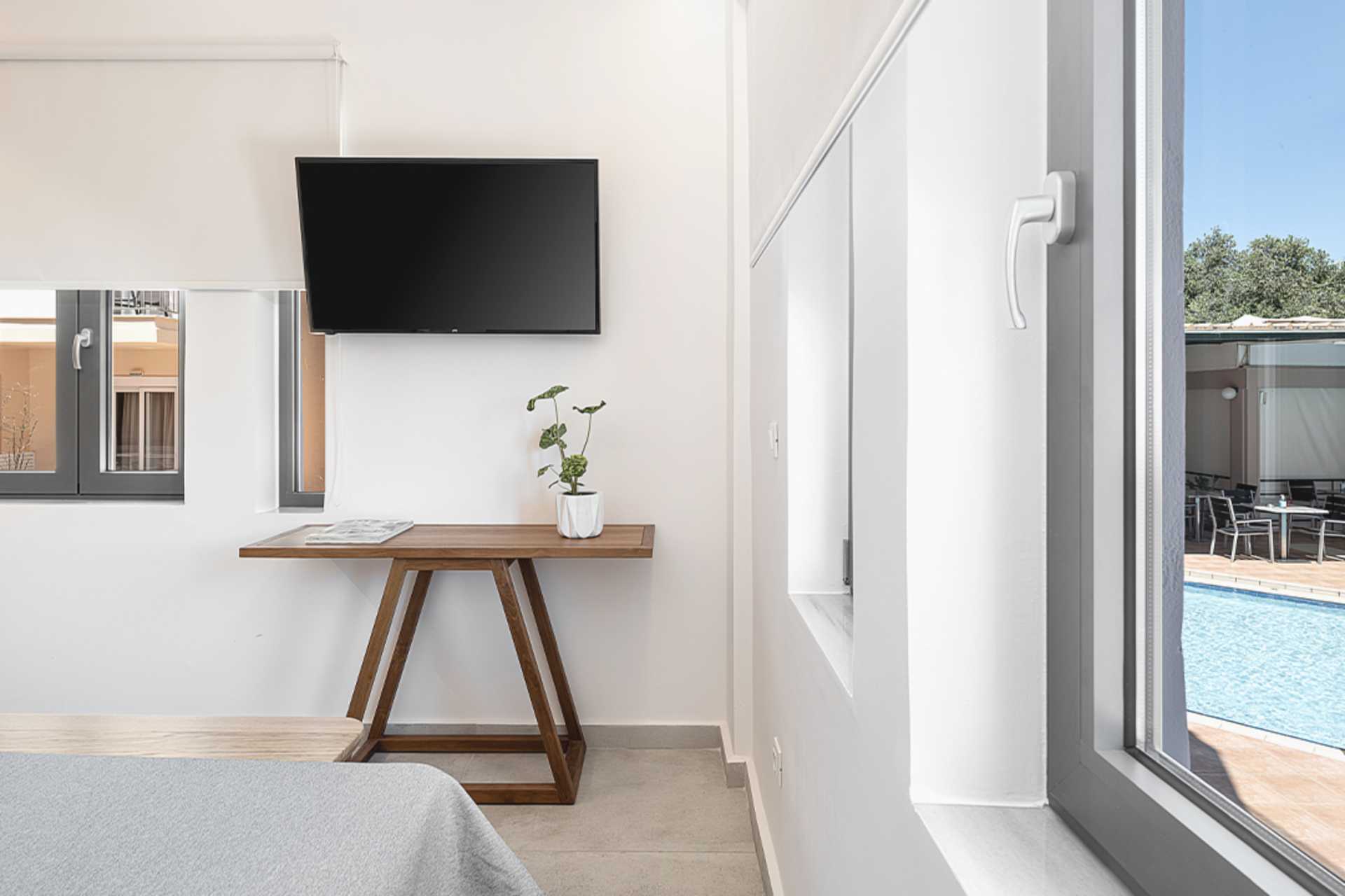 Toromsleilighet med balkong. Soverom og kombinert stue med minikjøkken. En dobbeltseng eller to enkeltsenger. Mulig med ekstrasenger i to sovesofaer. Minikjøkken med kokeplater, kjøleskap, vannkoker, kaffetrakter og enkelt kjøkkenutstyr. Wifi er inkludert. Luftkondisjonering og safe mot avgift. TV med internasjonale kanaler. Dusj og wc. Rengjøring 6 ggr/uke.