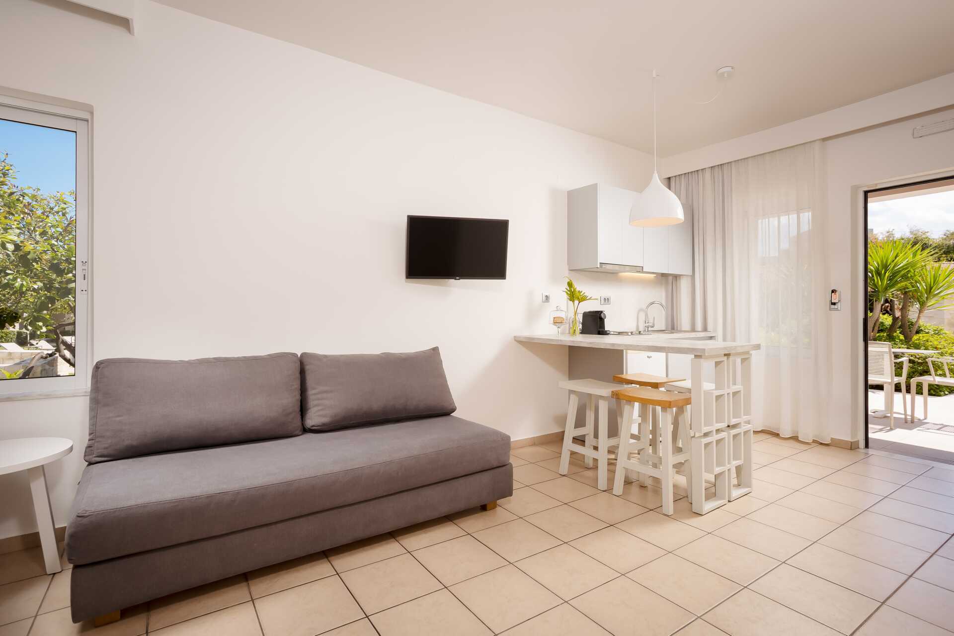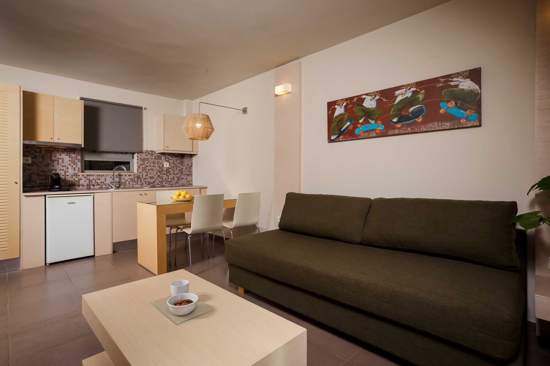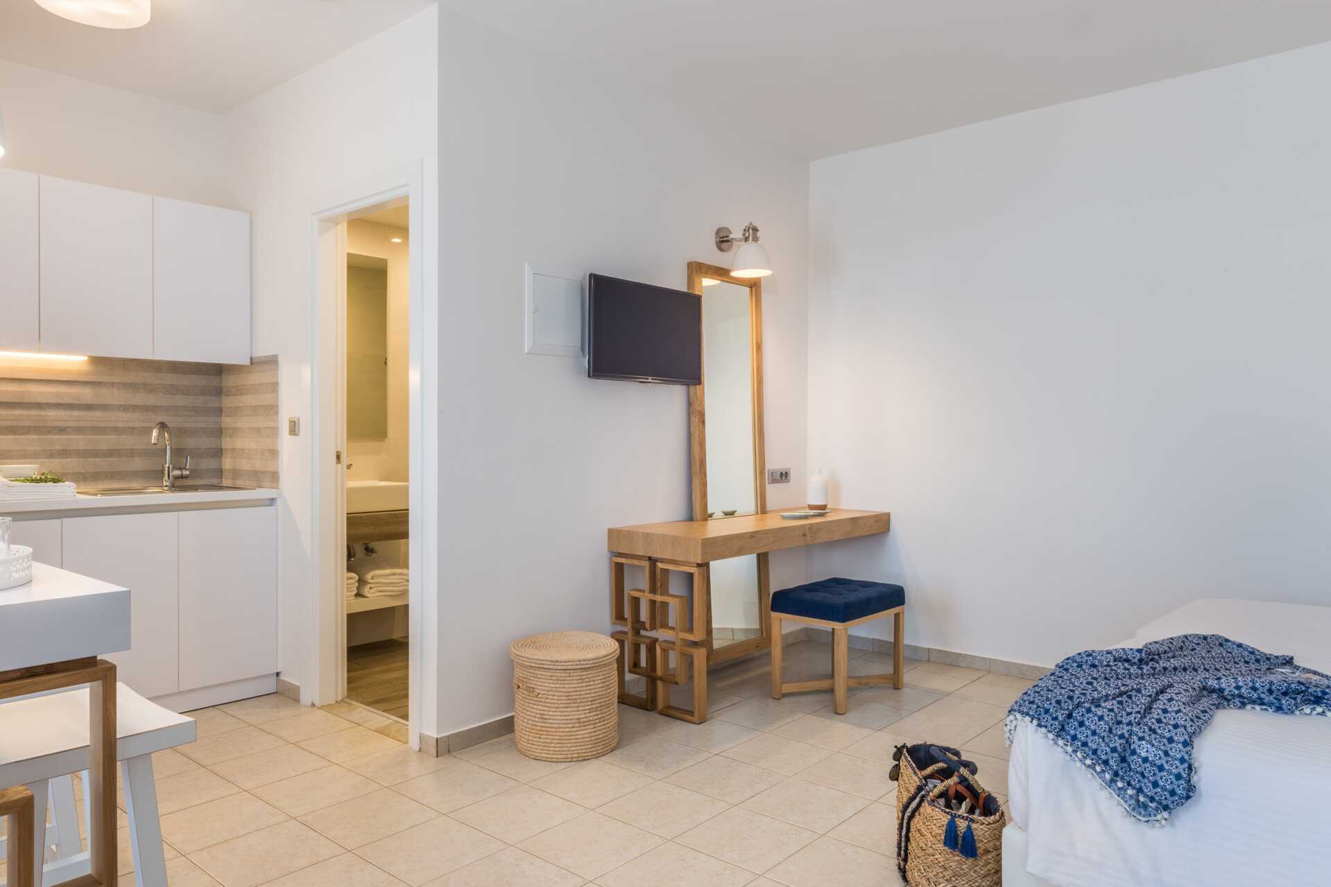 Ettromsleilighet med balkong, markterrasse (som nås via en trapp), markbalkong eller delt uteplass, noen leiligheter har utsikt over bassenget. Ettromsleiligheter ligger i alle deler av hotellet. Kombinert soverom og minikjøkken. To enkeltsenger. Mulig med ekstraseng i sovesofa. Minikjøkken med kokeplater, kjøleskap, kaffetrakter, vannkoker og enkelt kjøkkenutstyr. Wifi, luftkondisjonering og safe. TV. Badekar eller dusj samt wc. Hårføner. Rengjøring 6 ggr/uke. Ved bruk av barneseng blir leiligheten trang.