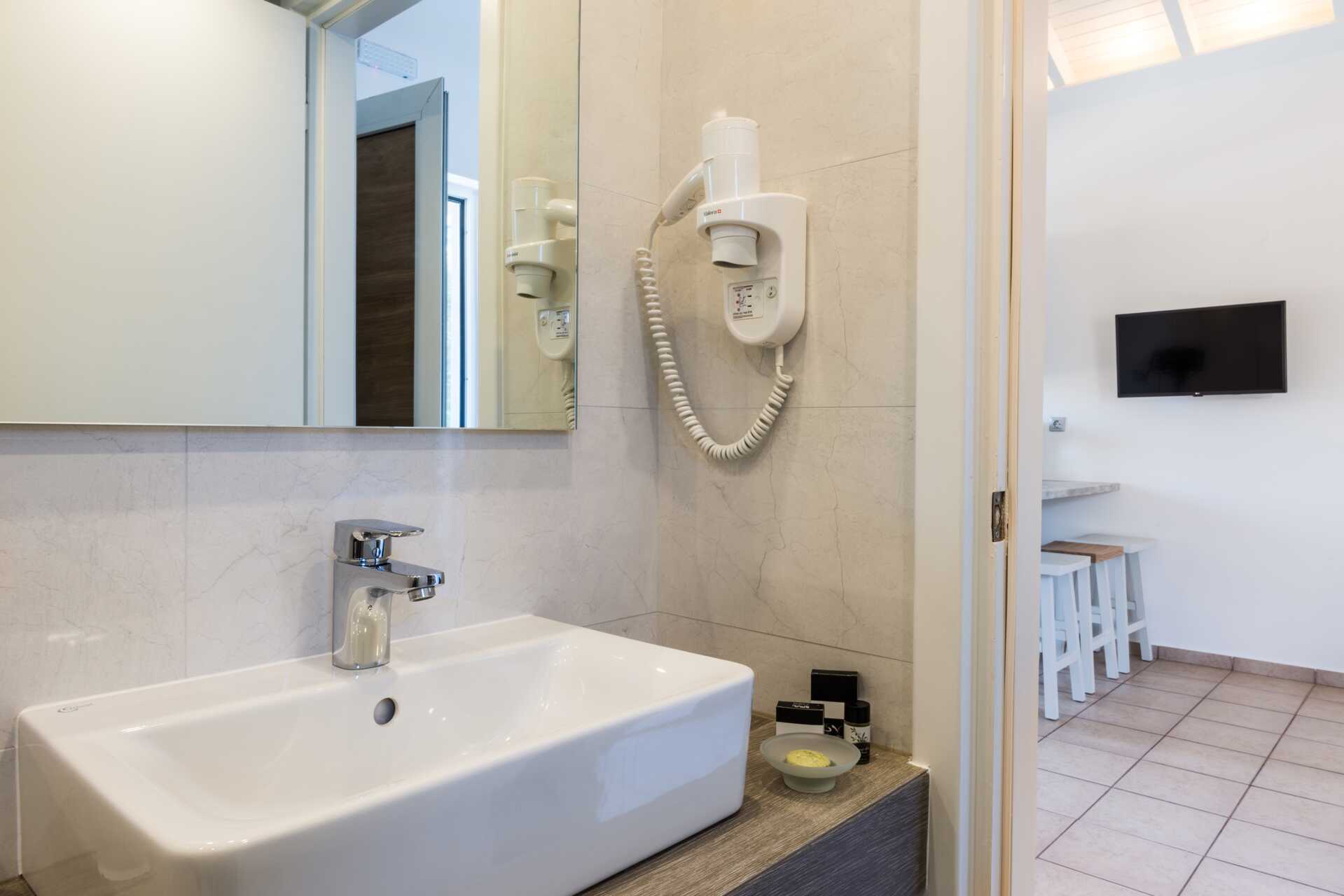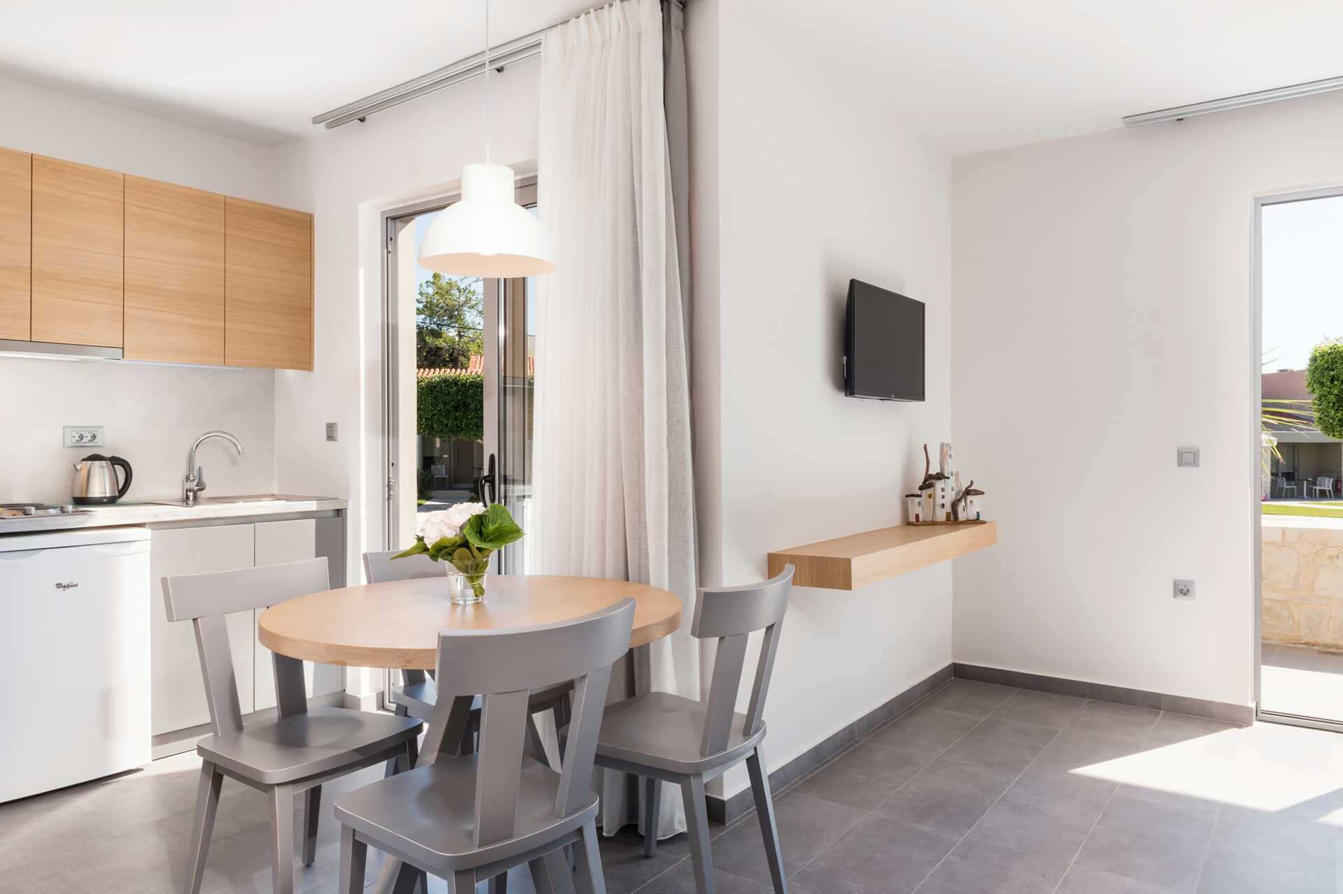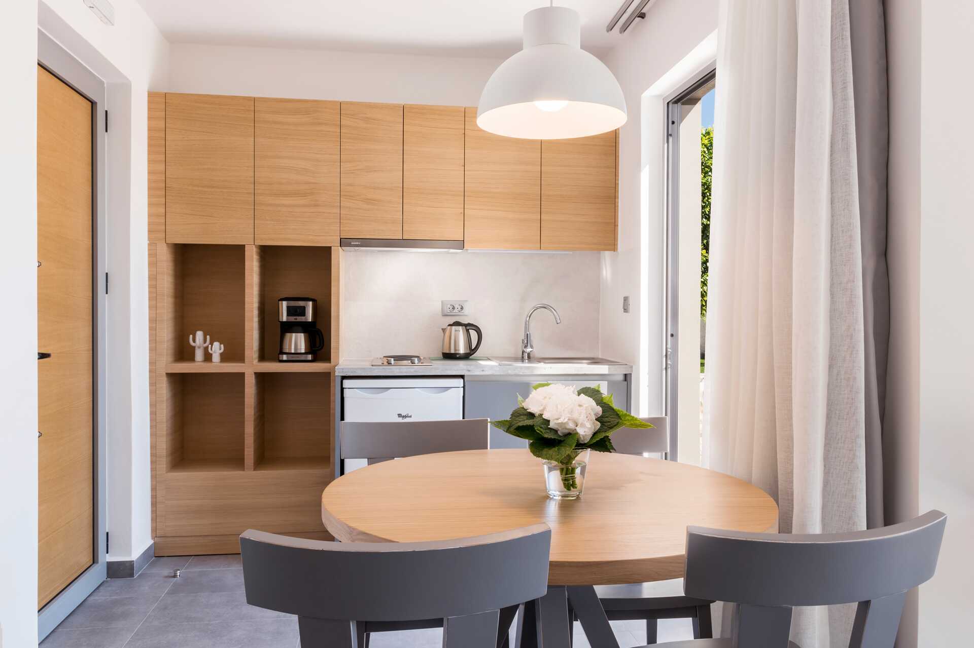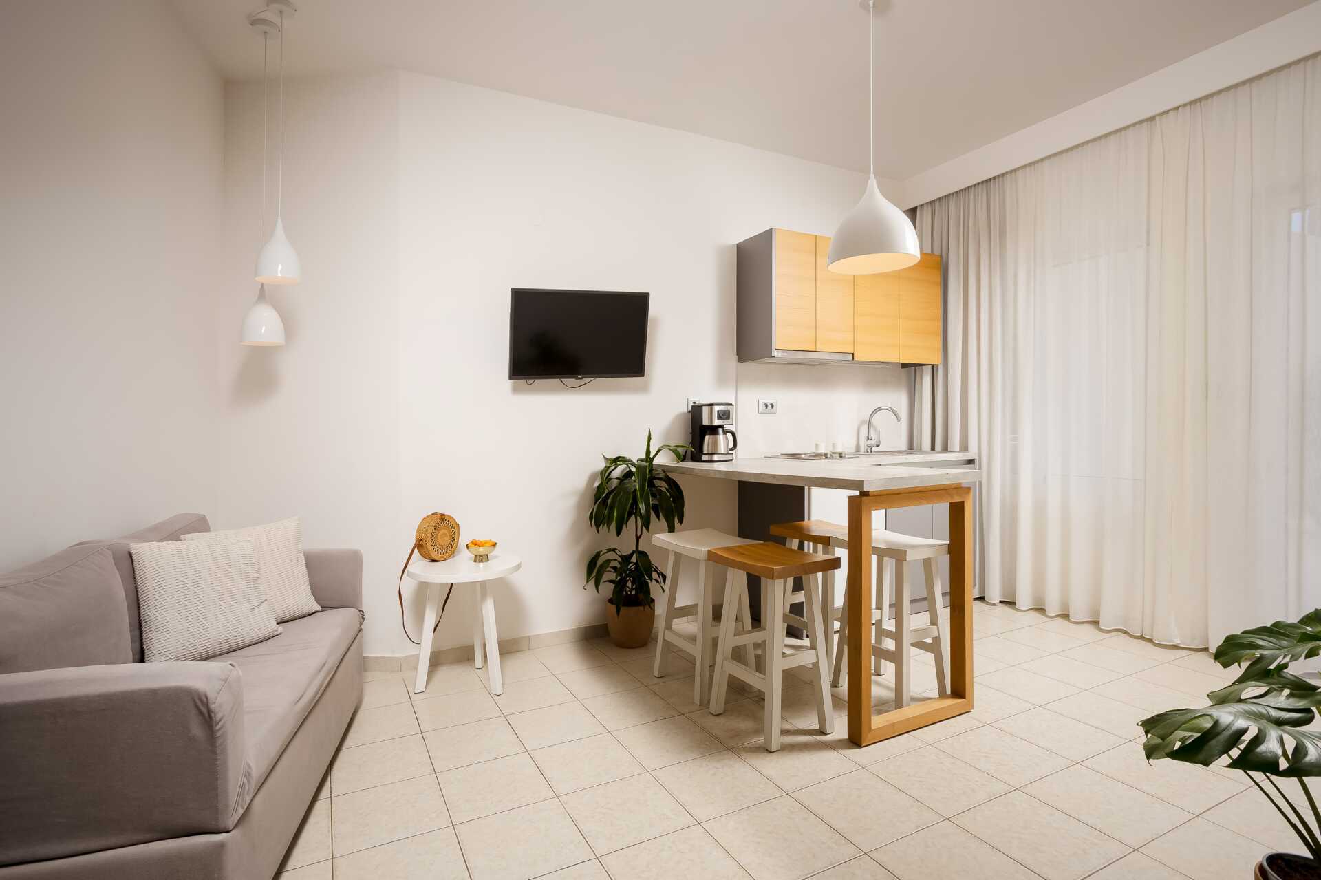 Ettromsleilighet med balkong, markterrasse (som nås via en trapp), markbalkong eller delt uteplass, noen leiligheter har utsikt over bassenget. Ettromsleiligheter ligger i alle deler av hotellet. Kombinert soverom og minikjøkken. To enkeltsenger. Mulig med ekstraseng i sovesofa. Minikjøkken med kokeplater, kjøleskap, kaffetrakter, vannkoker og enkelt kjøkkenutstyr. Wifi, luftkondisjonering og safe. TV. Badekar eller dusj samt wc. Hårføner. Rengjøring 6 ggr/uke. Ved bruk av barneseng blir leiligheten trang.