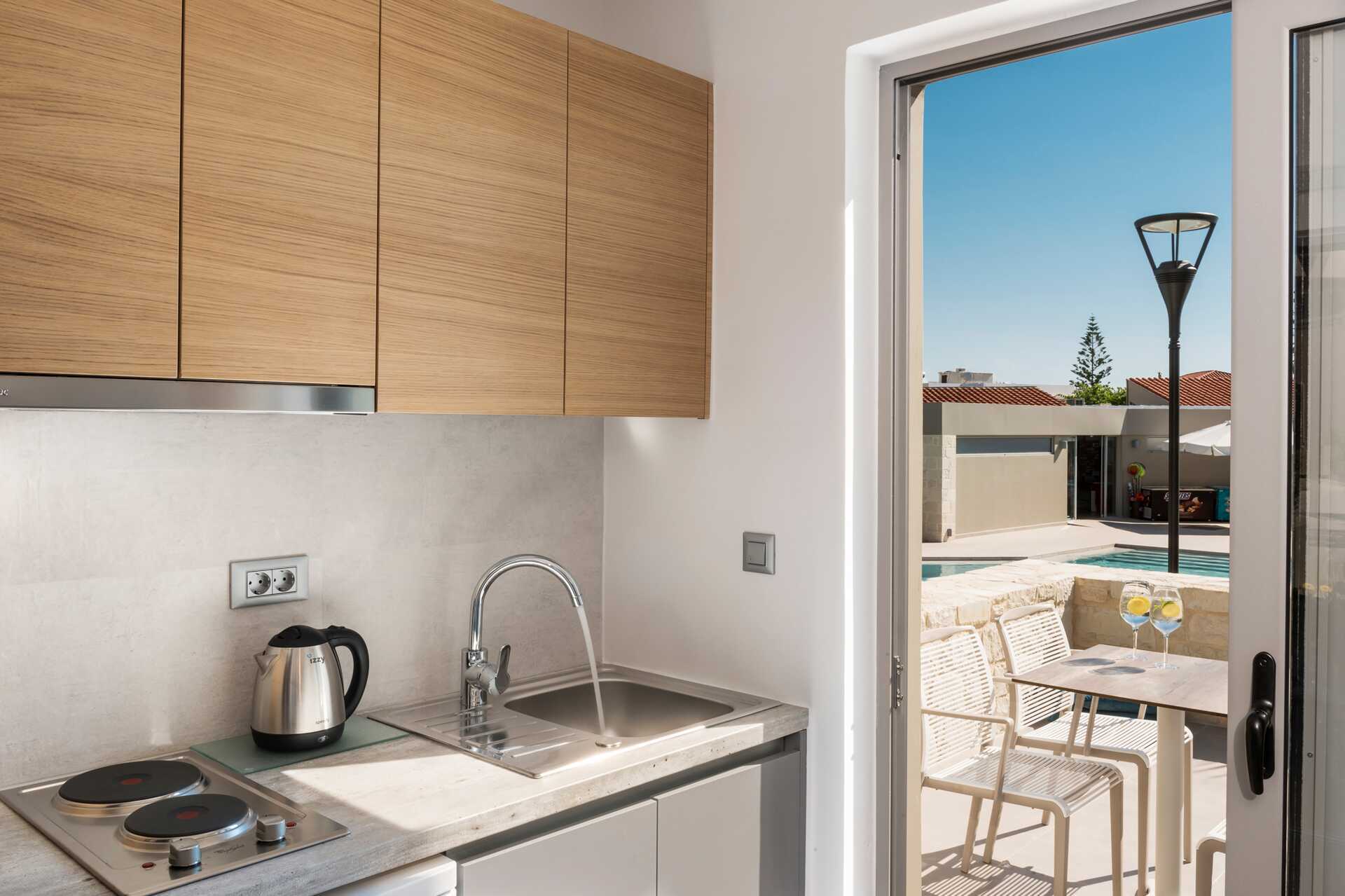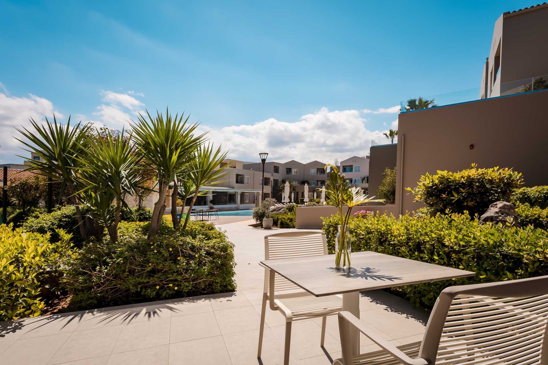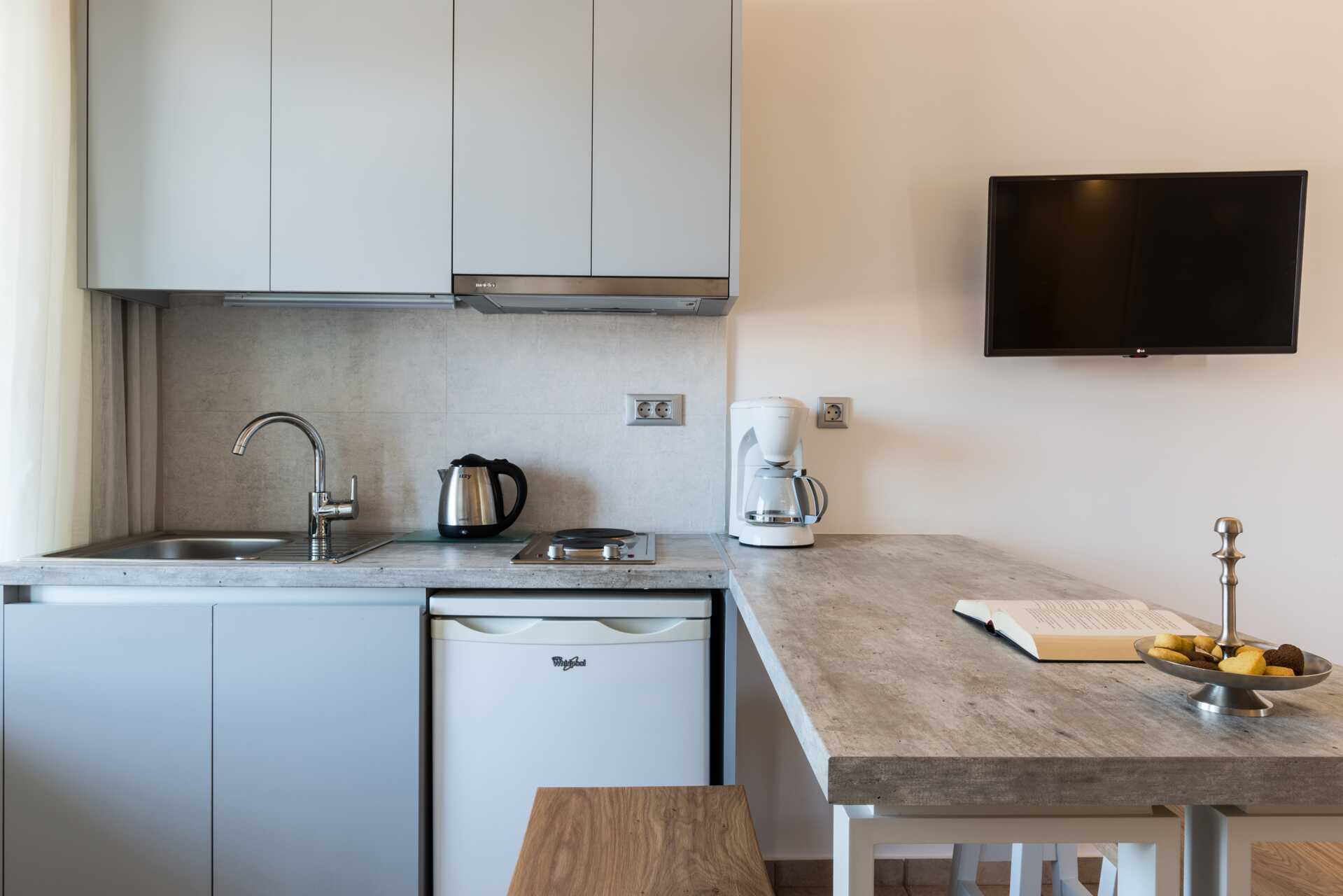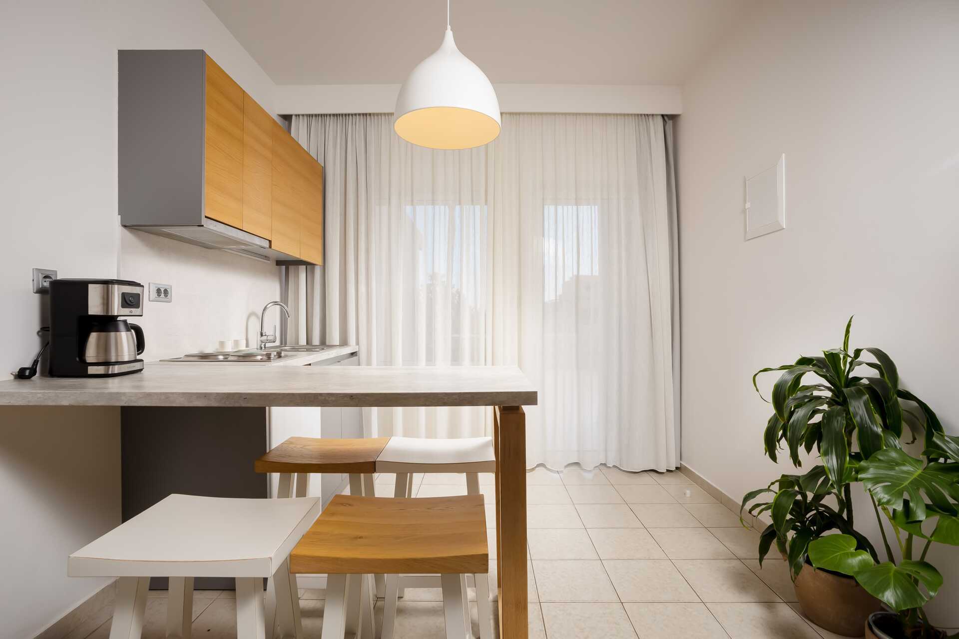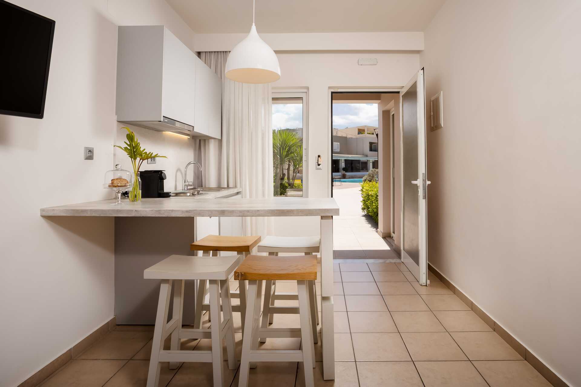 Ettromsleilighet med markterrasse og eget basseng. Terrassen er nås via en trapp. Leilighetene ligger i Elina-delen. På terrassen er det bord og stoler samt to solsenger. Kombinert soverom og minikjøkken. To enkeltsenger. Mulig med en ekstraseng i sovesofa. Minikjøkken med kokeplater, kjøleskap, kaffetrakter, vannkoker og enkelt kjøkkenutstyr. Wifi, luftkondisjonering og safe inkludert. TV. Hårføner. Baderom med dusj og wc. Rengjøring 6 ggr/uke. Ved bruk av barneseng blir leiligheten trang.