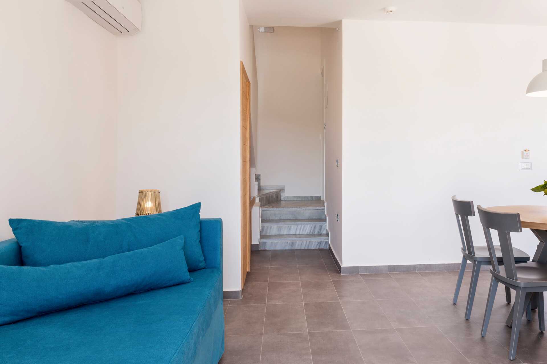 Toromsleilighet i etasje med balkong og eget basseng. Leilighetene ligger i Elina-delen. Det er bord og stoler samt solsenger ved bassenget. Stige ned i bassenget. I inngangsetasjen er det kombinert stue med minikjøkken og mulighet for ekstrasenger i sovesofa, bad med dusj og wc. Minikjøkken med kokeplater, kjøleskap, kaffetrakter, vannkoker og enkelt kjøkkenutstyr. En trapp opp er det et soverom, wc og balkong. Dør mellom rommene. Wifi, luftkondisjonering og safe inkludert. TV. Hårføner. Rengjøring 6 ggr/uke. Det er kun plass til en barneseng nede, noe som betyr at vi ikke anbefaler at barneseng benyttes i denne typen leilighet.