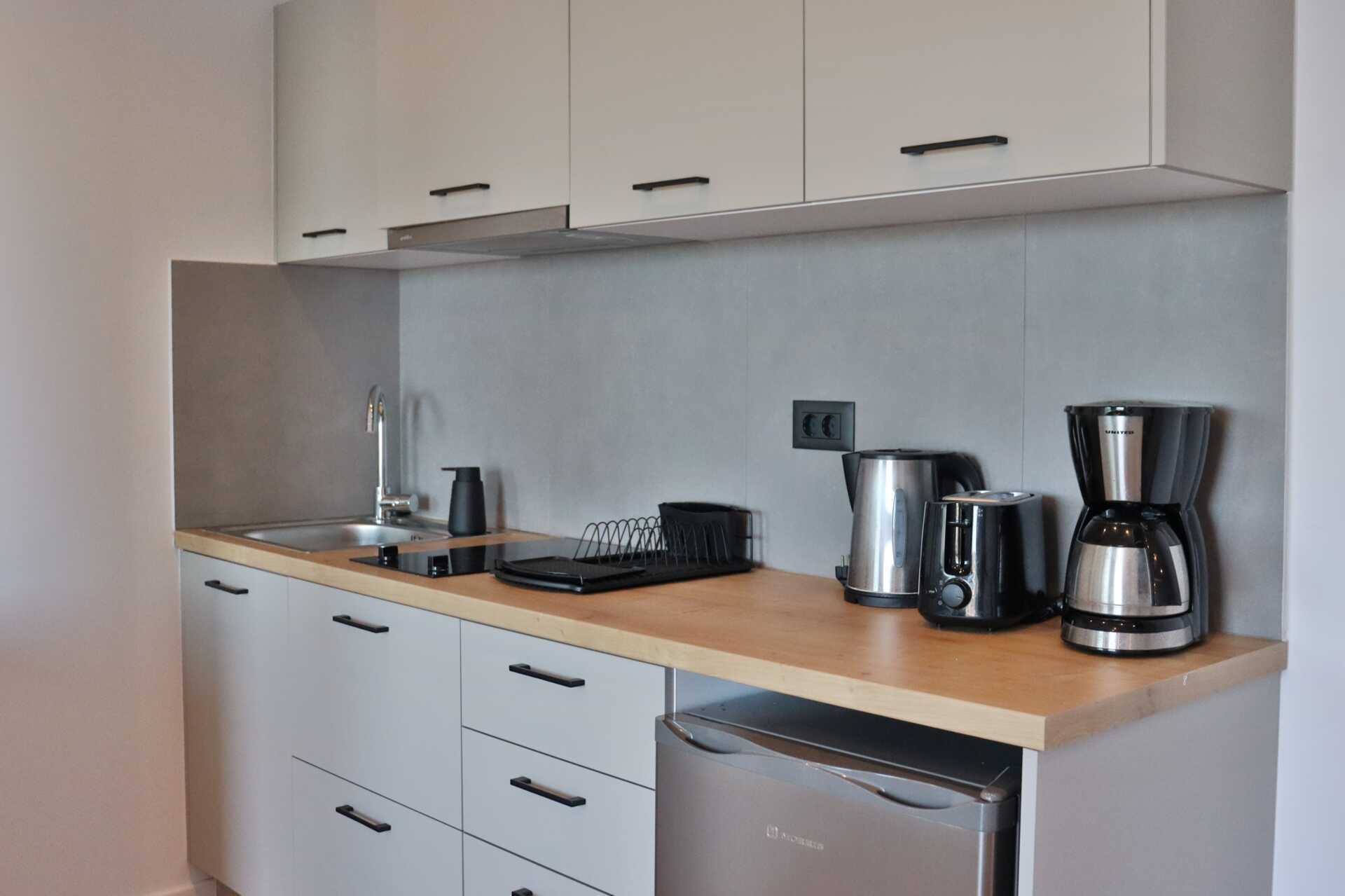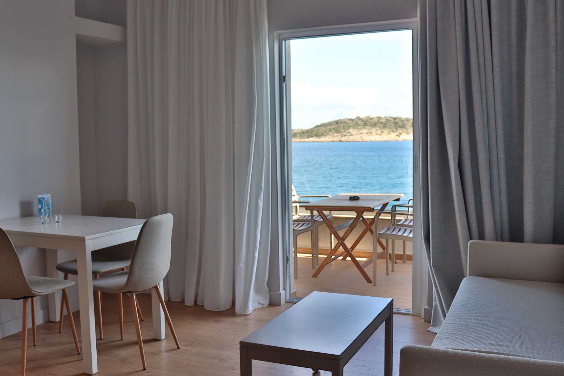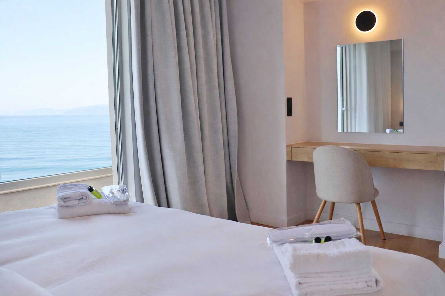 Toromsleilighet med balkong eller terrasse og havutsikt. Et soverom og en stue med minikjøkken. En dobbeltseng eller to enkeltsenger. Mulig med ekstraseng i sovesofa med uttrekkbar seng. Minikjøkken med kokeplater, kjøleskap, vannkoker, kaffetrakter og enkelt kjøkkenutstyr. Wifi, luftkondisjonering og safe inkludert. TV med én lokal kanal. Hårføner. Dusj og wc. Rengjøring 6 ggr/uke.