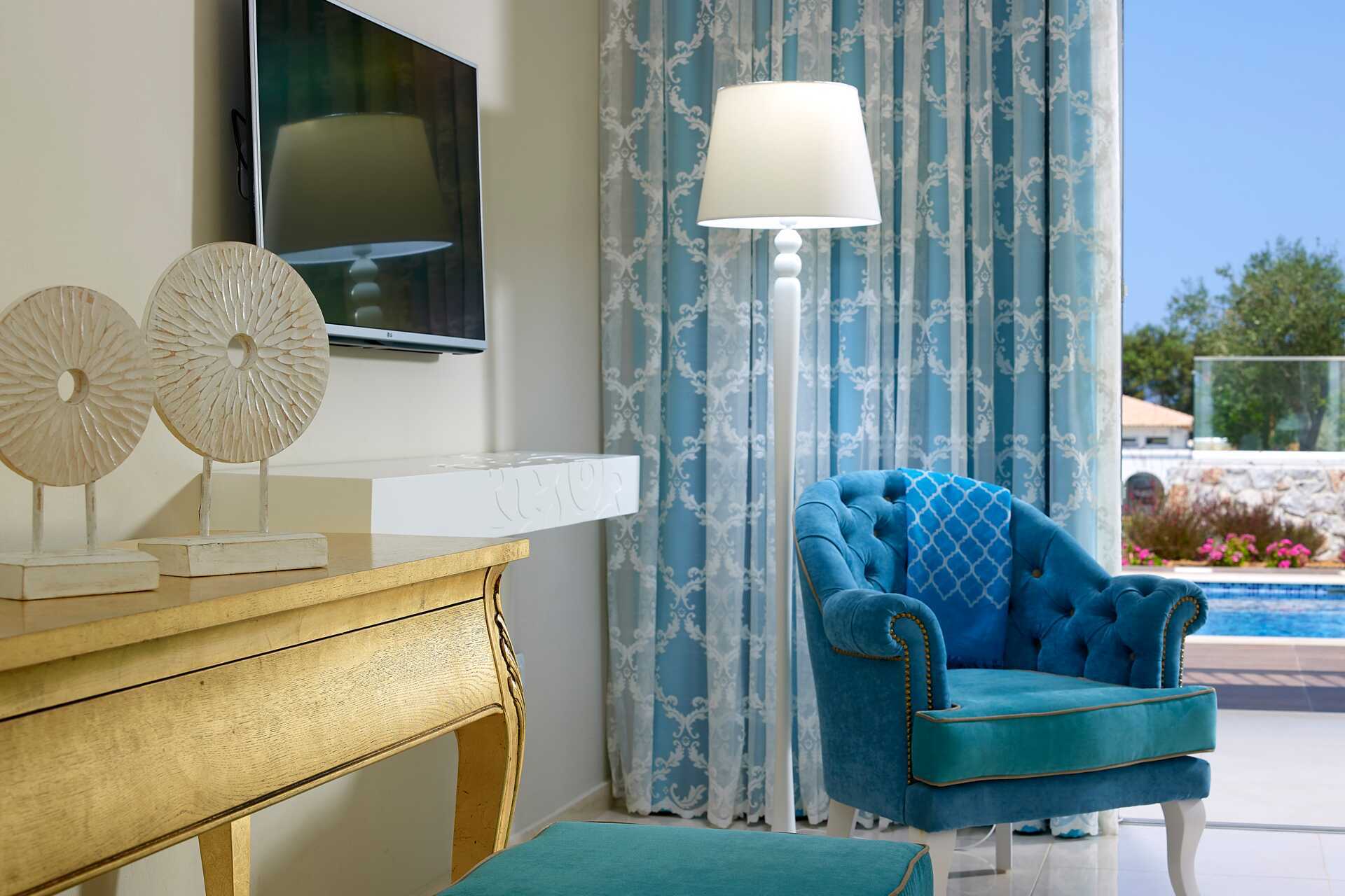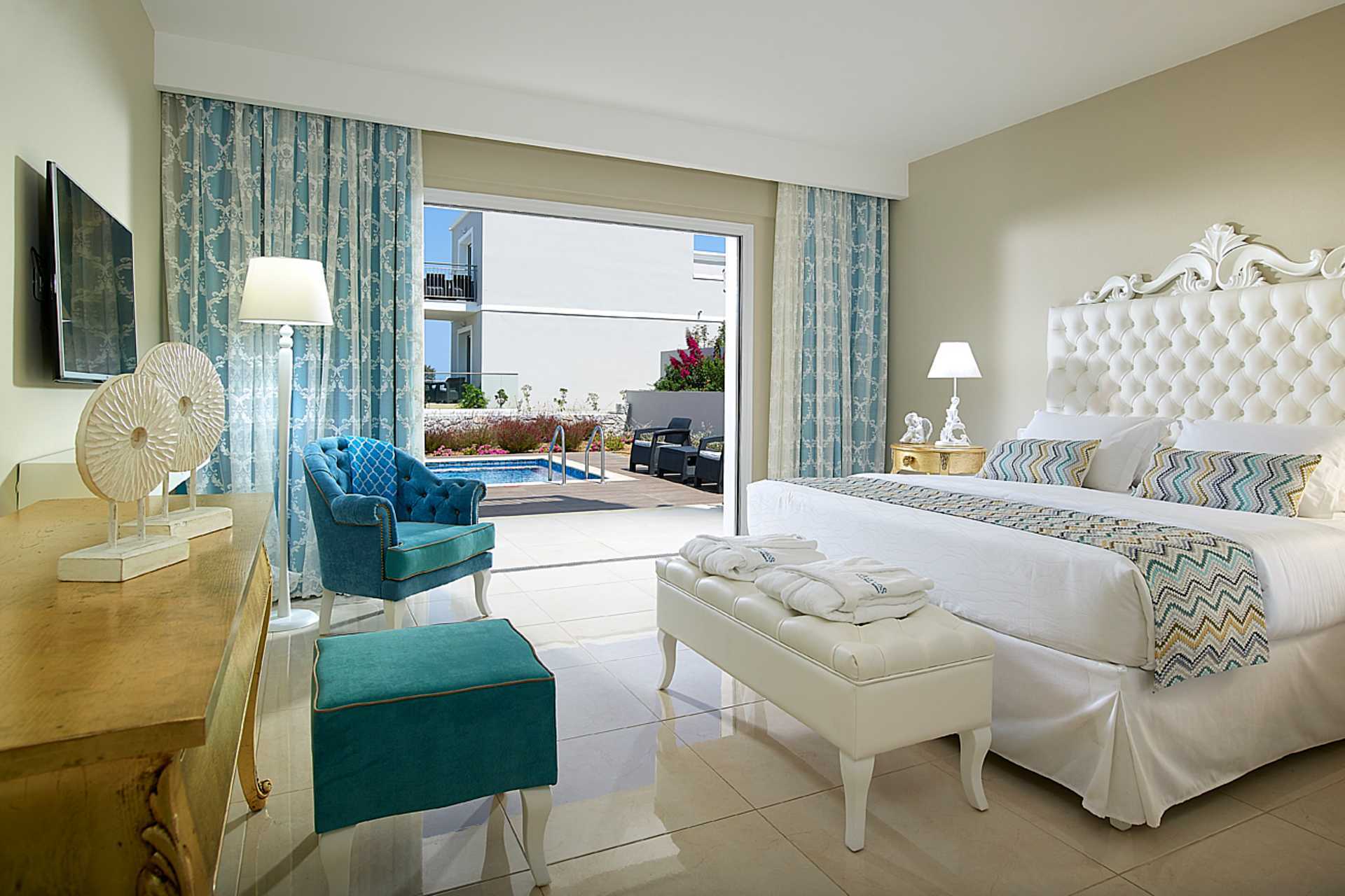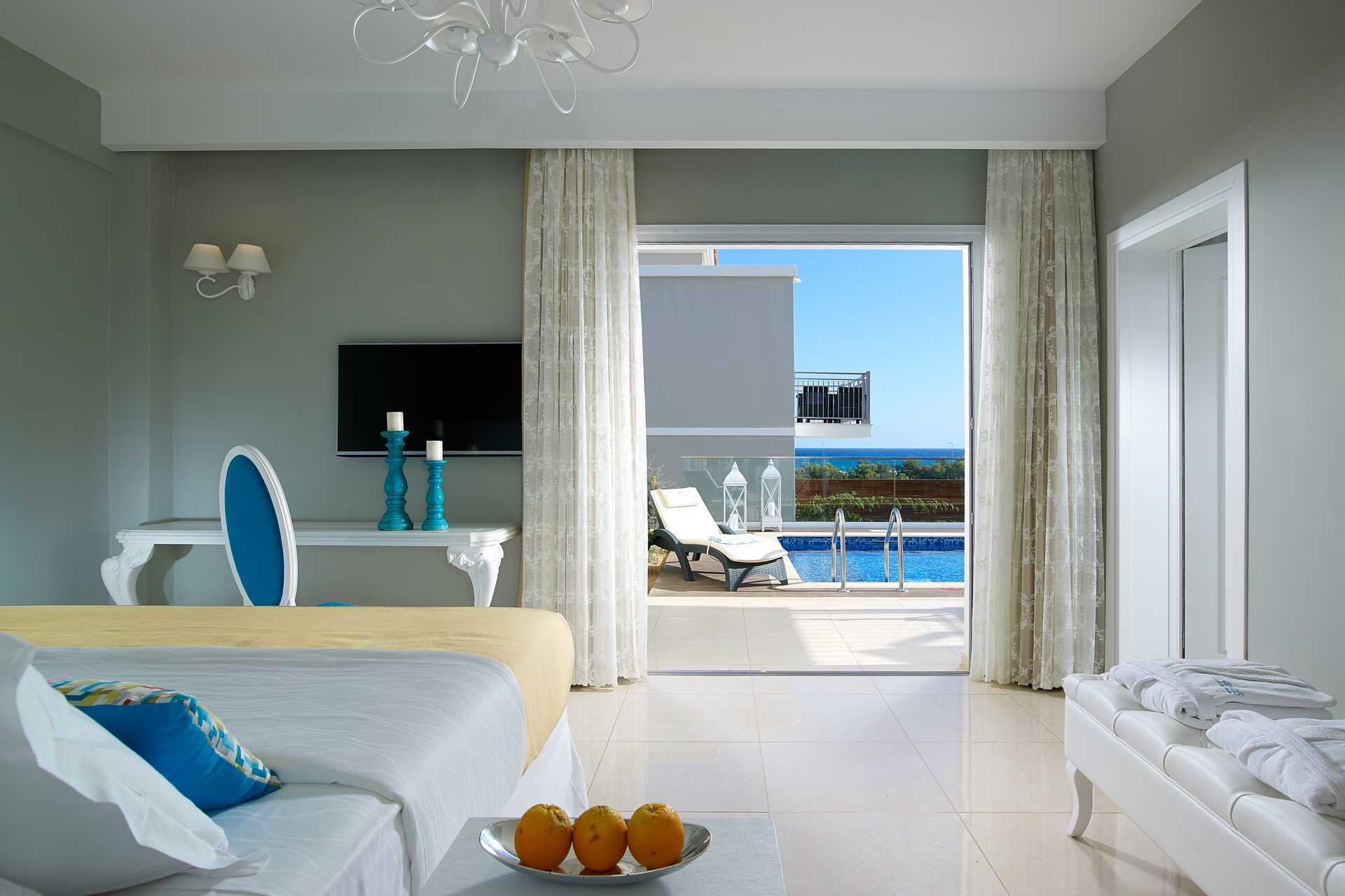 Suite med eget basseng på markterrassen. Suiten består av et soverom og en stue. En dobbeltseng eller to enkeltsenger. Mulig med ekstrasenger i to sovesofaer. Velg din favorittpute fra hotellets putemeny. Wifi, luftkondisjonering og safe inkludert. Minibar. Vannkoker samt kaffe og te. Nespresso kaffemaskin, to kapsler inkludert ved ankomst, deretter må de kjøpes. TV. Strykejern og strykebrett. Badekåper og tøfler Hårføner. Badekar eller dusj samt wc. Rengjøring 7 ggr/uke. Barn under 2 år regnes inn i maksantallet i rommet.