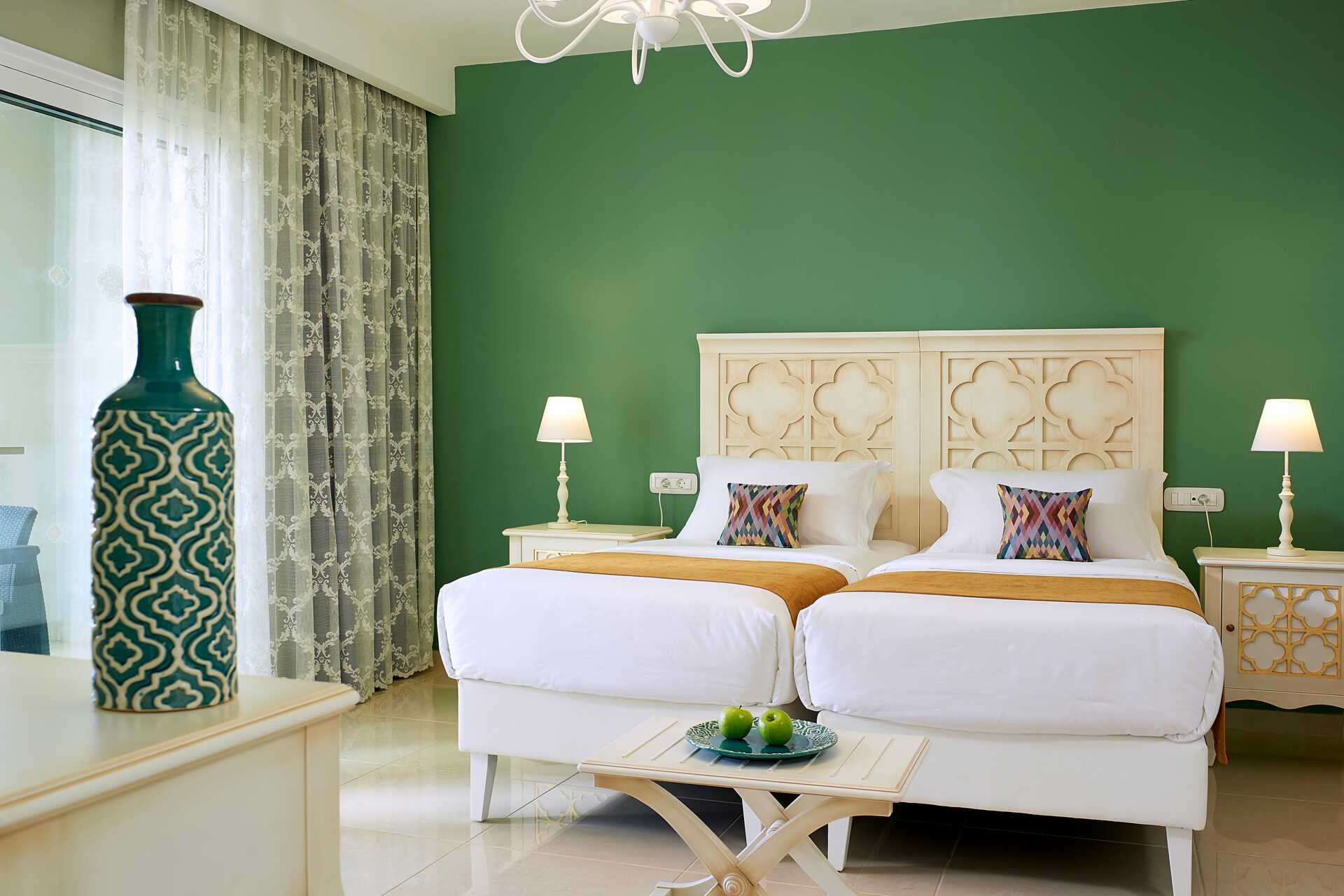 Familierom med tilgang til delt basseng og bassengutsikt fra terrassen. Familierommet består av to soverom. I det ene rommet er det en dobbeltseng og i det andre er det to enkeltsenger. Velg din favorittpute fra hotellets putemeny. Wifi, luftkondisjonering og safe inkludert. Minibar. Vannkoker samt kaffe og te. Nespresso kaffemaskin, to kapsler inkludert ved ankomst, deretter må de kjøpes. TV. Strykejern og strykebrett. Badekåper og tøfler Hårføner. Badekar eller dusj samt wc. Rengjøring 7 ggr/uke. Barn under 2 år regnes inn i maksantallet i rommet.