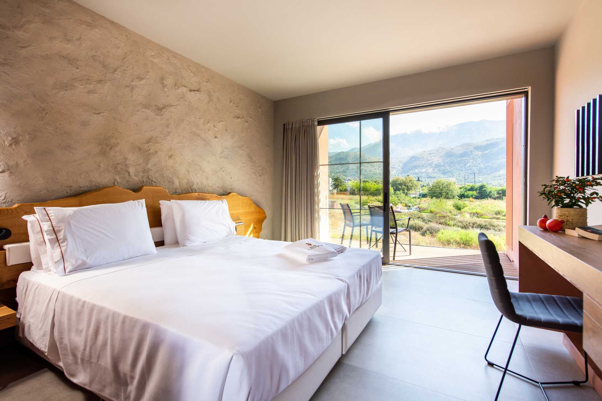 Dobbeltrom med balkong eller terrasse. En dobbeltseng eller to enkeltsenger. Wifi, luftkondisjonering og safe inkludert. Minibar. Nespressomaskin, kapsler inkludert. TV. Hårføner. Glassdør mellom soverom og bad. Frostede glassvegger til dusj og toalett. Rengjøring 7 ggr/uke.
