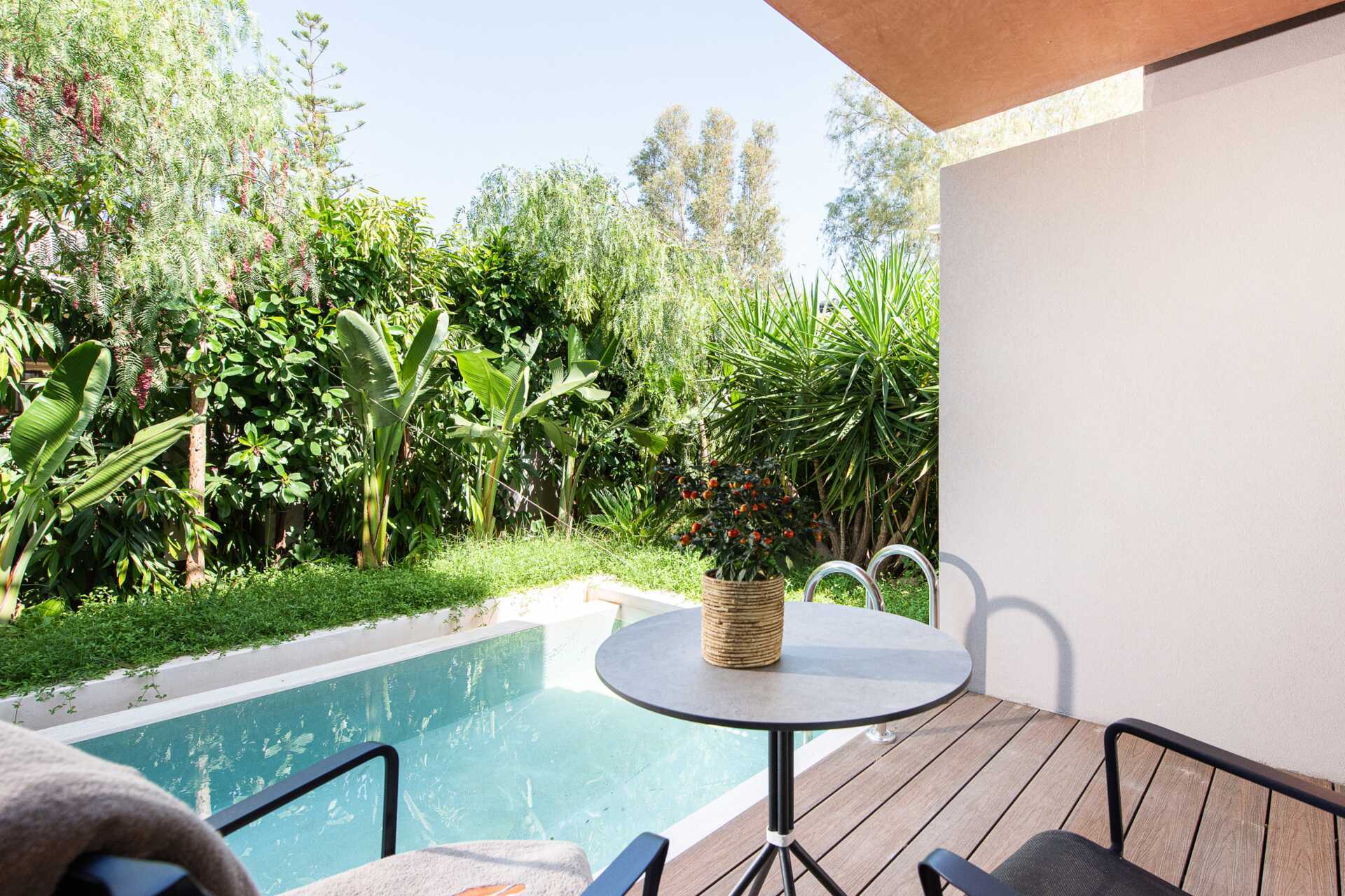 Suite med eget basseng på ca. 20 kvadratmeter på uteplassen. På terrassen er det stoler og bord og stige ned i bassenget. Suiten består av en stue og et soverom. En dobbeltseng. Mulig med ekstrasenger i sovesofa. Wifi, luftkondisjonering og safe inkludert. Minibar. Nespressomaskin, kapsler inkludert. TV. Hårføner. Glassdør mellom soverom og bad. Frostede glassvegger for dusj og toalett. Rengjøring 7 ggr/uke.