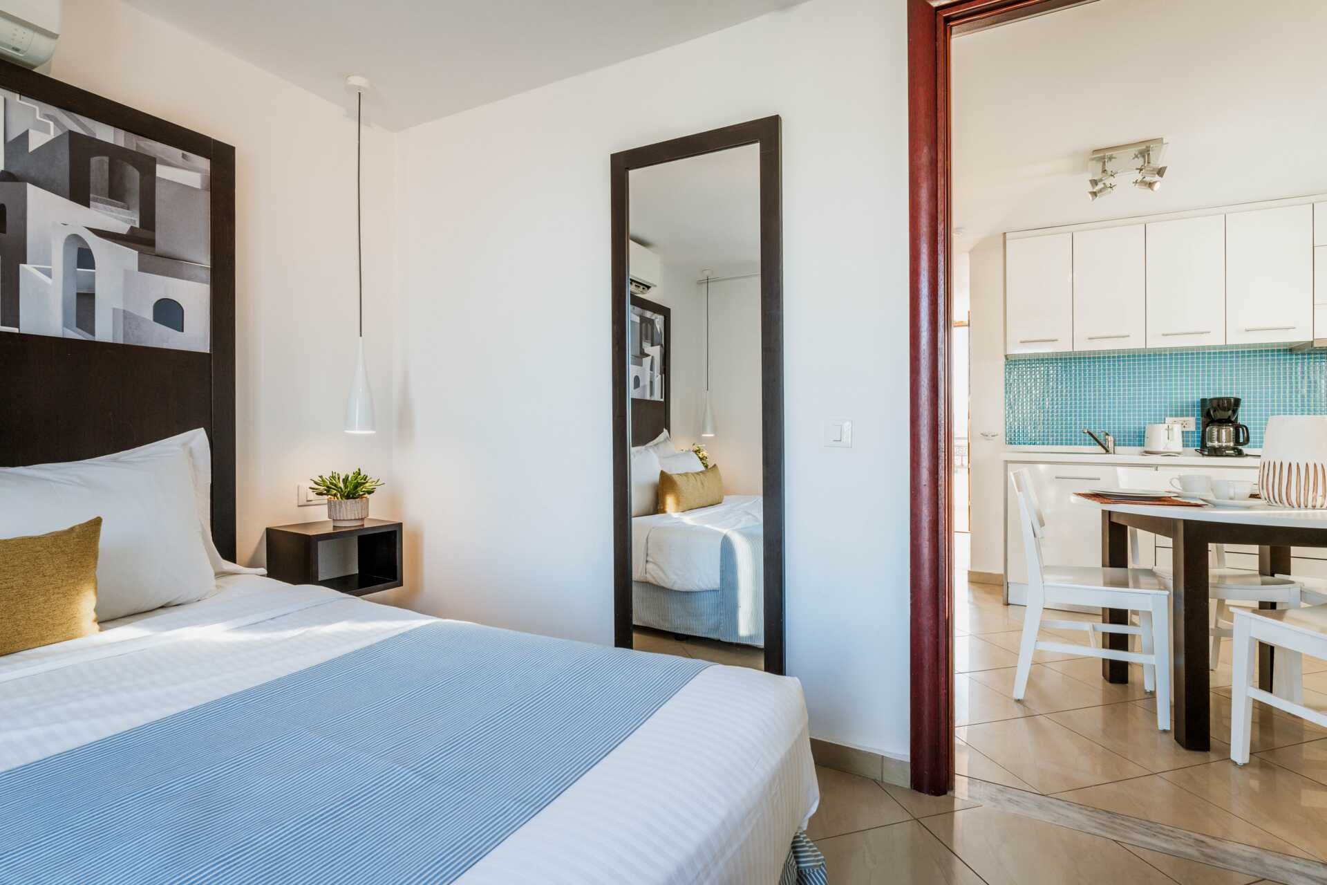 Ettromsleilighet med balkong, noen med bassengutsikt. Leilighetene ligger i Olympusdelen av hotellet. Soverom kombinert med minikjøkken. En dobbeltseng. Mulig med en ekstraseng i sovesofa. Minikjøkken med kjøleskap, kokeplater, kaffetrakter, brødrister og enkelt kjøkkenutstyr. Wifi, luftkondisjonering og safe inkludert. TV. Hårføner. Dusj og wc. Rengjøring 6 ggr/uke.