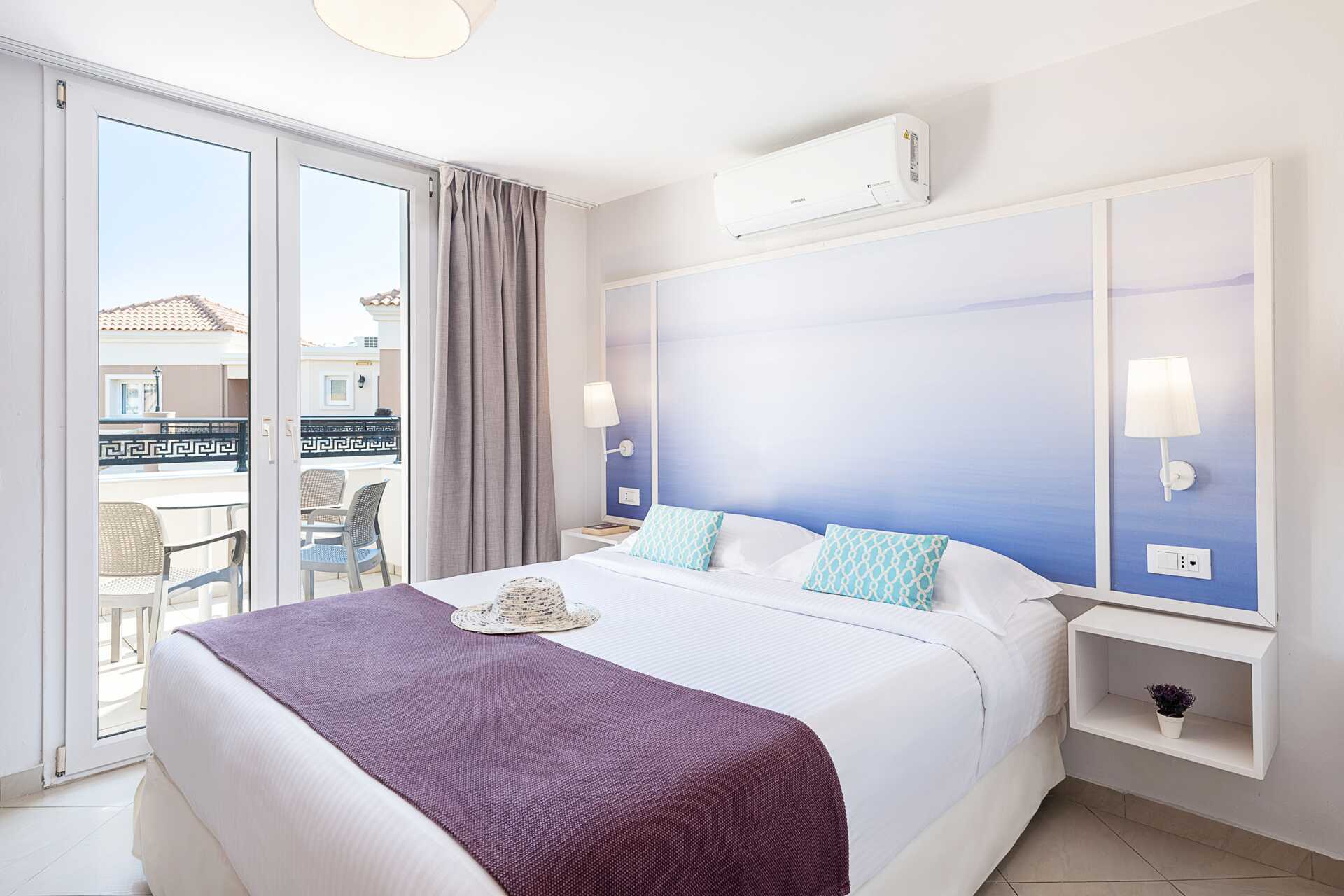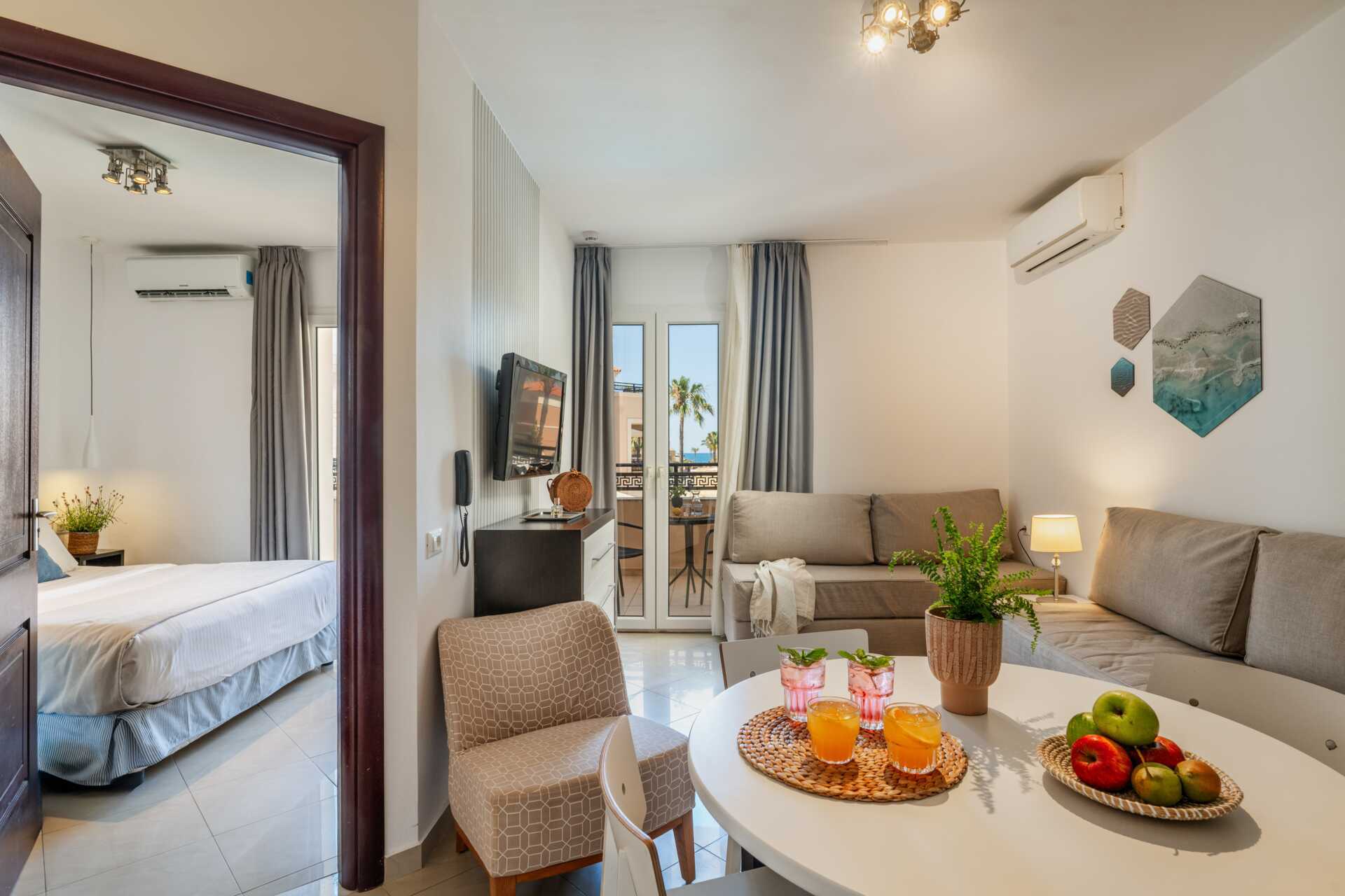Toromsleilighet med balkong, noen med havutsikt eller begrenset havutsikt. Leilighetene ligger i Aphrodite-delen av hotellet, nærmere havet. Rommene for opptil tre personer er på cirka 28-30 kvadratmeter, rommene for opptil fire personer cirka 30-40 kvadratmeter. Et soverom og stue med minikjøkken. En dobbeltseng. Mulig med en ekstraseng i sovesofa. Minikjøkken med kjøleskap, kokeplater, kaffetrakter, brødrister og enkelt kjøkkenutstyr. Wifi, luftkondisjonering og safe inkludert. TV. Hårføner. Dusj og wc. Rengjøring 6 ggr/uke.