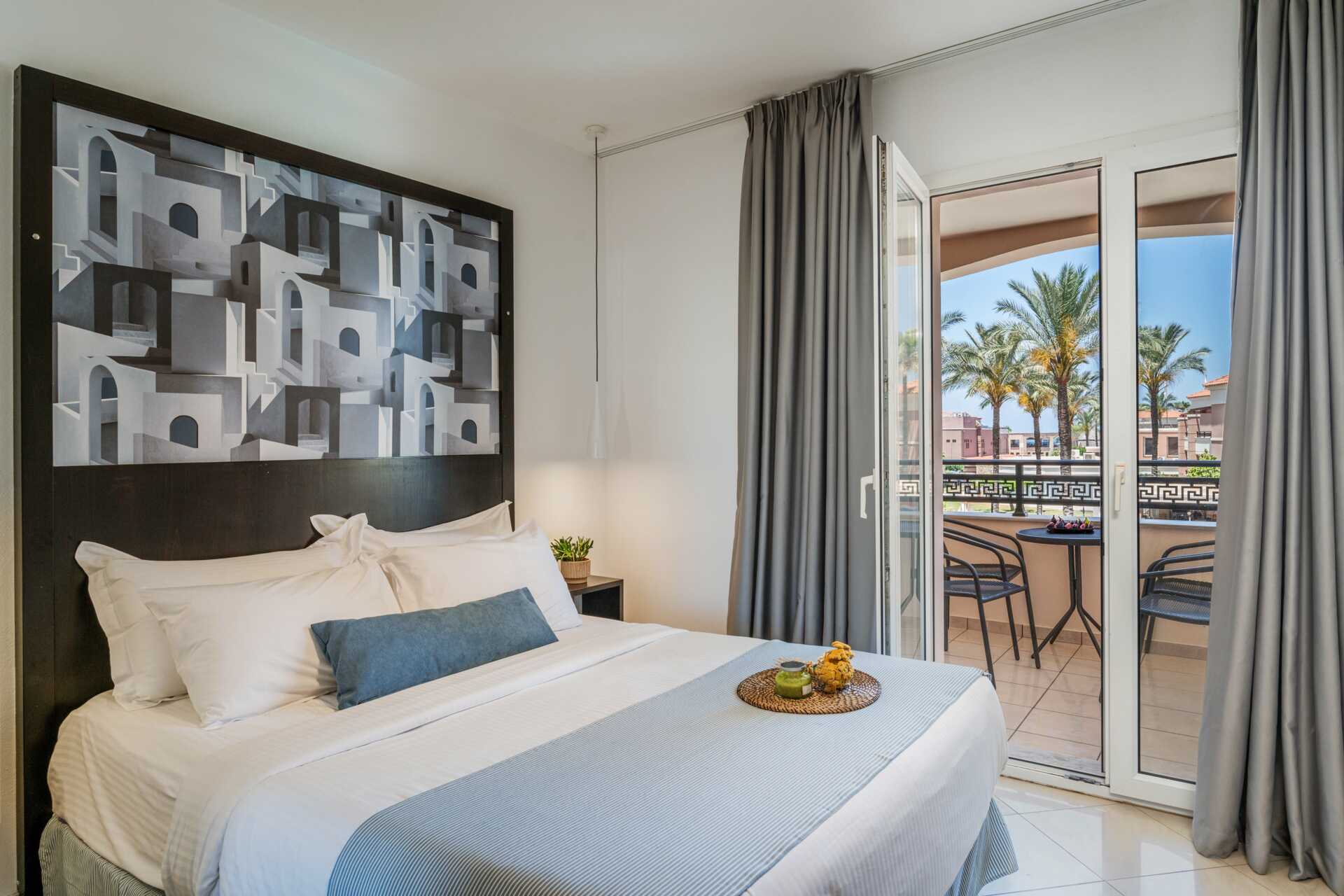 Toromsleilighet i etasje med balkong, noen med begrenset havutsikt. Leilighetene ligger i Aphrodite-delen av hotellet, nærmere sjøen. I første etasje er det en minikjøkken og et soverom med en dobbeltseng. En trapp opp er det mulig med ekstrasenger i sovesofaer på en sovehems. Minikjøkken med kjøleskap, kokeplater, kaffetrakter, brødrister og enkelt kjøkkenutstyr. Wifi, luftkondisjonering og safe inkludert. TV. Hårføner. Dusj og wc. Rengjøring 6 ggr/uke.