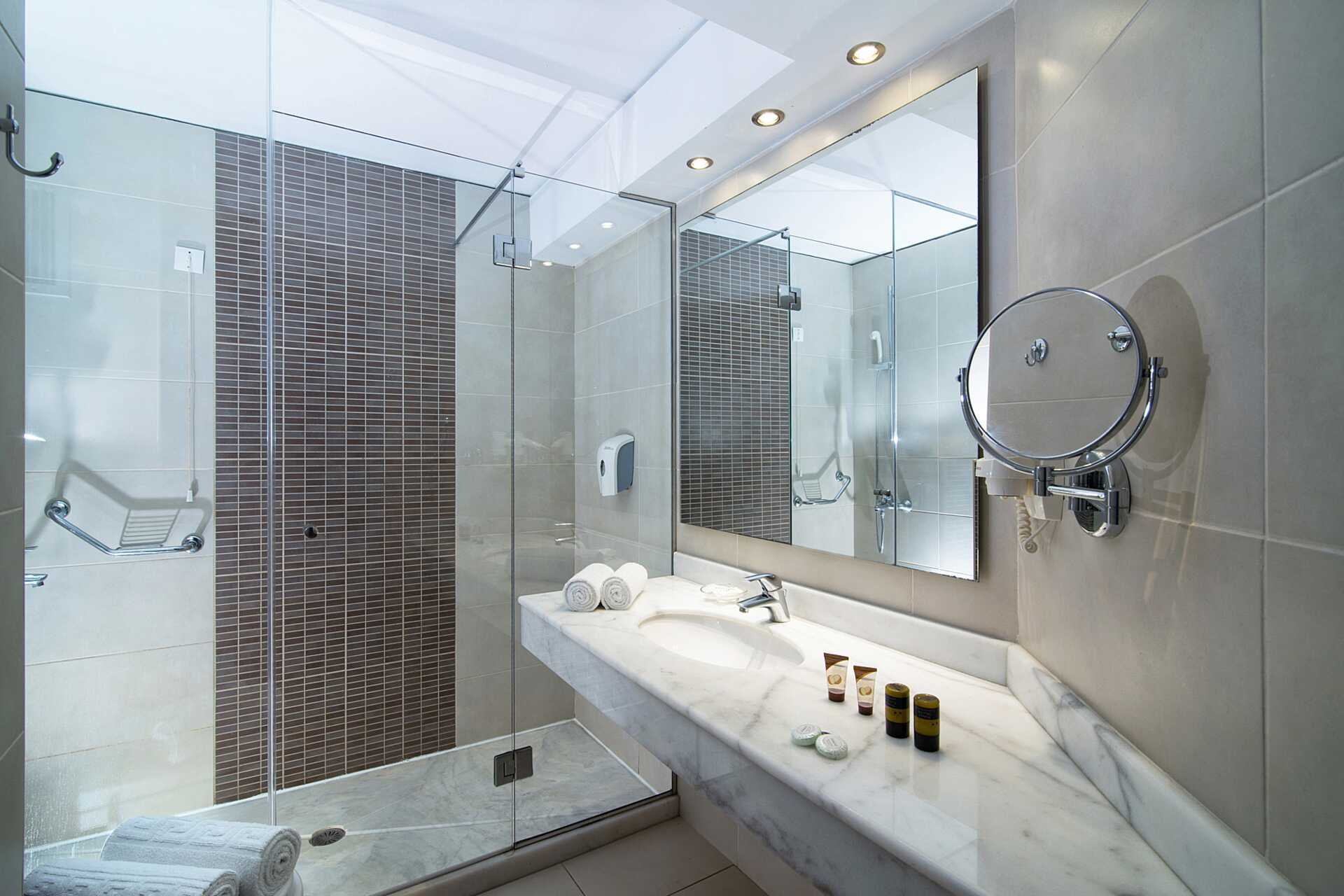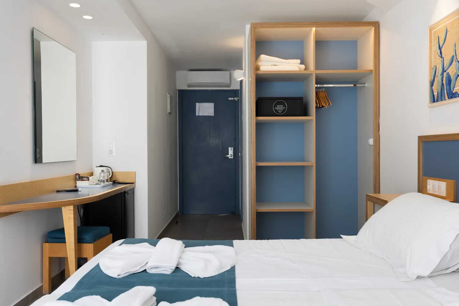 Dobbeltrom med balkong eller terrasse, noen med bassengutsikt og noen med begrenset havutsikt. En dobbeltseng eller to enkeltsenger. Wifi, luftkondisjonering og safe inkludert. Kjøleskap. Vannkoker samt kaffe og te. TV. Hårføner. Bad med dusj og wc. Rengjøring 7 ggr/uke.
