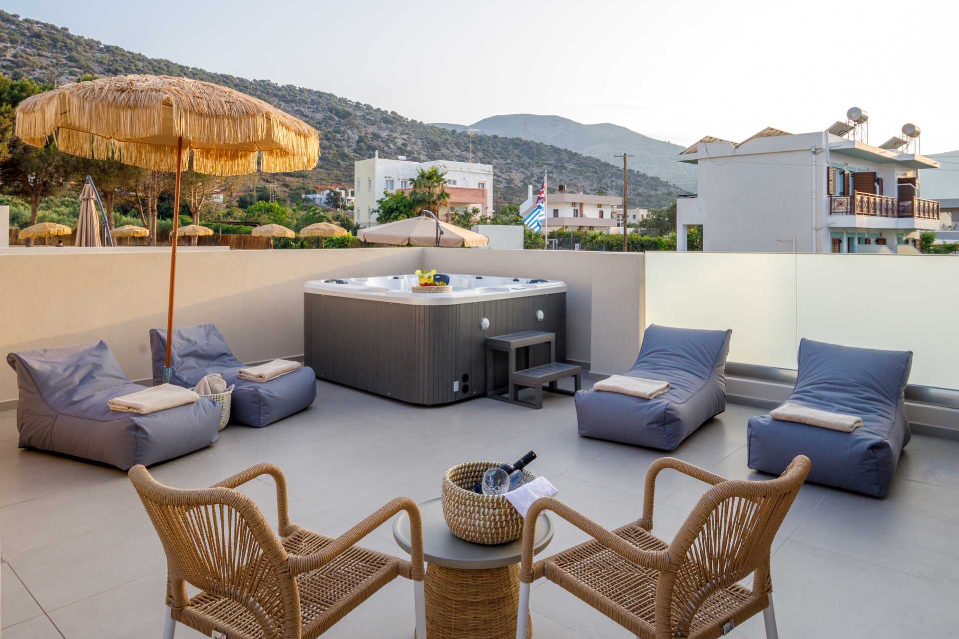 Juniorsuite med jacuzzi på balkongen. På balkongen er det solsenger og parasoller samt stoler og bord. En dobbeltseng. Wifi, luftkondisjonering og safe inkludert. Kjøleskap. Espressomaskin, kapsler inkludert. TV. Hårføner. Bad med dusj og wc. Rengjøring 7 ggr/uke.