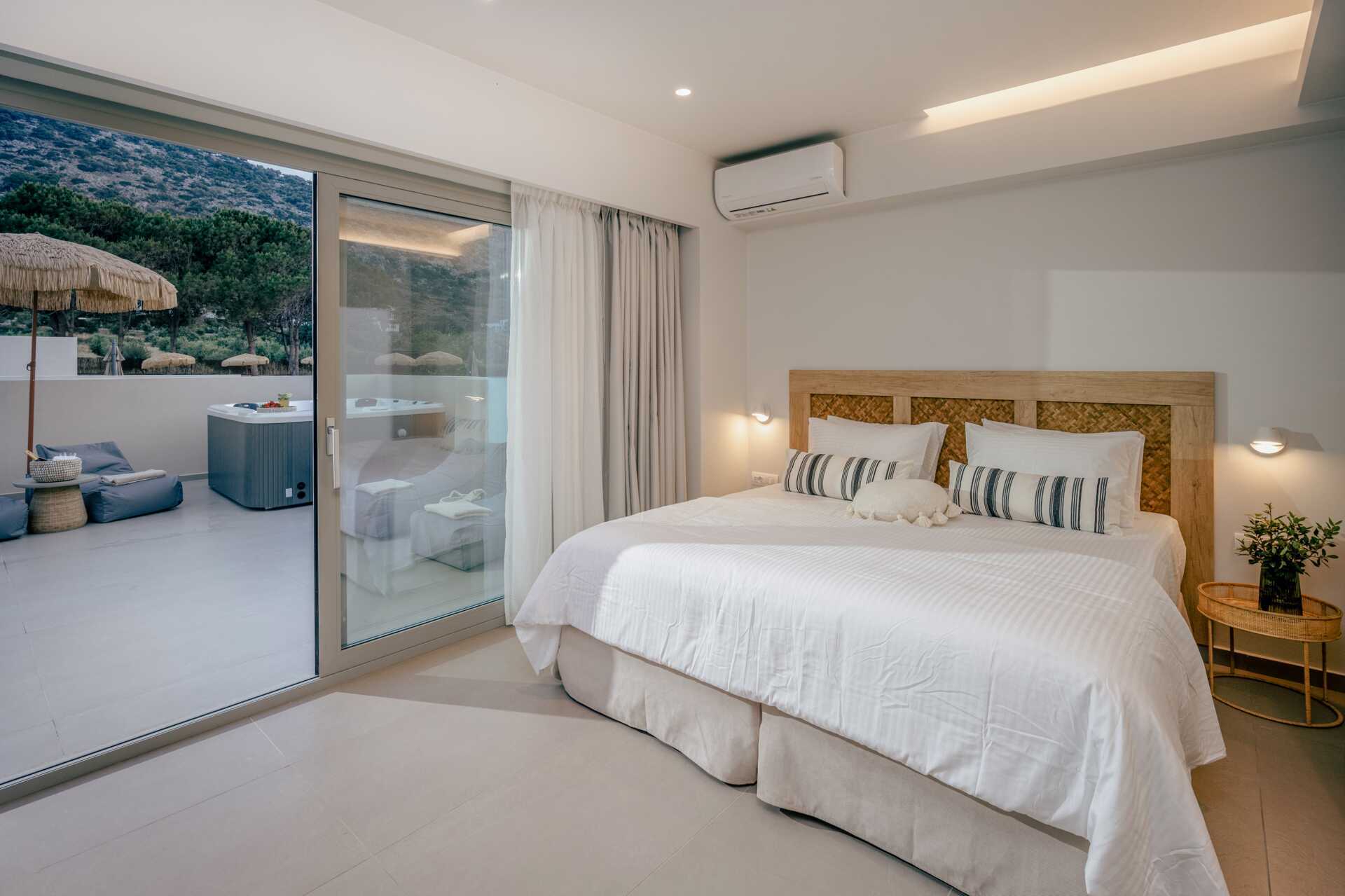 Juniorsuite med terrasse og eget basseng. På terrassen er det stoler og bord samt solsenger og parasoll. En dobbeltseng. Wifi, luftkondisjonering og safe inkludert. Kjøleskap. Espresso kaffemaskin, kapsler inkludert. Smart TV (Android). Hårføner. Dusj og wc. Rengjøring 7 ggr/uke.