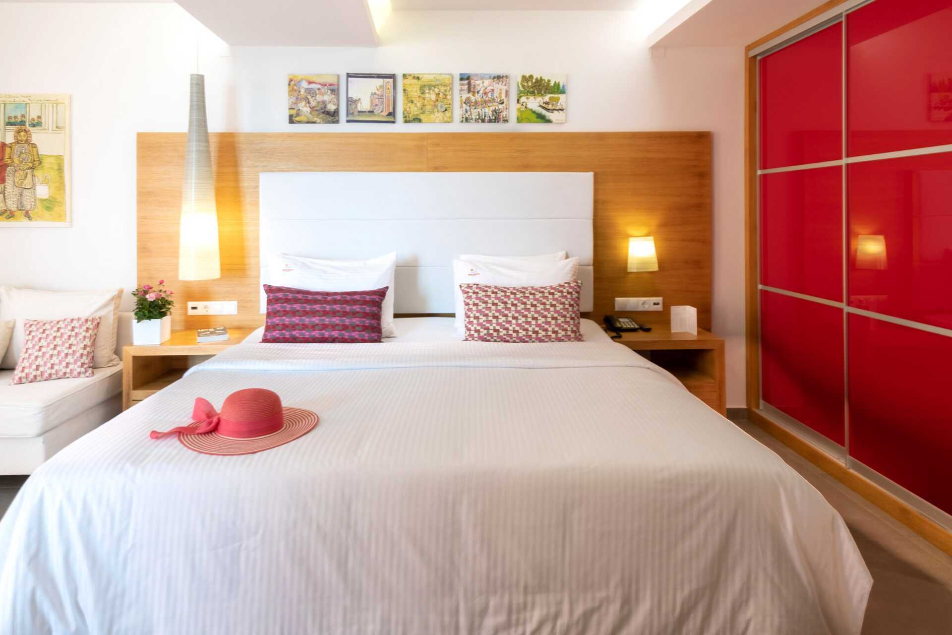 Deluxerom med balkong eller terrasse. En dobbeltseng eller to enkeltsenger. Mulig med ekstraseng i sovesofa på rom for tre personer. Wifi, luftkondisjonering og safe inkludert. Kjøleskap, en flaske vann er inkludert og etterfylles hver dag. Vannkoker samt kaffe og te. Nespresso kaffemaskin. kapsler. TV. Badekåper og tøfler. Badekar eller dusj samt wc. Rengjøring 7 ggr/uke. Barn under 2 år regnes inn i maksantallet i rommet.