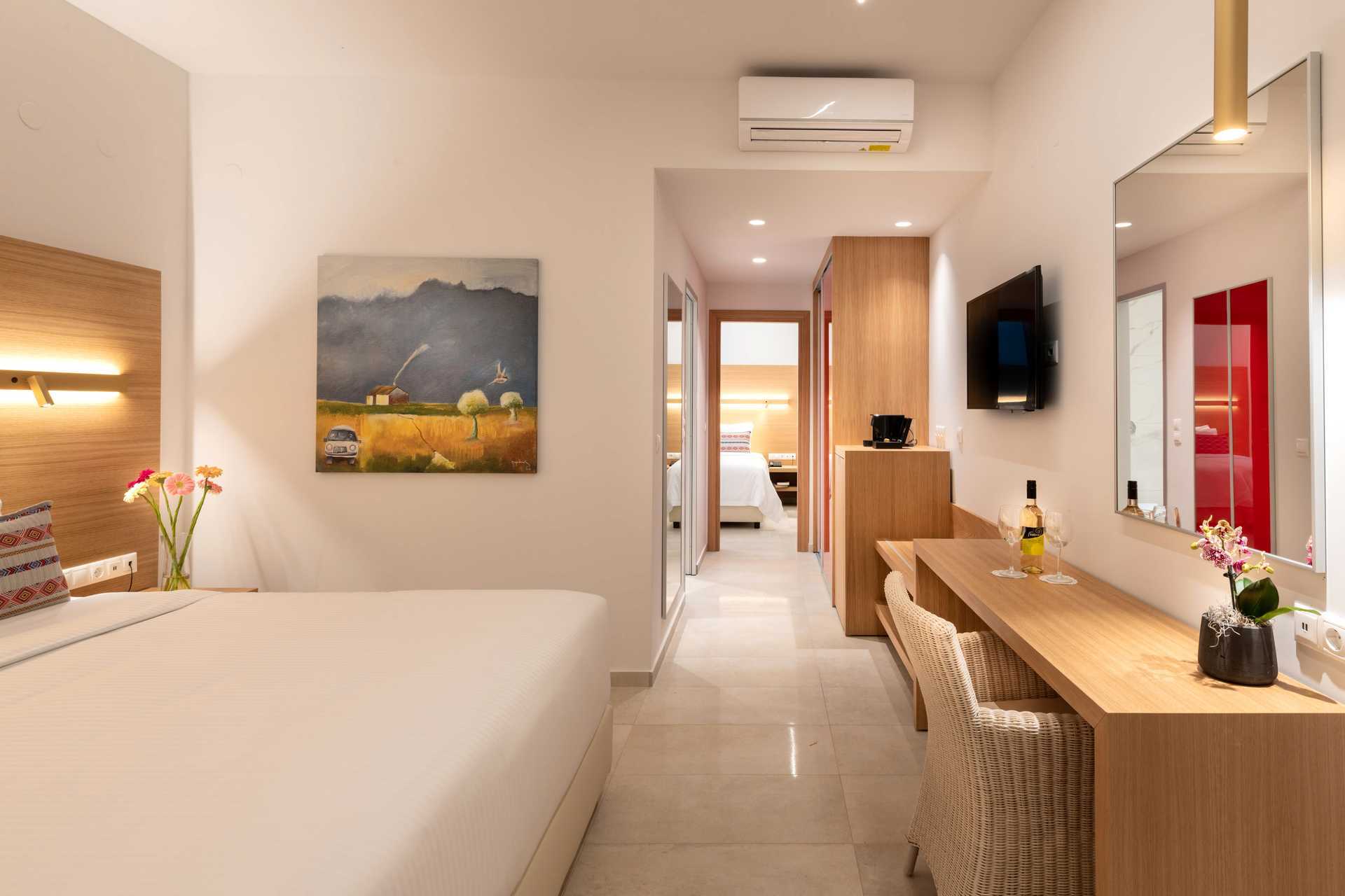 Suite med balkong eller terrasse og havutsikt. En dobbeltseng. Mulig med en ekstraseng i sovesofa. Wifi, safe og luftkondisjonering inkludert. Kjøleskap, en flaske vann er inkludert og etterfylles hver dag. Vannkoker samt kaffe og te. Nespresso kaffemaskin, kapsler inkludert. Ved ankomst får du en flaske kretisk vin, brus, frukt og snacks på rommet. TV. Badekåper og tøfler. Bad med badekar, separat dusj og wc. Rengjøring 7 ggr/uke. En parasoll og to solsenger er reservert for deg på stranden.