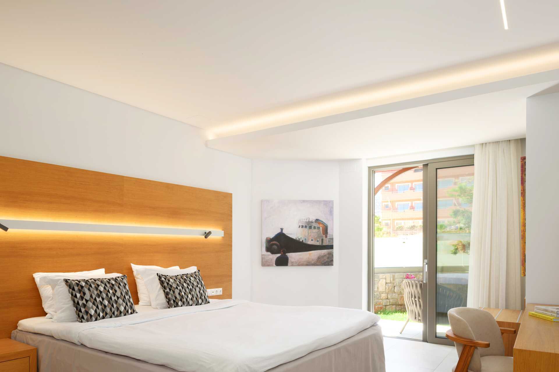 Deluxesuite med uteplass og delt basseng. Suiten har åpen planløsning mot badet. En dobbeltseng. Mulig med en ekstraseng i sovesofa. Putemeny. Wifi, safe og luftkondisjonering inkludert. Kjøleskap, en flaske vann inkludert og etterfylles hver dag. Vannkoker samt kaffe og te. Nespressomaskin, kapsler inkludert. Ved ankomst er det en flaske kretisk vin og brus på rommet. TV. Badekåper og tøfler. Bad med badekar, separat dusj og wc. Rengjøring 7 ggr/uke. En parasoll og to solsenger er reservert for deg på stranden.