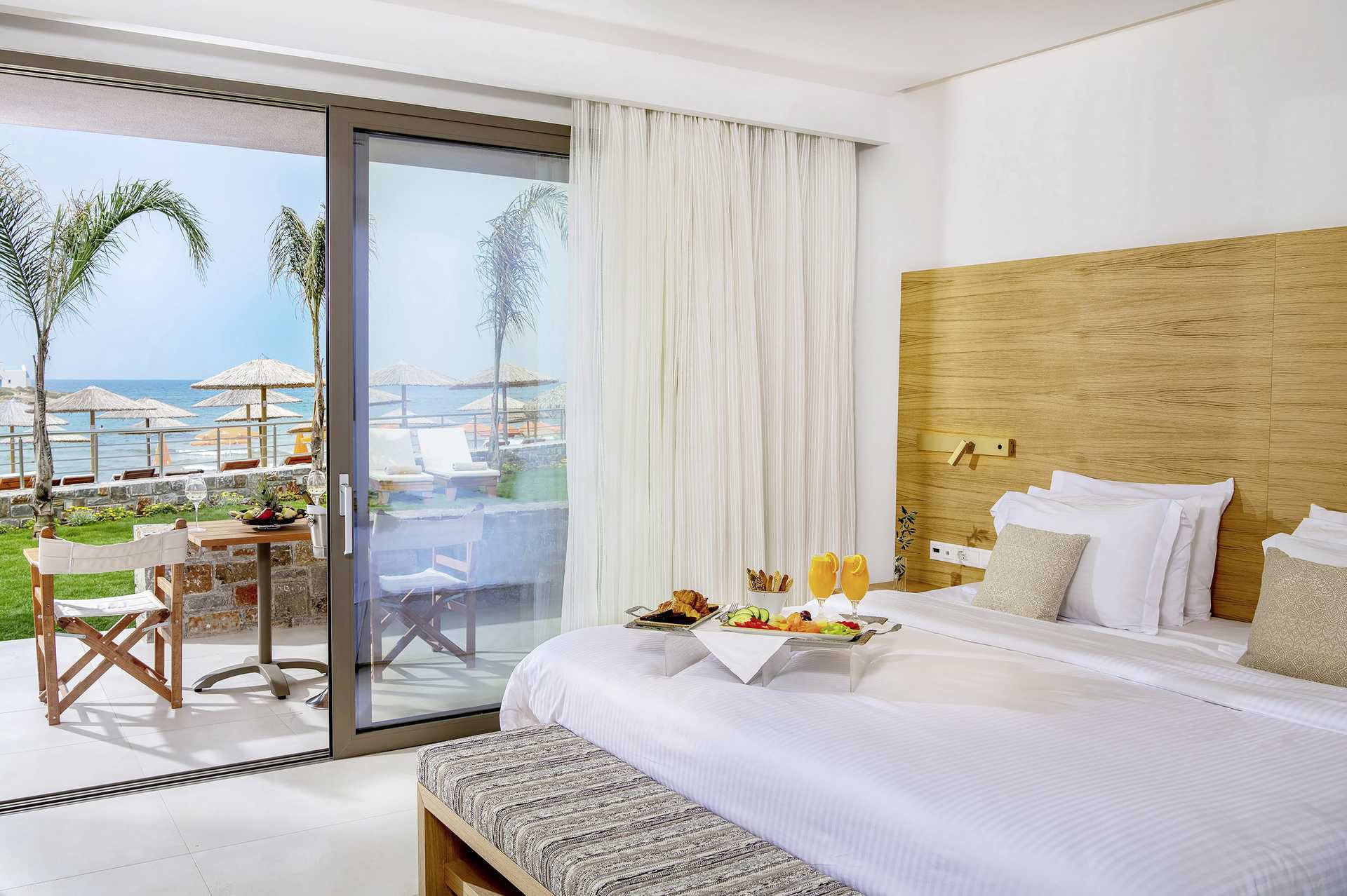Deluxesuite med balkong eller terrasse, noen med begrenset havutsikt og noen med havutsikt. Suiten har åpen planløsning til badet. En dobbeltseng. Mulig med en ekstraseng i sovesofa. Wifi, safe og luftkondisjonering inkludert. Kjøleskap, en flaske vann inkludert og etterfylles hver dag. Vannkoker samt kaffe og te. Nespressomaskin, kapsler inkludert. Ved ankomst er det en flaske kretisk vin og brus på rommet. TV. Badekåper og tøfler. Bad med badekar, separat dusj og wc. Rengjøring 7 ggr/uke. En parasoll og to solsenger er reservert for deg på stranden.