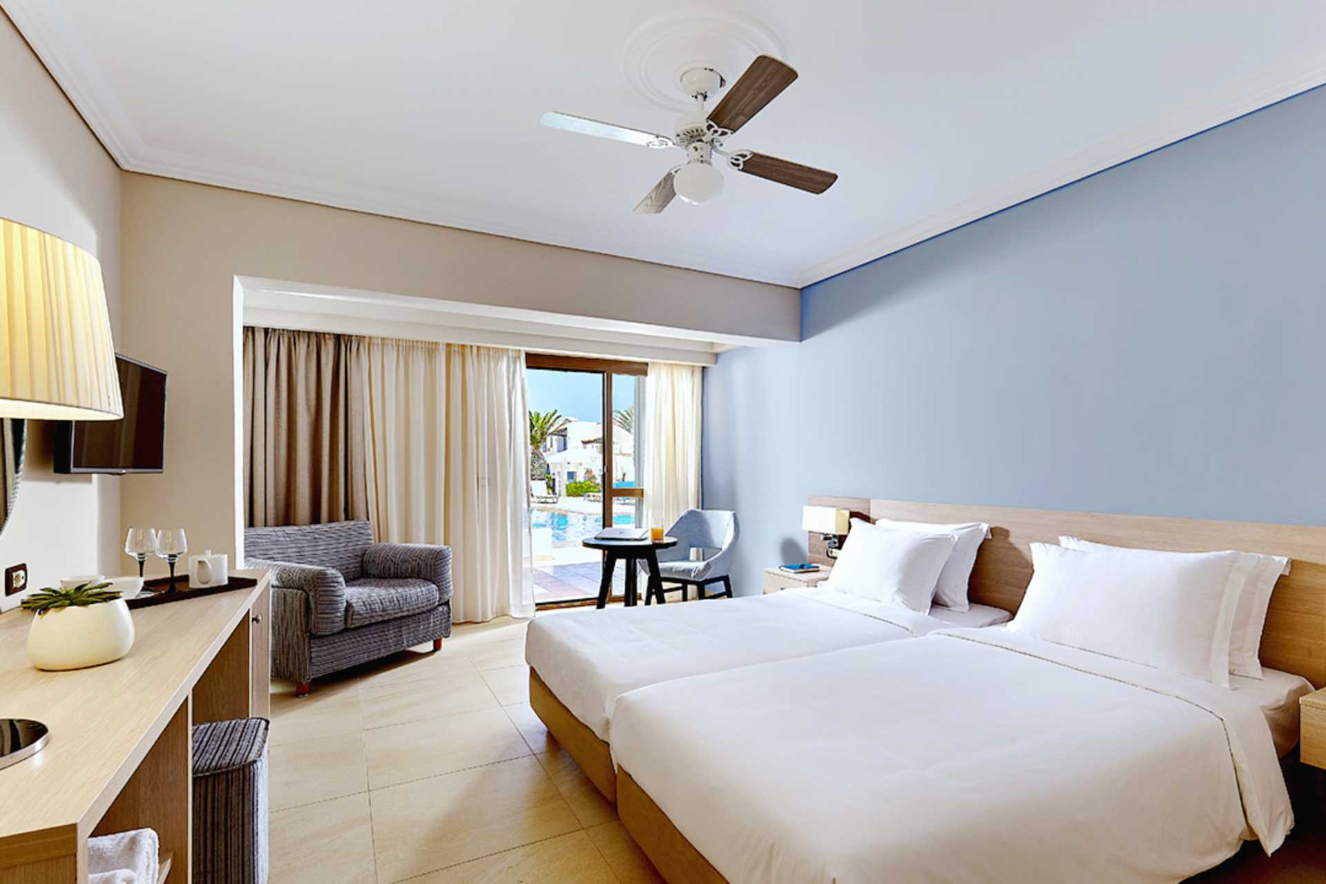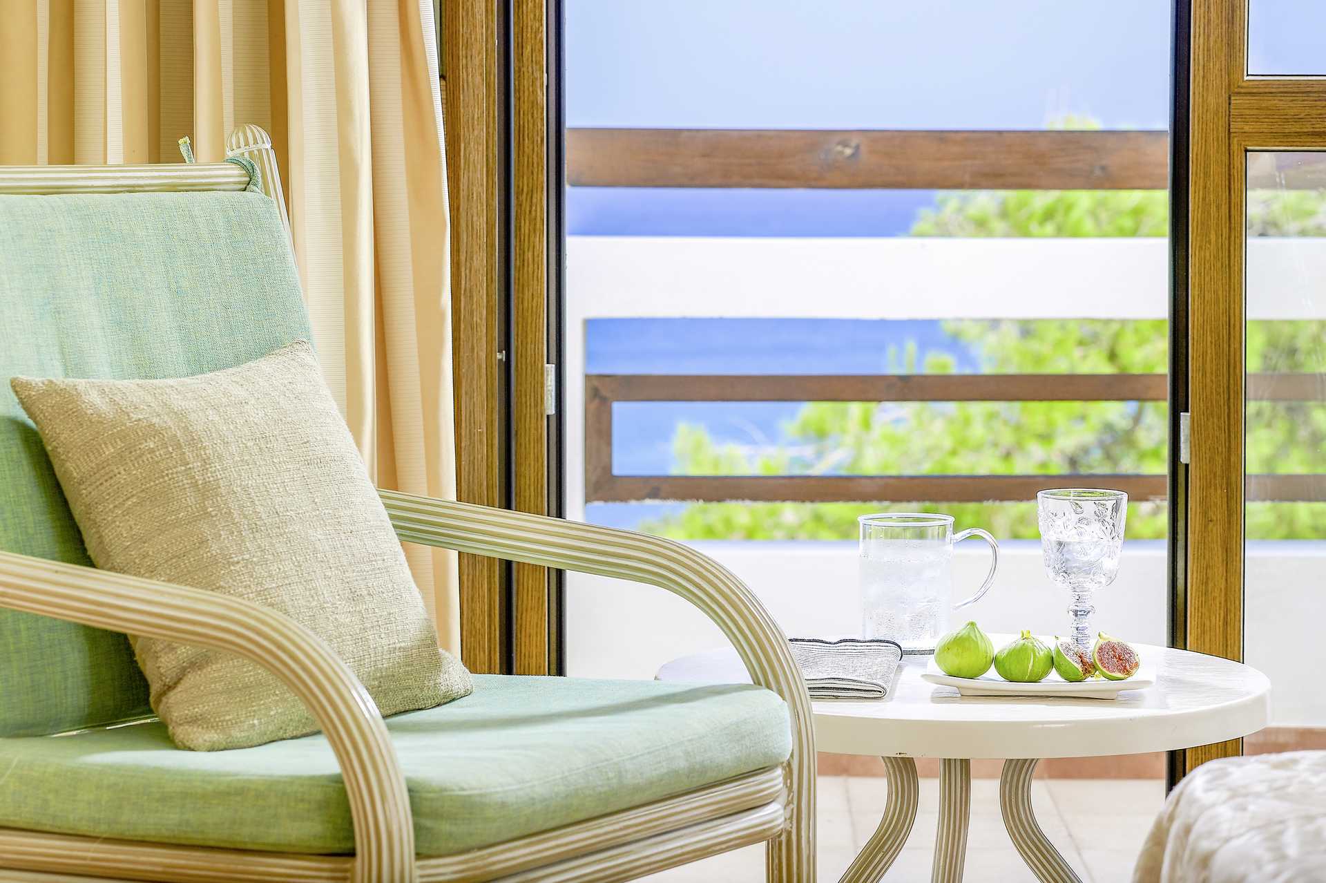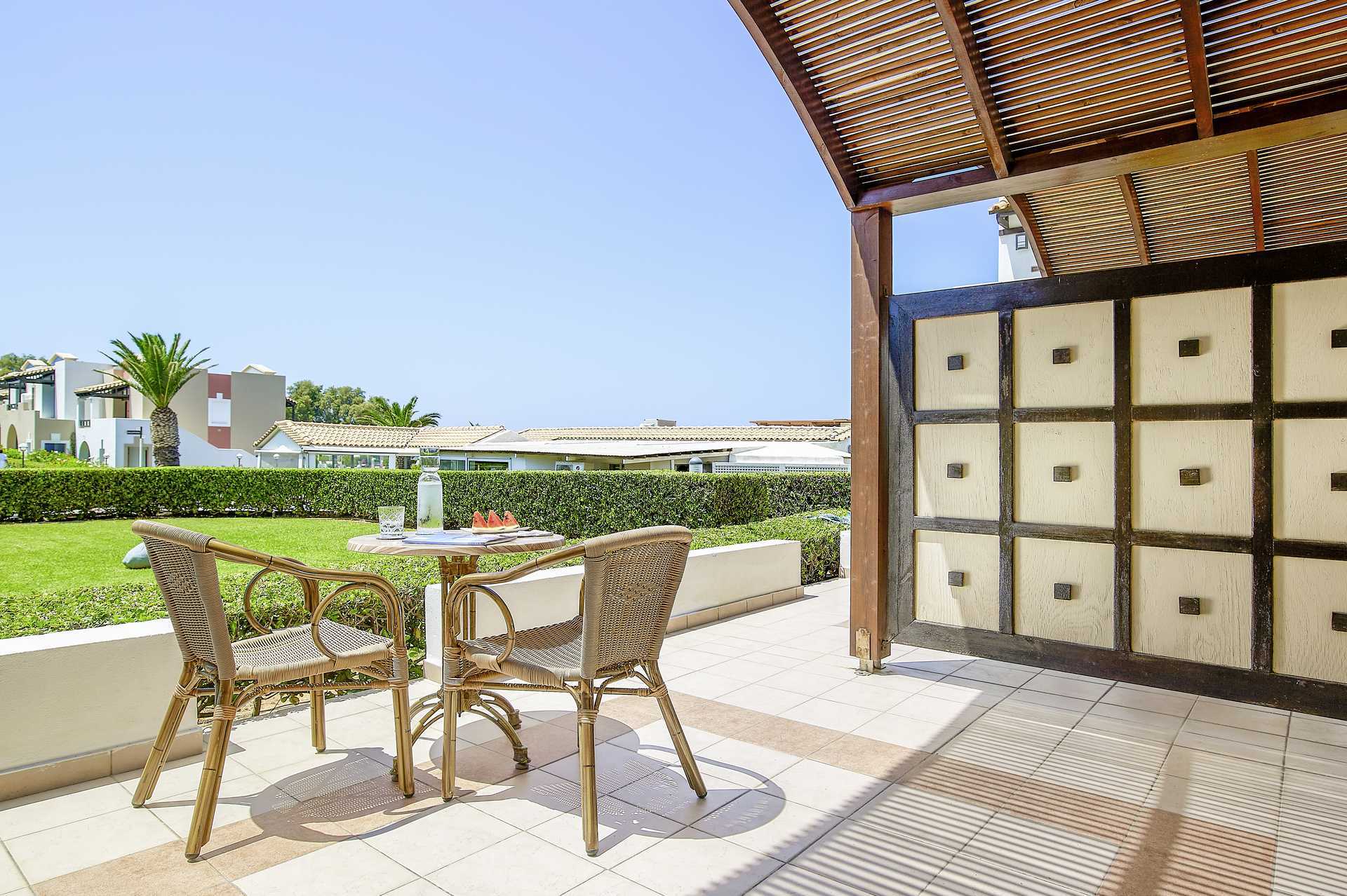 Superiorrom med uteplass som vender mot havet og utgang til delt basseng. Rommene ligger i bygninger nærmest havet. To enkeltsenger. Mulig med en ekstraseng i sovesofa. Wifi, luftkondisjonering og safe inkludert. Kjøleskap. Vannkoker samt kaffe og te. Velkomstpakke med vann og alkoholfri vin ved ankomst. TV. Hårføner. Badekåper, tøfler og basseng- og strandhåndklær. Baderom med dusj og wc. Rengjøring 7 ggr/uke. Barn under 2 år regnes inn i maksantallet i rommet.