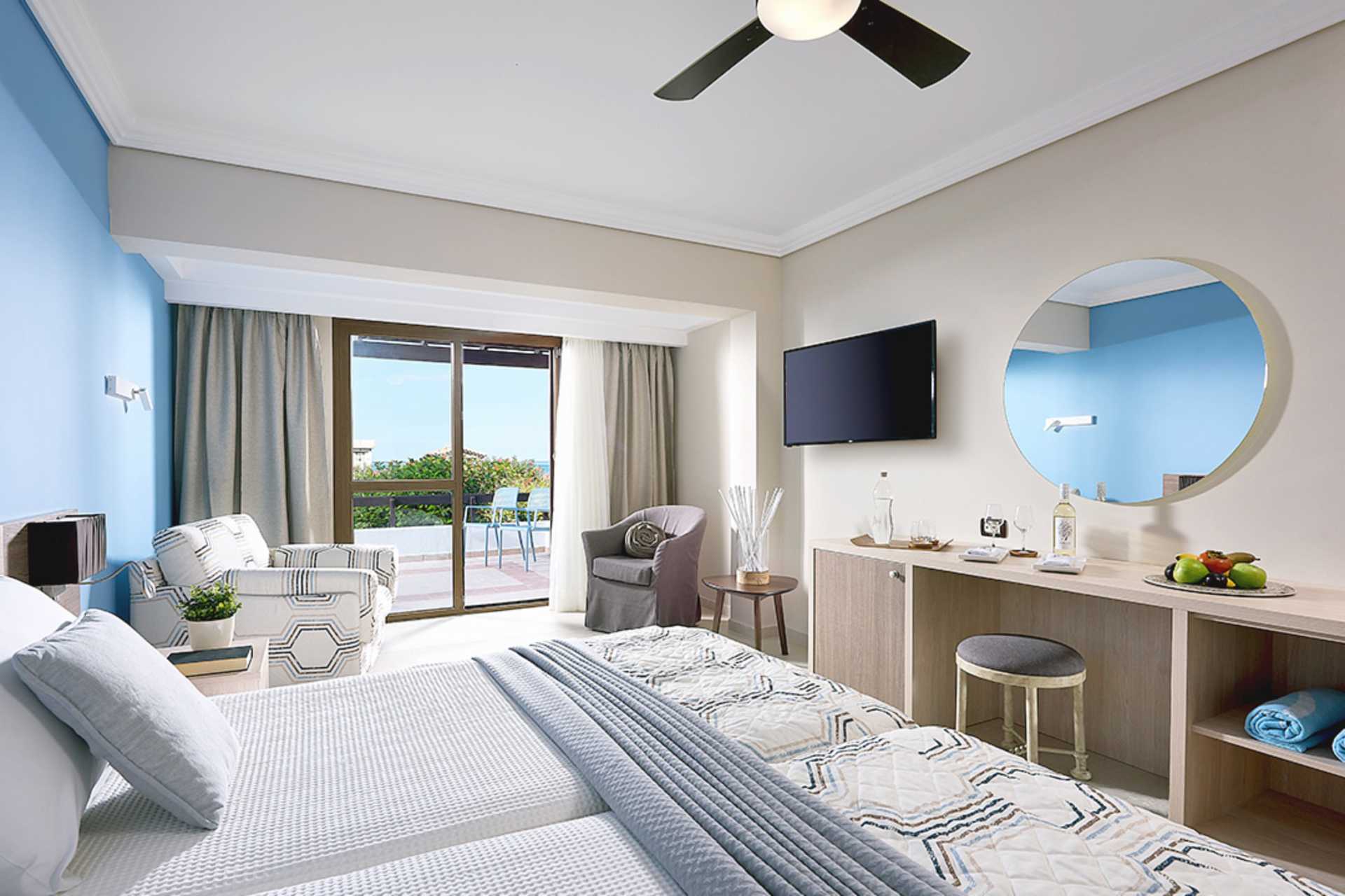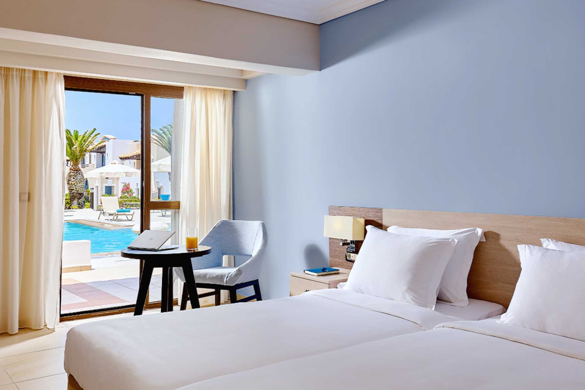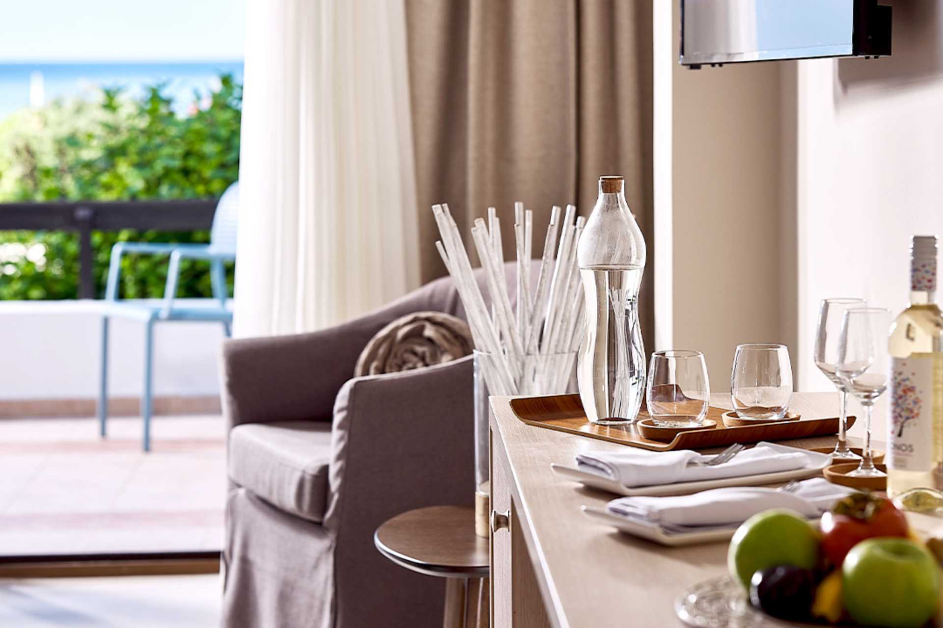 Superiorrom med uteplass som vender mot havet og utgang til delt basseng. Rommene ligger i bygninger nærmest havet. To enkeltsenger. Mulig med en ekstraseng i sovesofa. Wifi, luftkondisjonering og safe inkludert. Kjøleskap. Vannkoker samt kaffe og te. Velkomstpakke med vann og alkoholfri vin ved ankomst. TV. Hårføner. Badekåper, tøfler og basseng- og strandhåndklær. Baderom med dusj og wc. Rengjøring 7 ggr/uke. Barn under 2 år regnes inn i maksantallet i rommet.