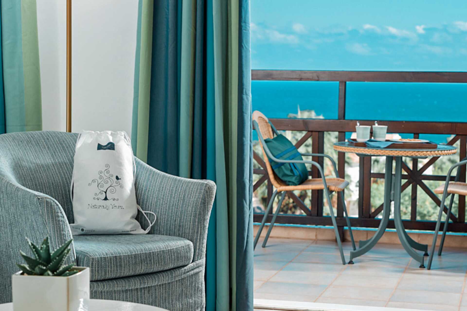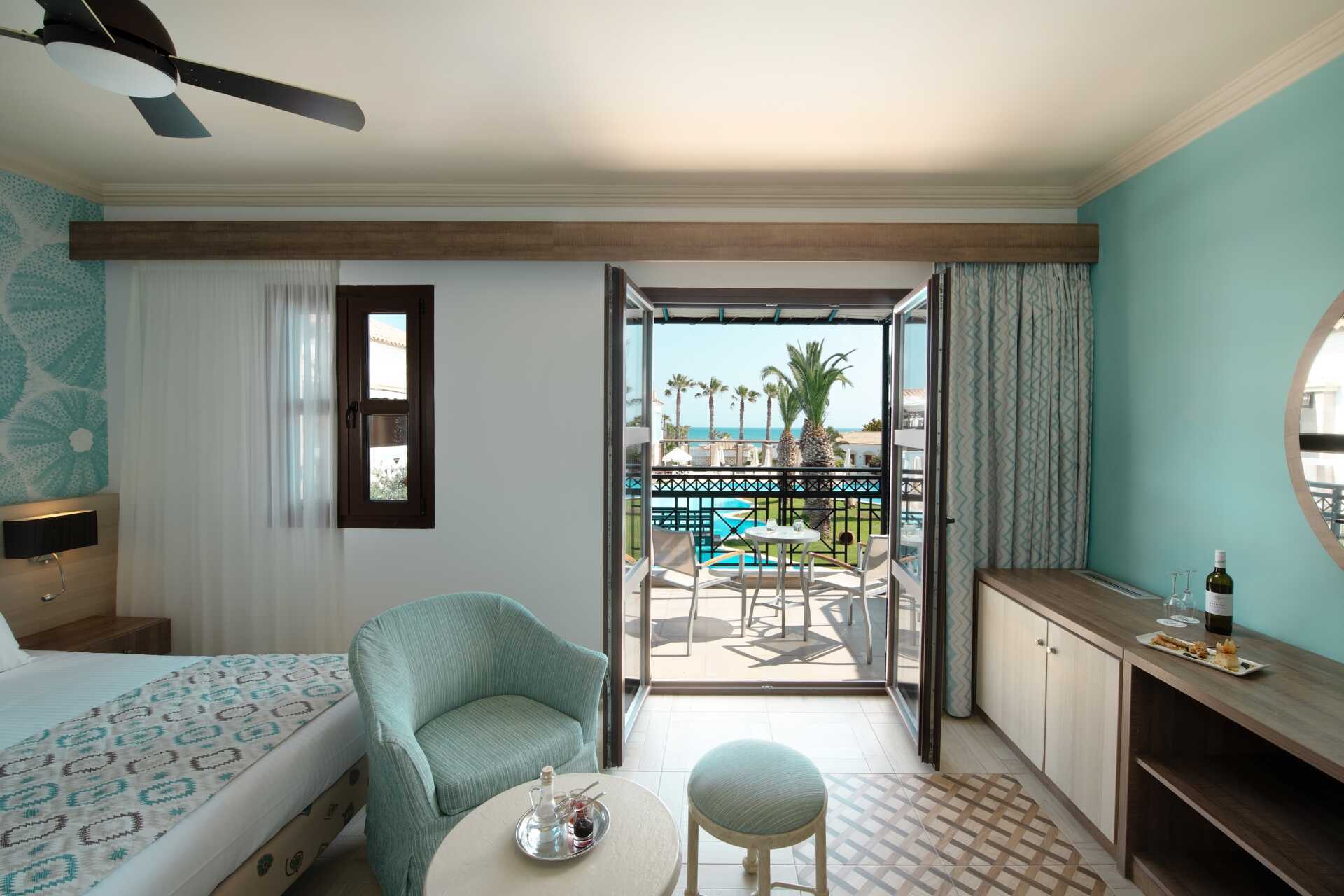 Dobbeltrom med balkong eller terrasse, noen med havutsikt eller begrenset havutsikt. En dobbeltseng eller to enkeltsenger. Mulig med ekstraseng i sovesofa. Wifi, luftkondisjonering og safe er inkludert. Minibar, en flaske vin er inkludert ved ankomst og brus som fylles på hver dag. Vannkoker samt kaffe og te. TV. Badekåper og tøfler. Hårføner. Badekar eller dusj samt wc. Rengjøring 7 ggr/uke. Barn under 2 år regnes inn i maksantallet i rommet.