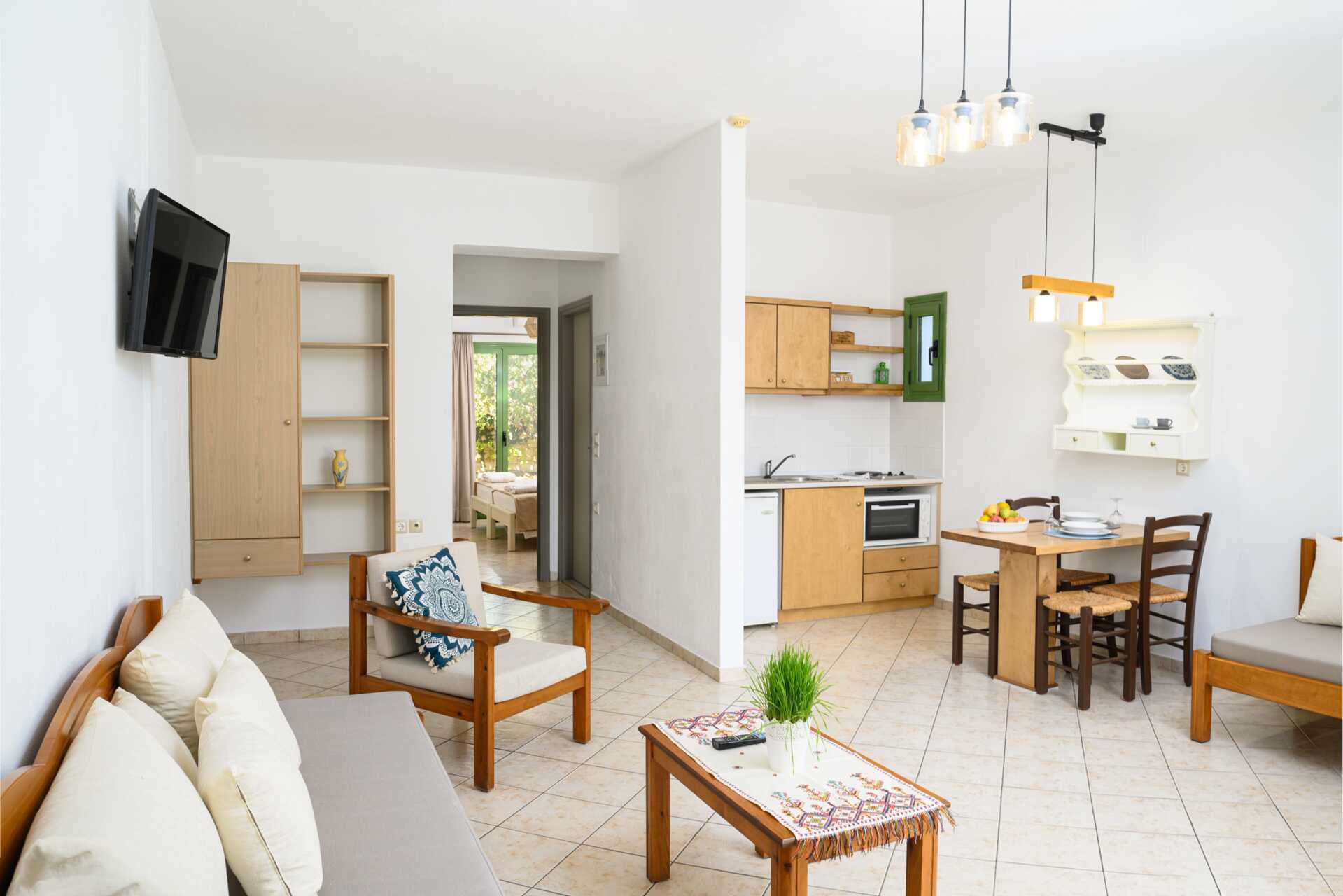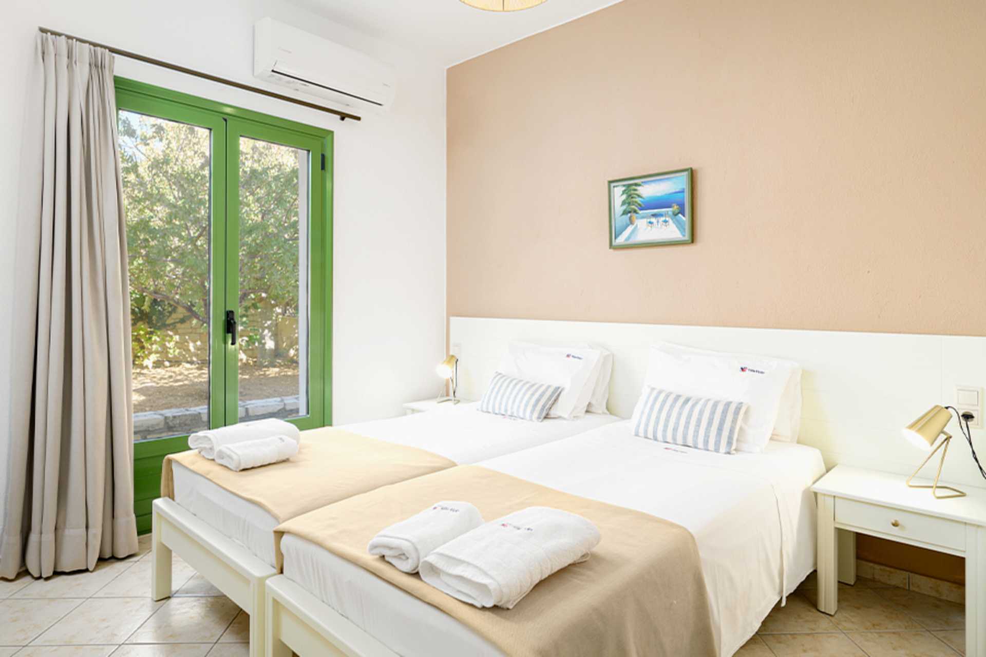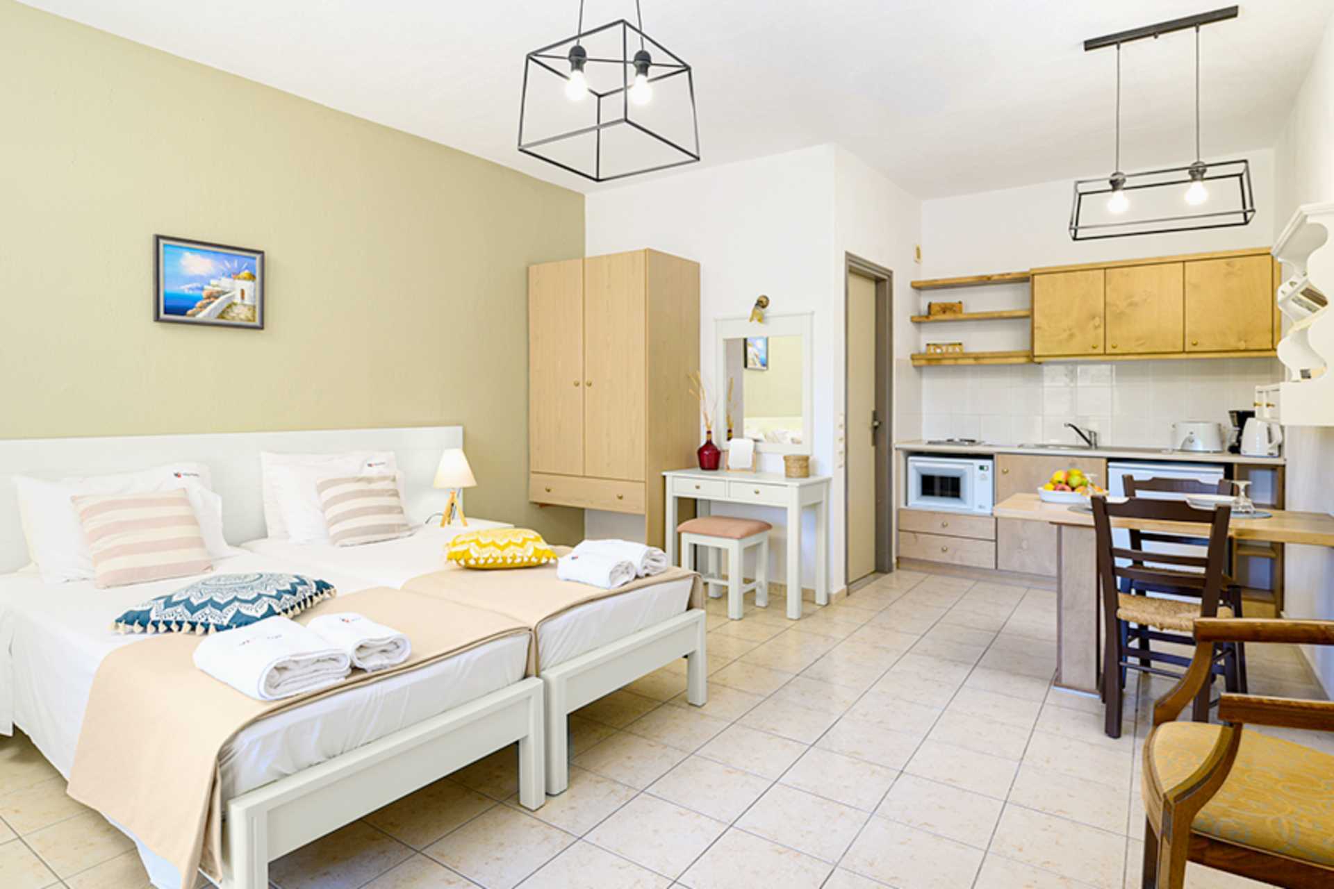 Toromsleilighet av varierende størrelse med balkong eller markterrasse. Et soverom og en stue med minikjøkken. To enkeltsenger. Mulig med ekstrasenger i sovesofa. Minikjøkken med kokeplater, kjøleskap, vannkoker, kaffetrakter, brødrister og enkelt kjøkkenutstyr. Wifi og safe inkludert. Luftkondisjonering mot avgift. Hårføner. Baderom med dusj og wc. Rengjøring 6 ggr/uke.