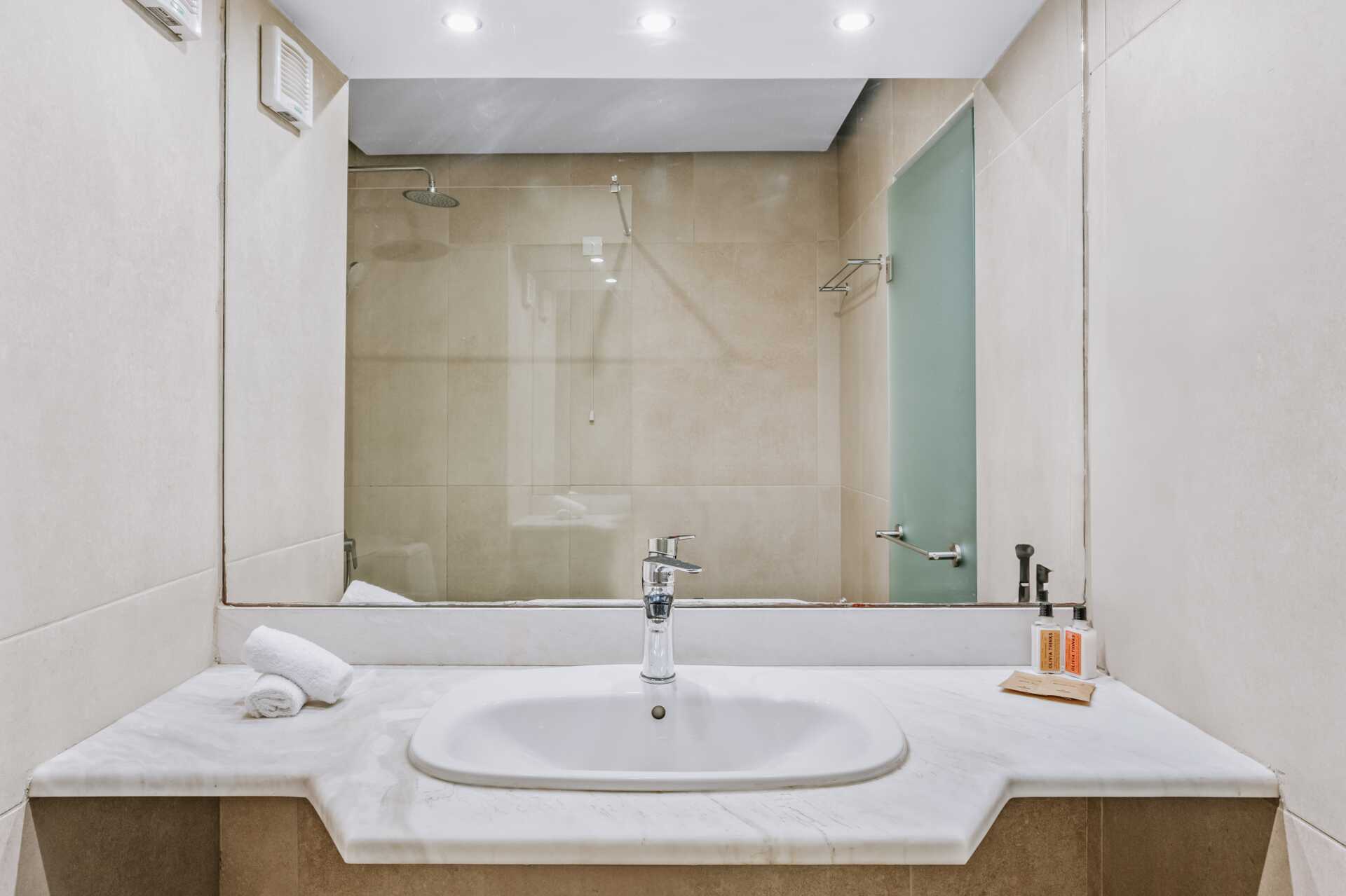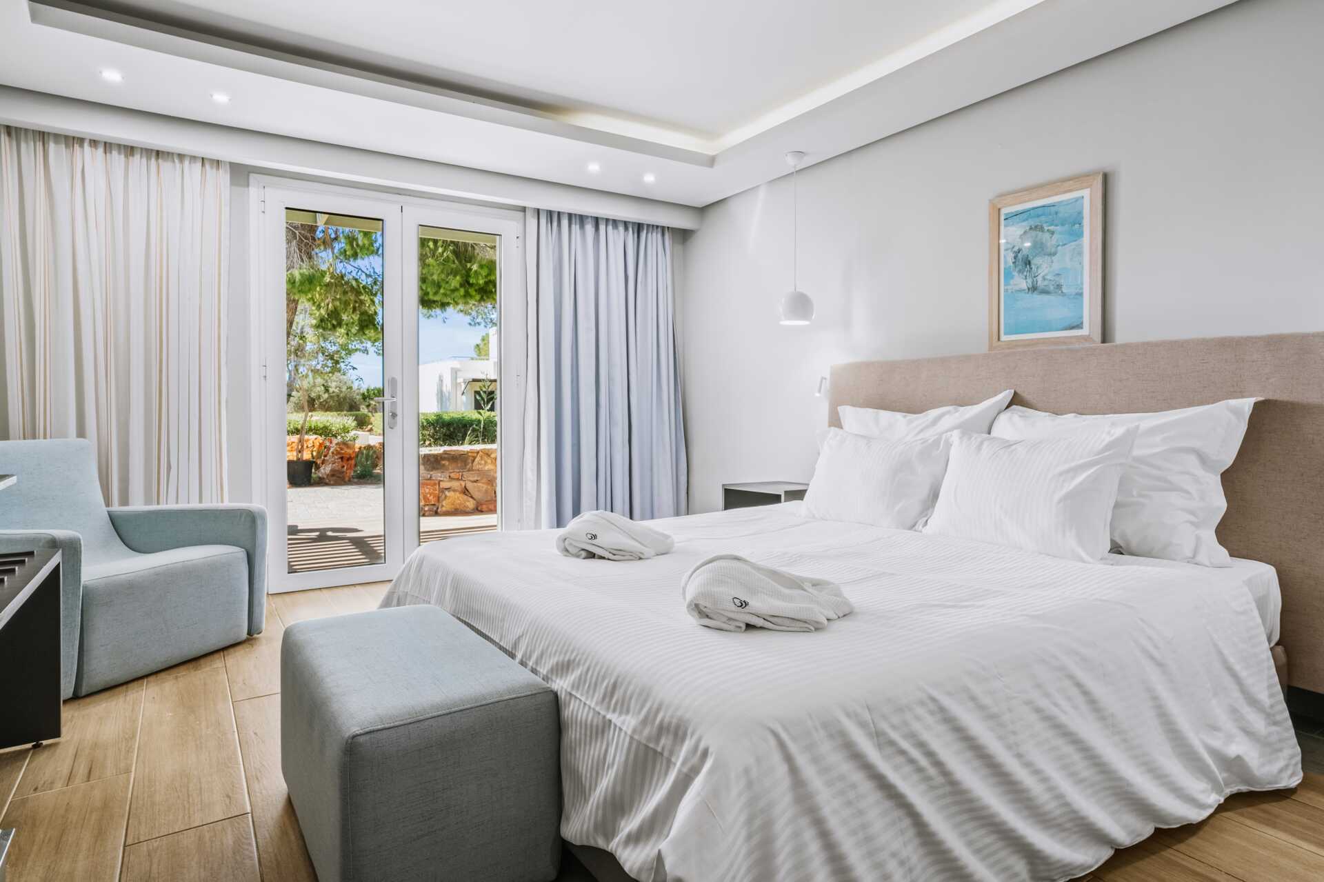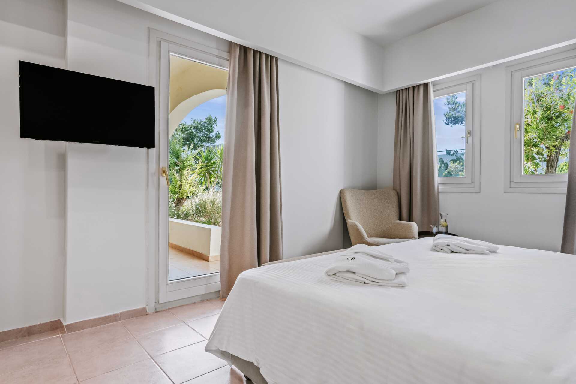 Familierom med markterrasse. To enkeltsenger. Mulig med ekstraseng i sovesofa. Wifi, luftkondisjonering og safe inkludert. Kjøleskap. Vannkoker samt kaffe og te. TV. Badekar eller dusj samt wc. Hårføner. Rengjøring 7 ggr/uke.